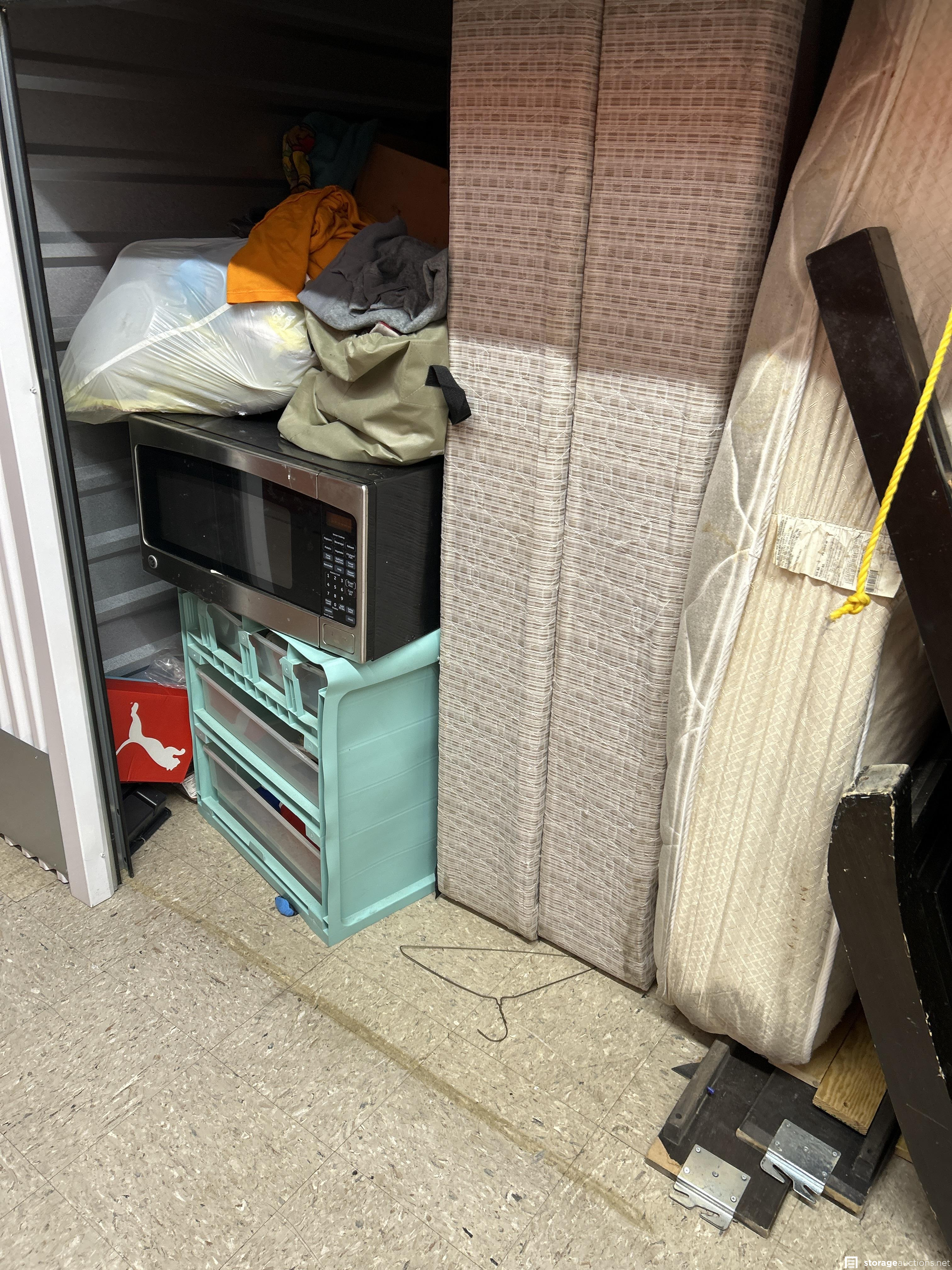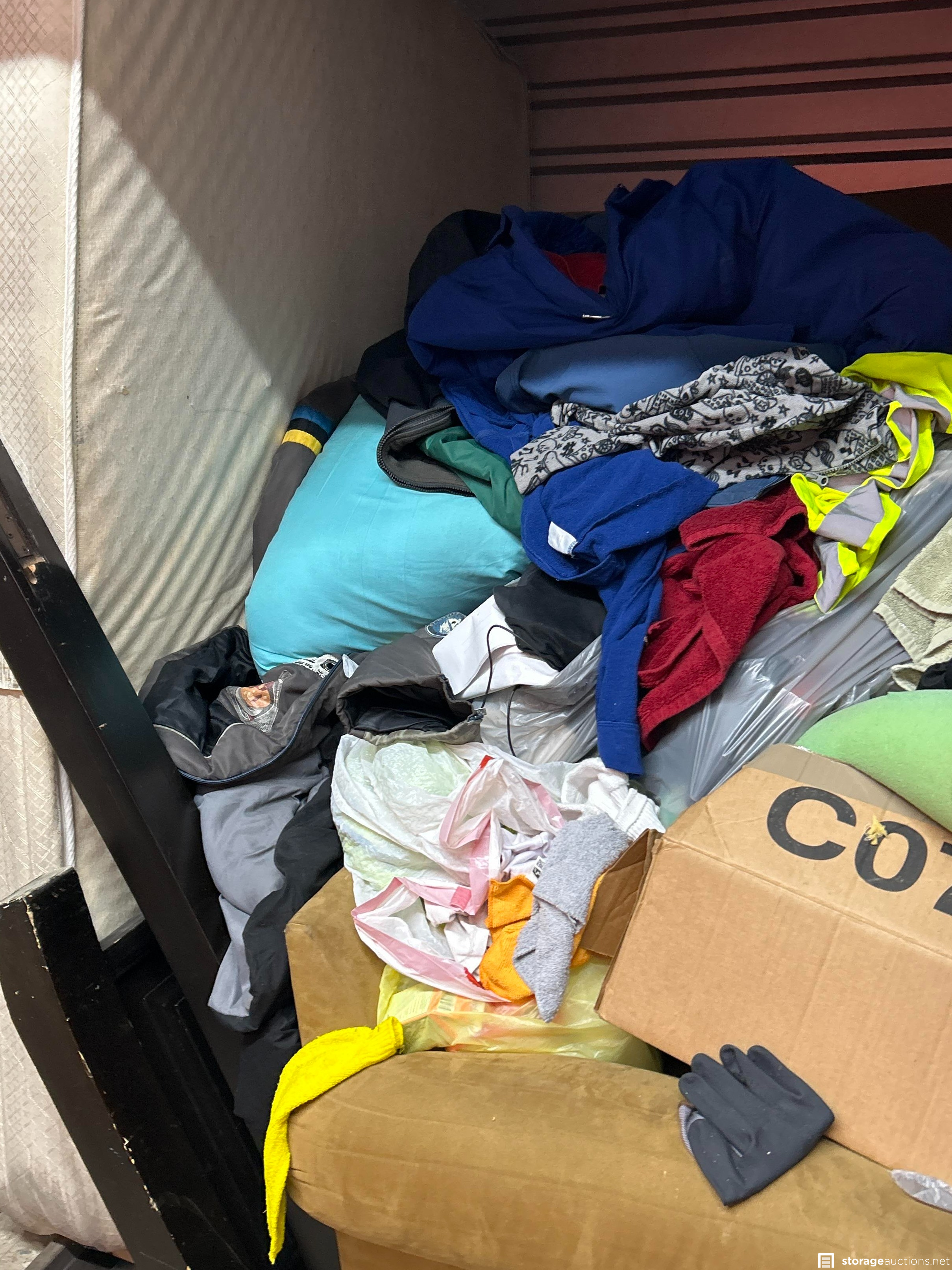 This unit has mattress, microwave, bags, bed frame, couch, clothes