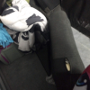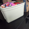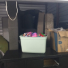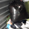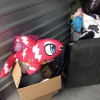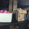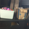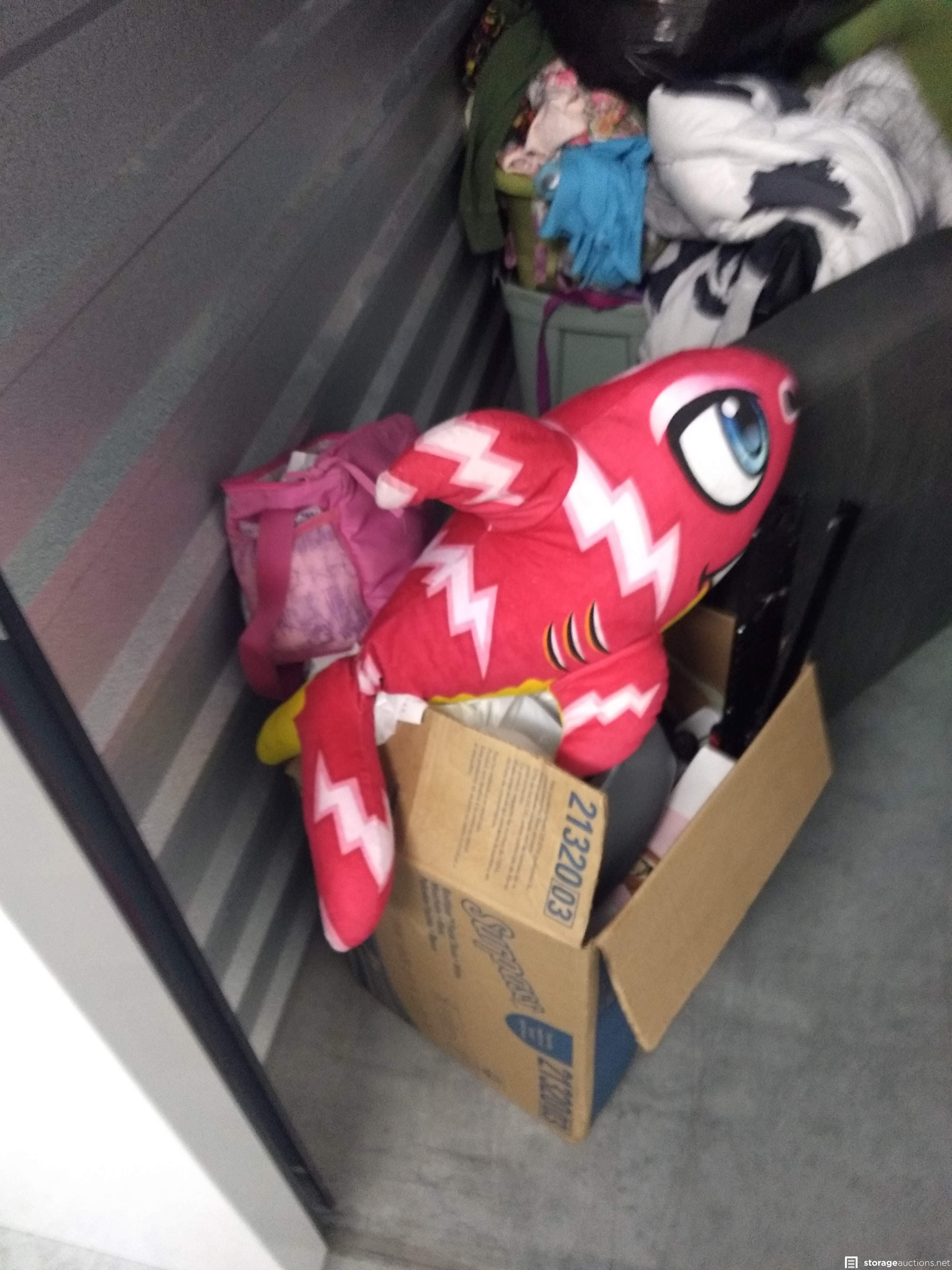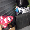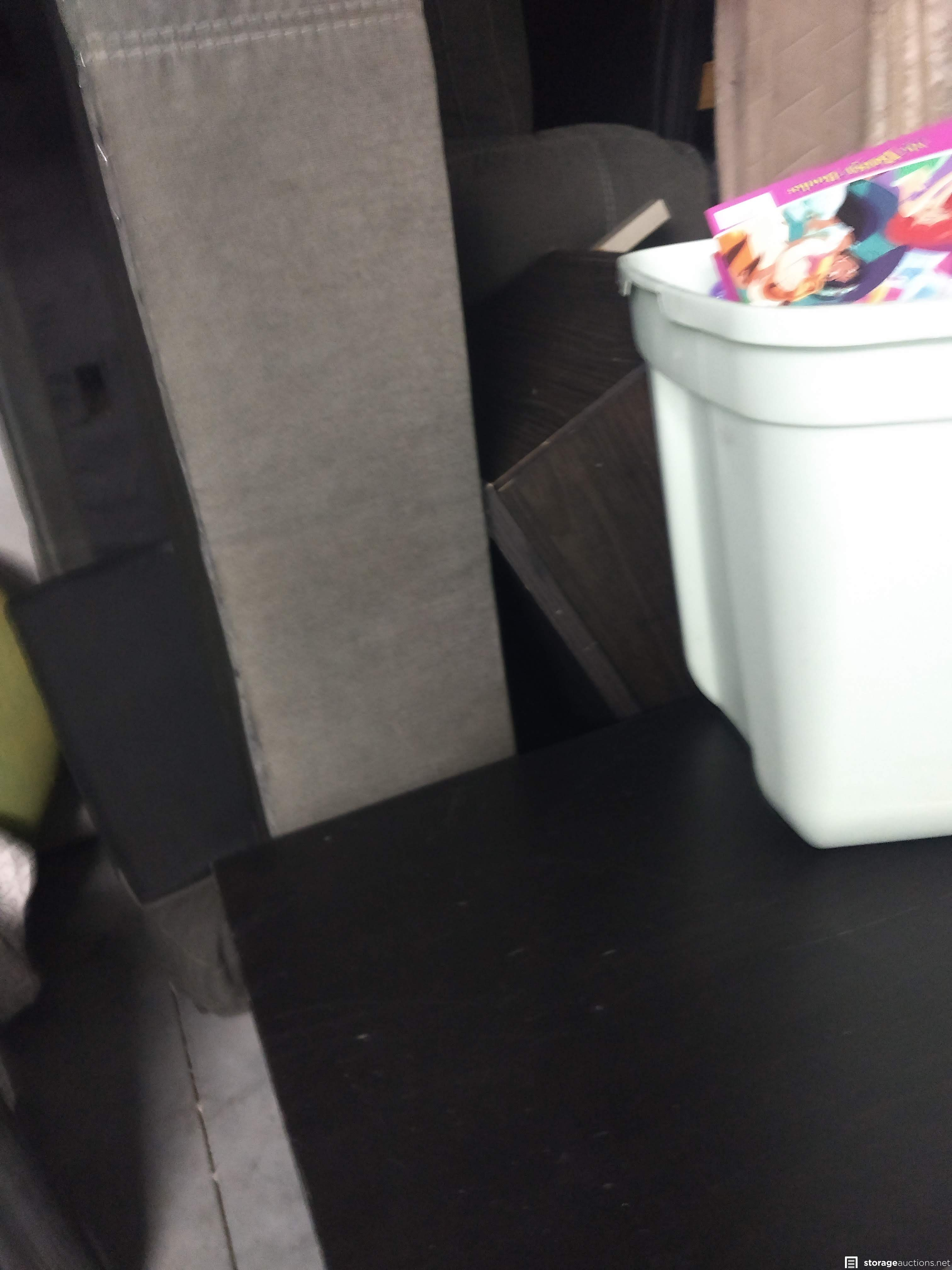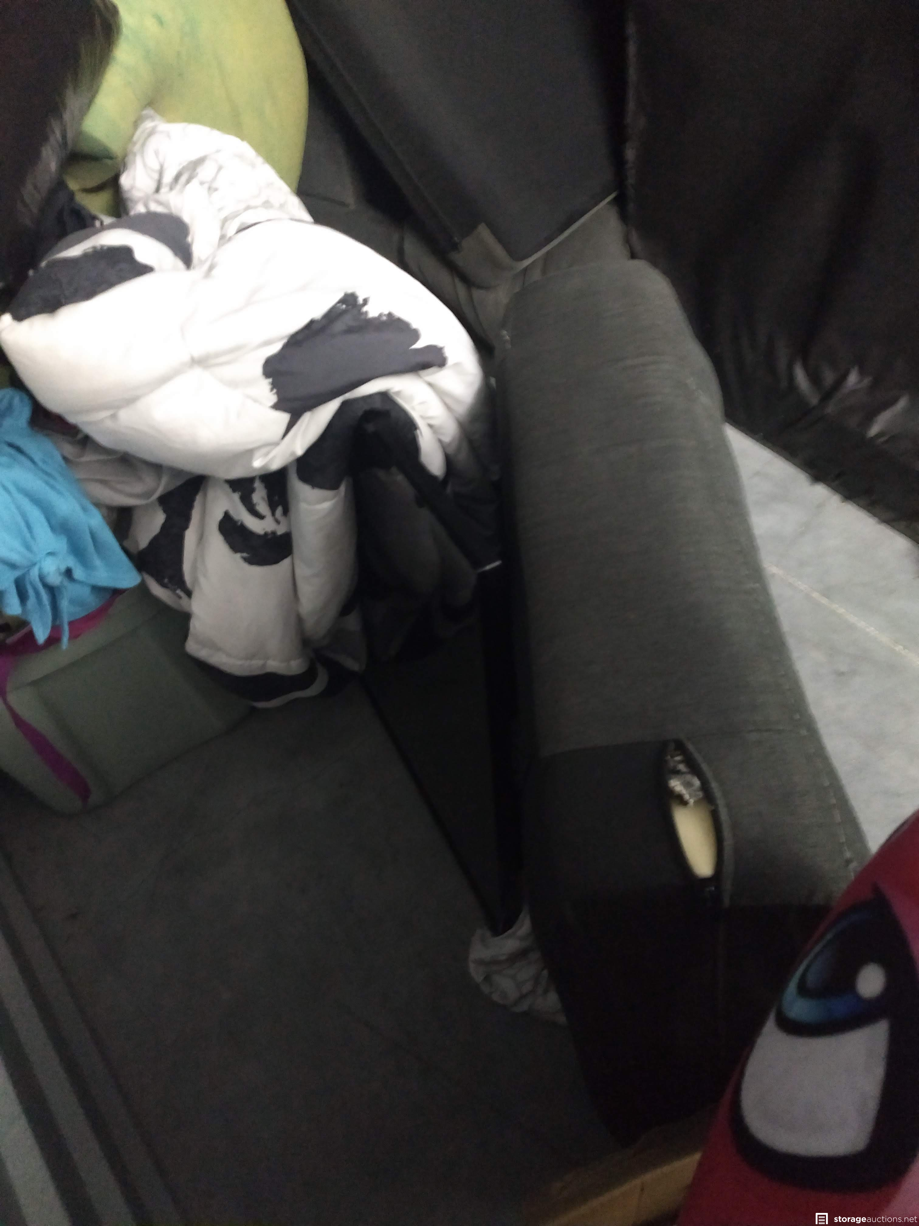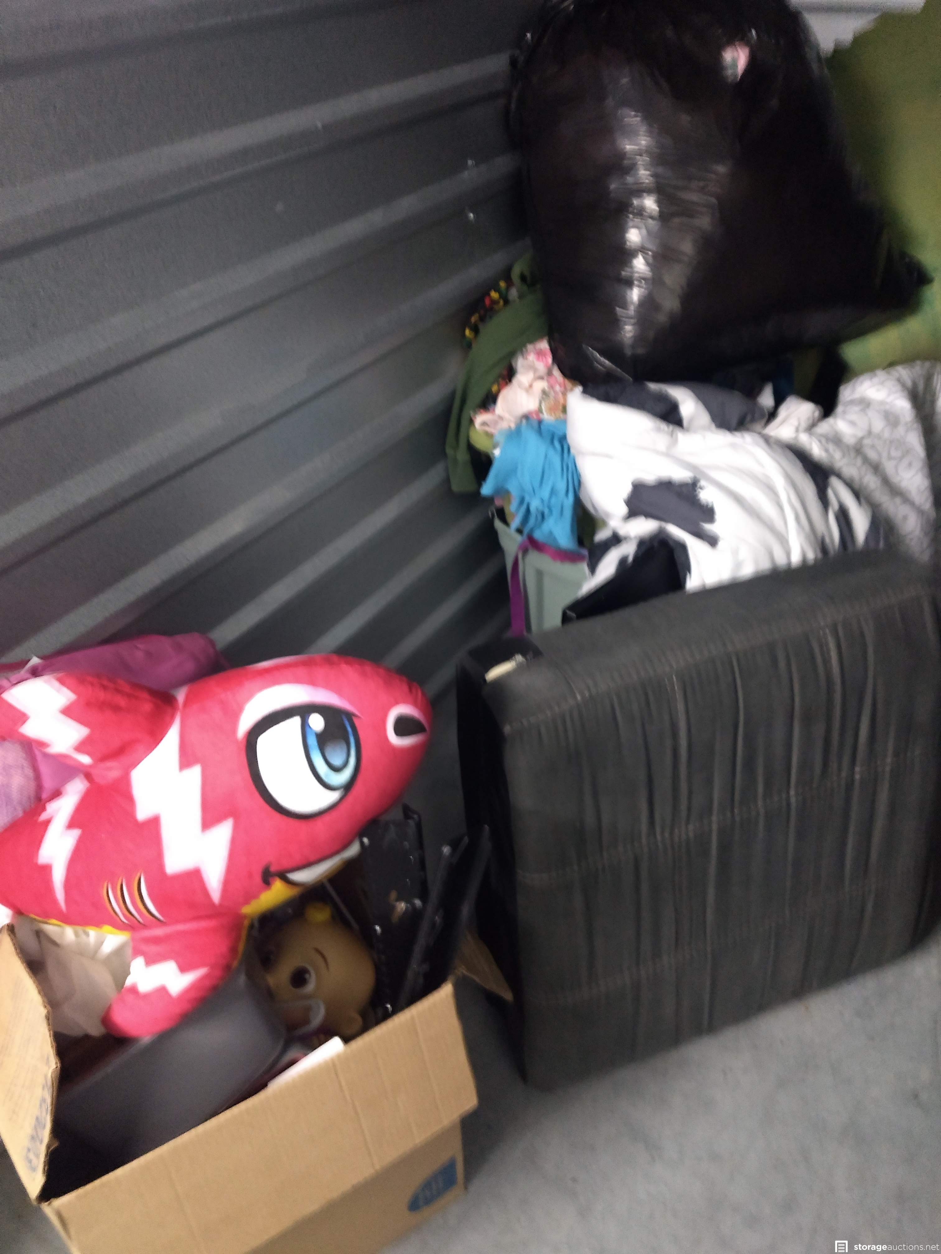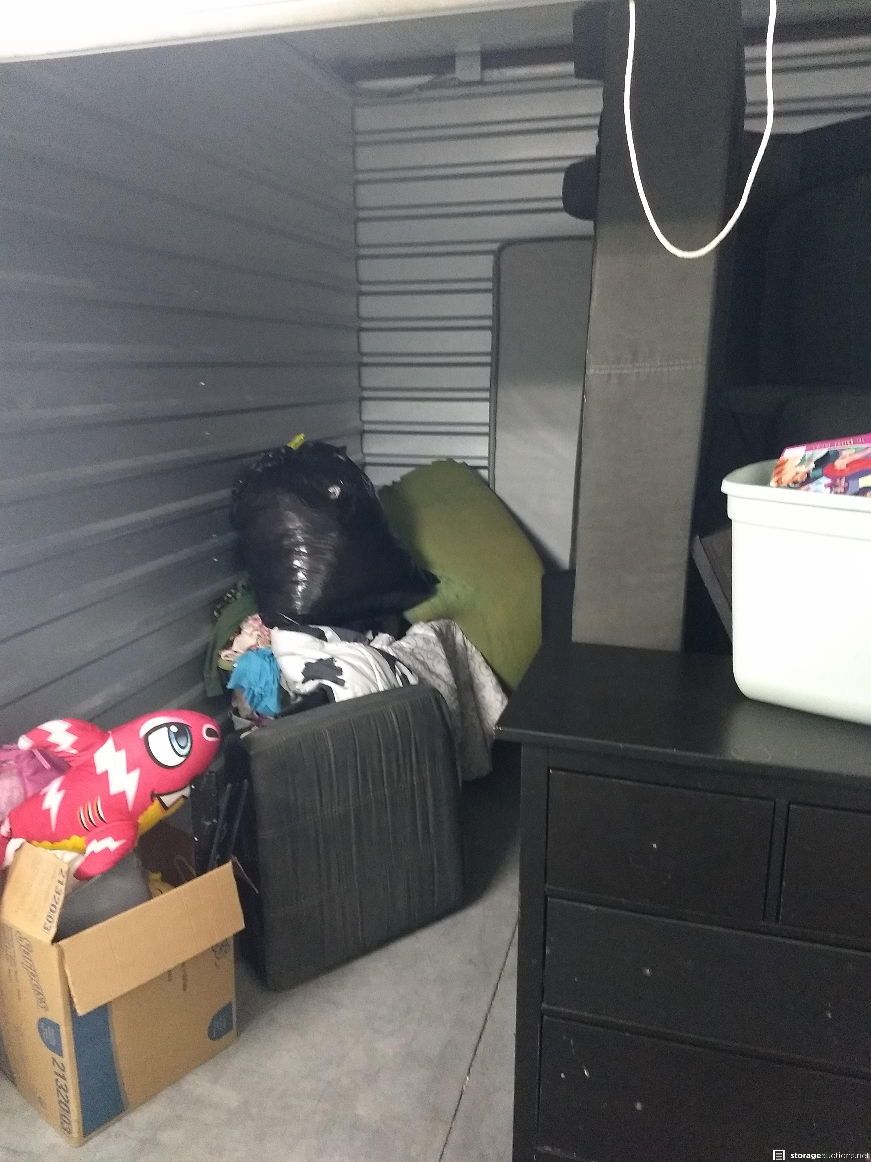 Dresser, Sectional couch, bed frame, toys, side table, bags, bedding, 2 mattresses, clothes, tv and totes
