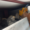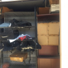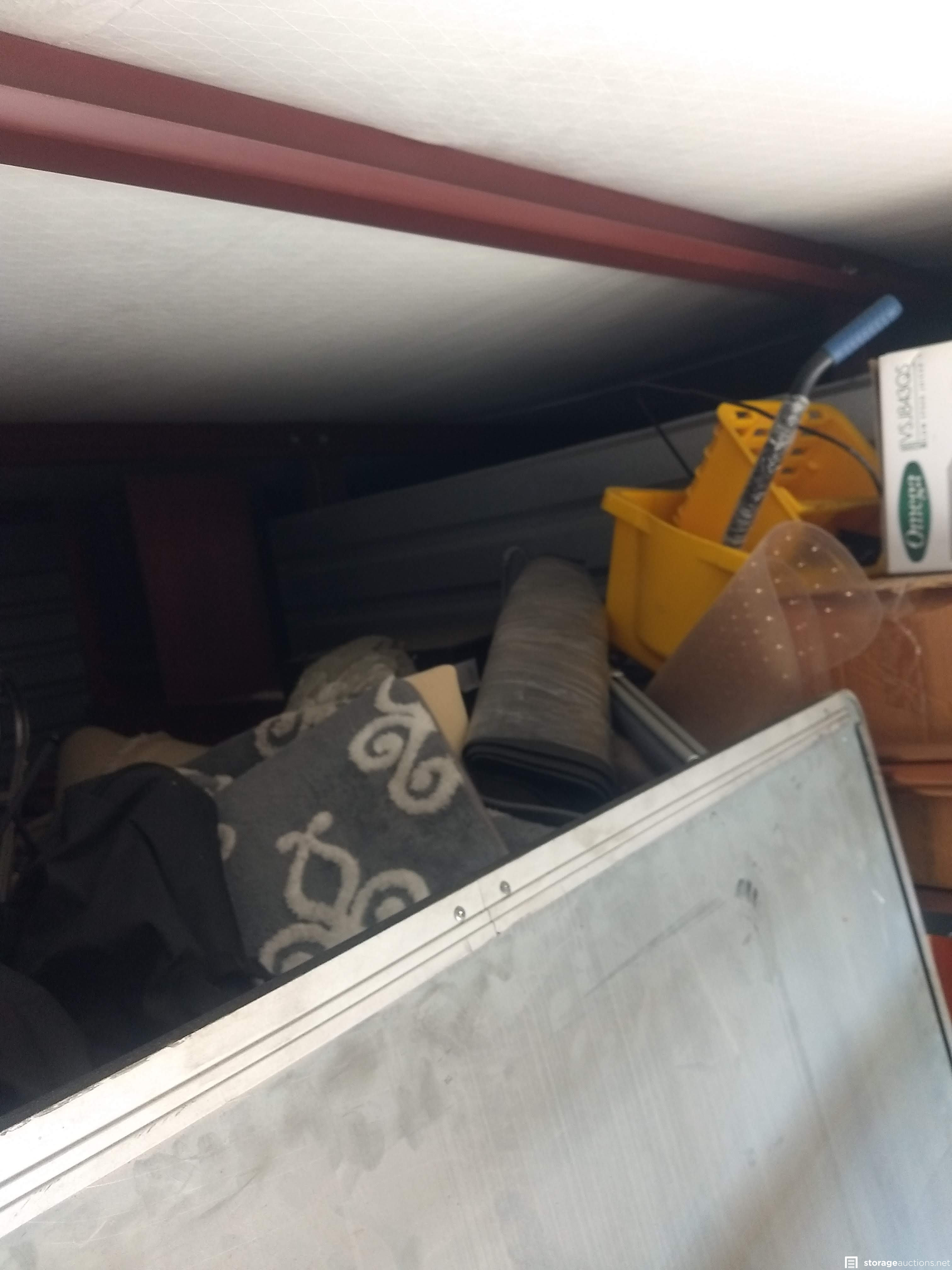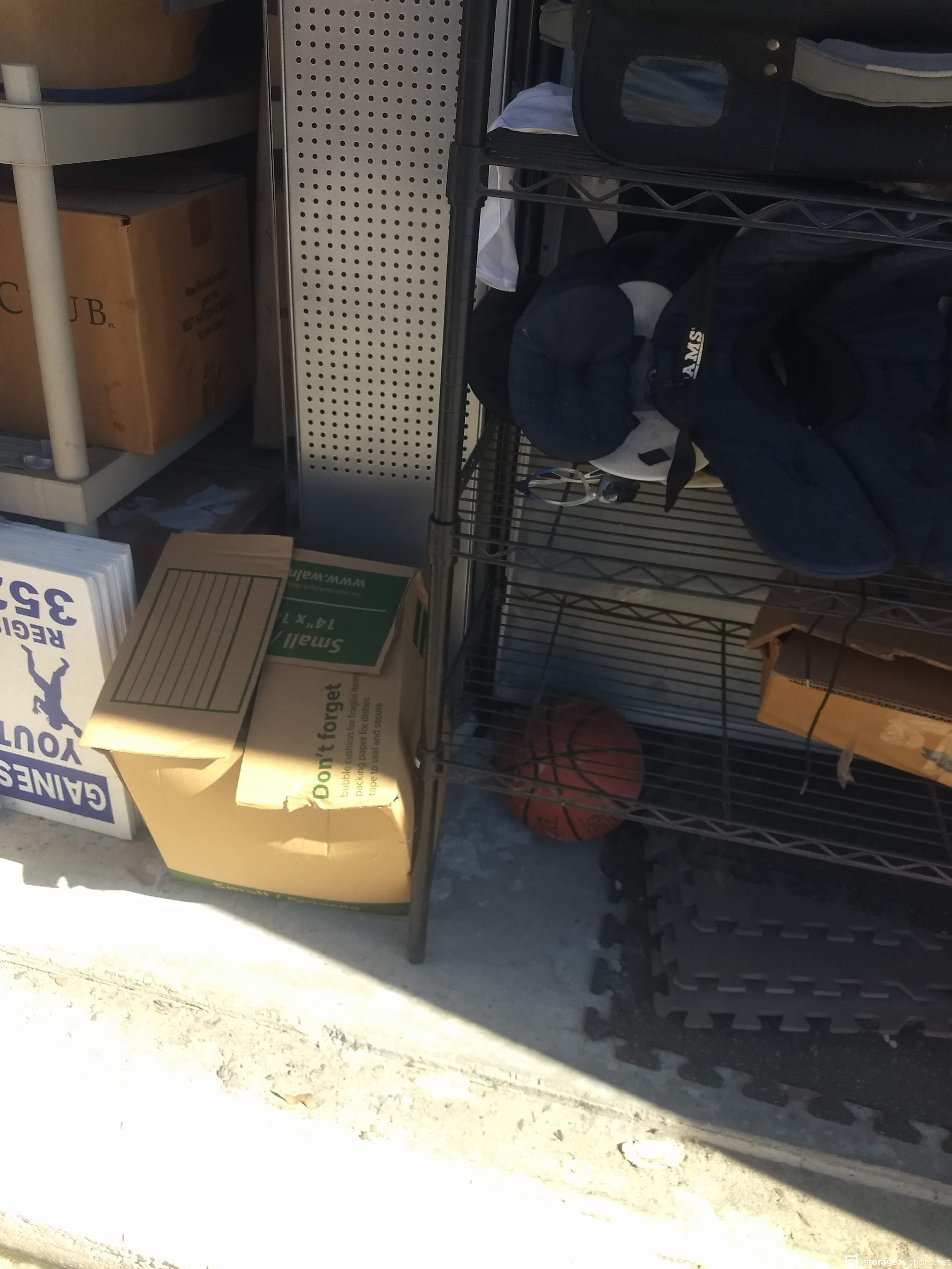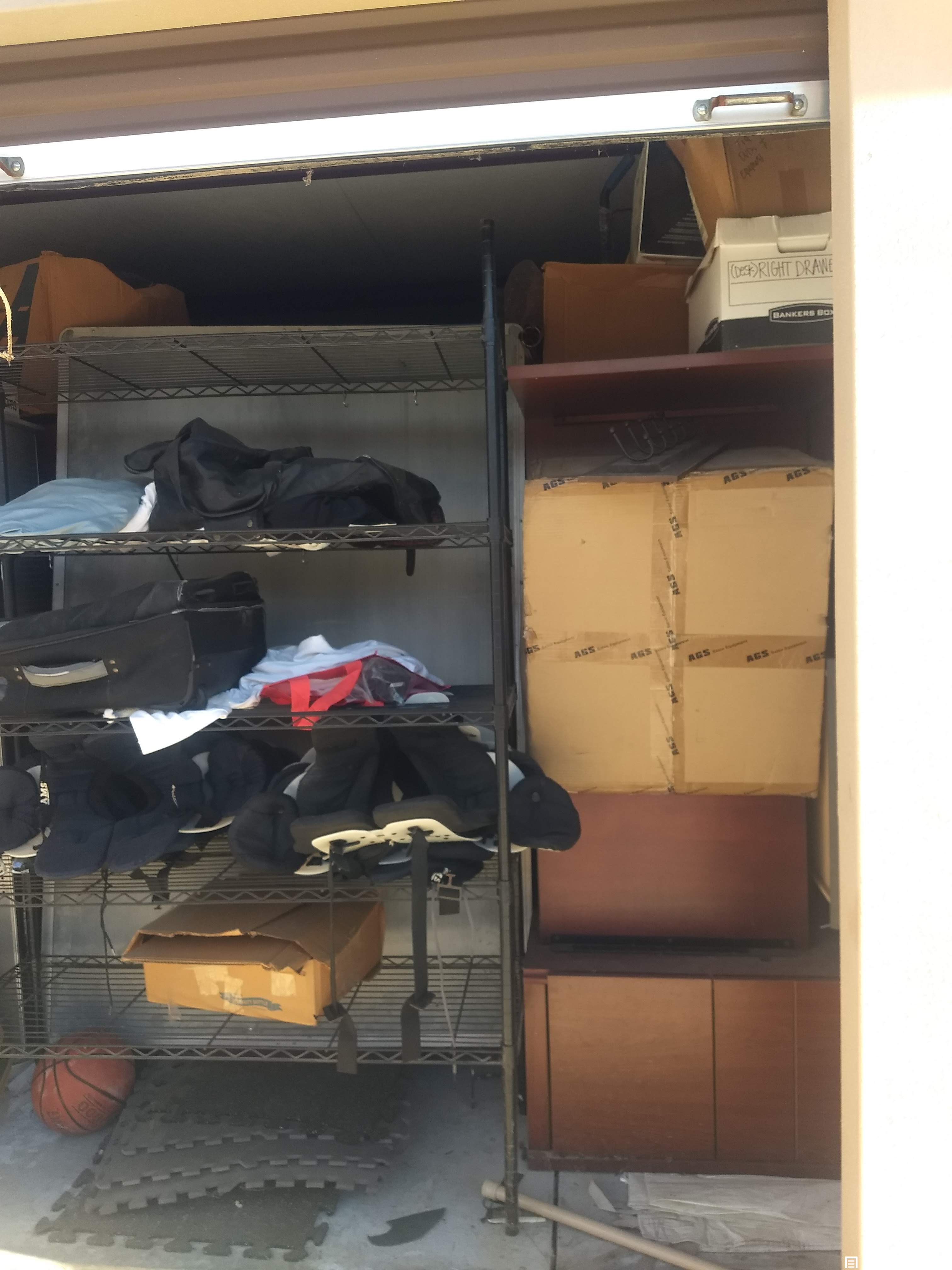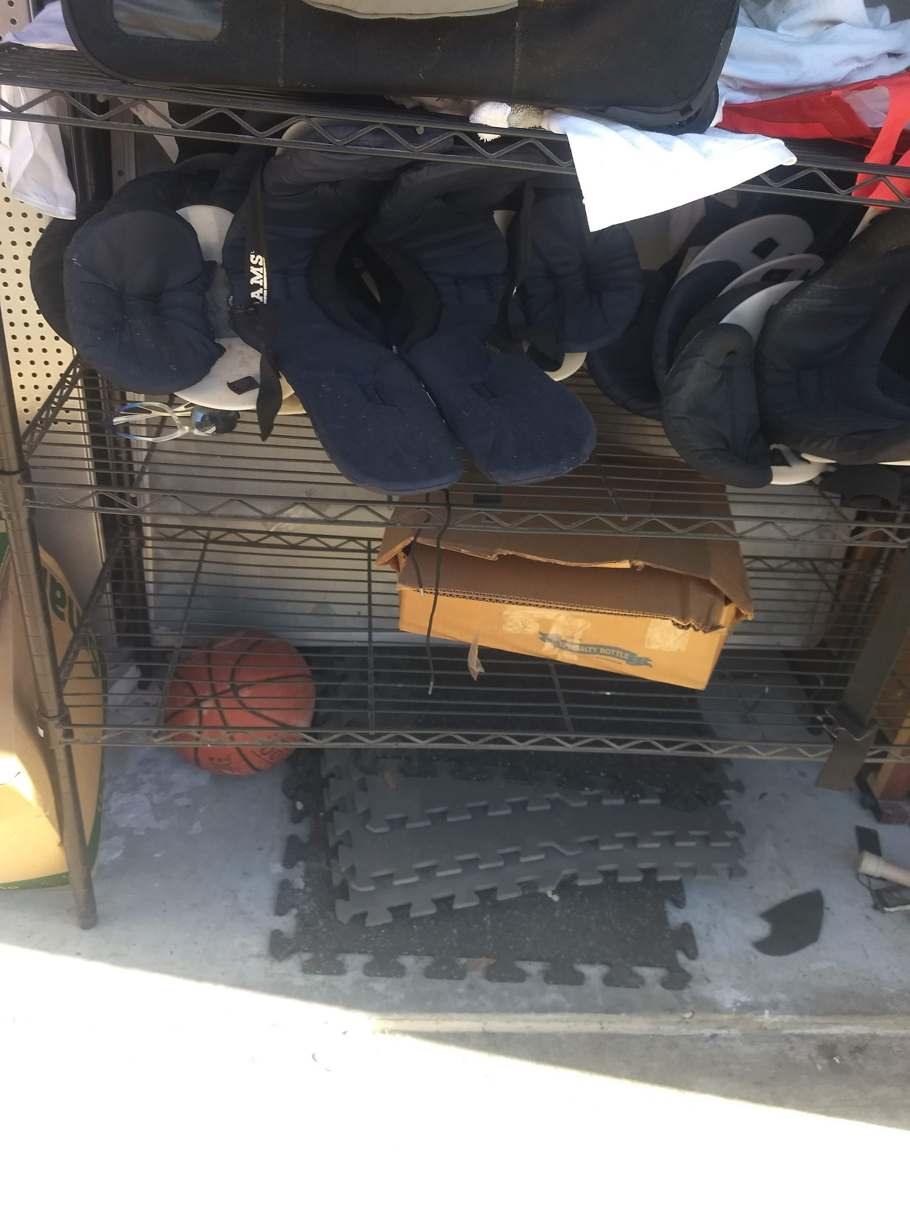 Football equipment, table, display shelf, plastic rack, basketball HOOP, workout mats, boxes, sandbag, rug, table pictures, mop bucket, filing cabinet and tarps