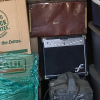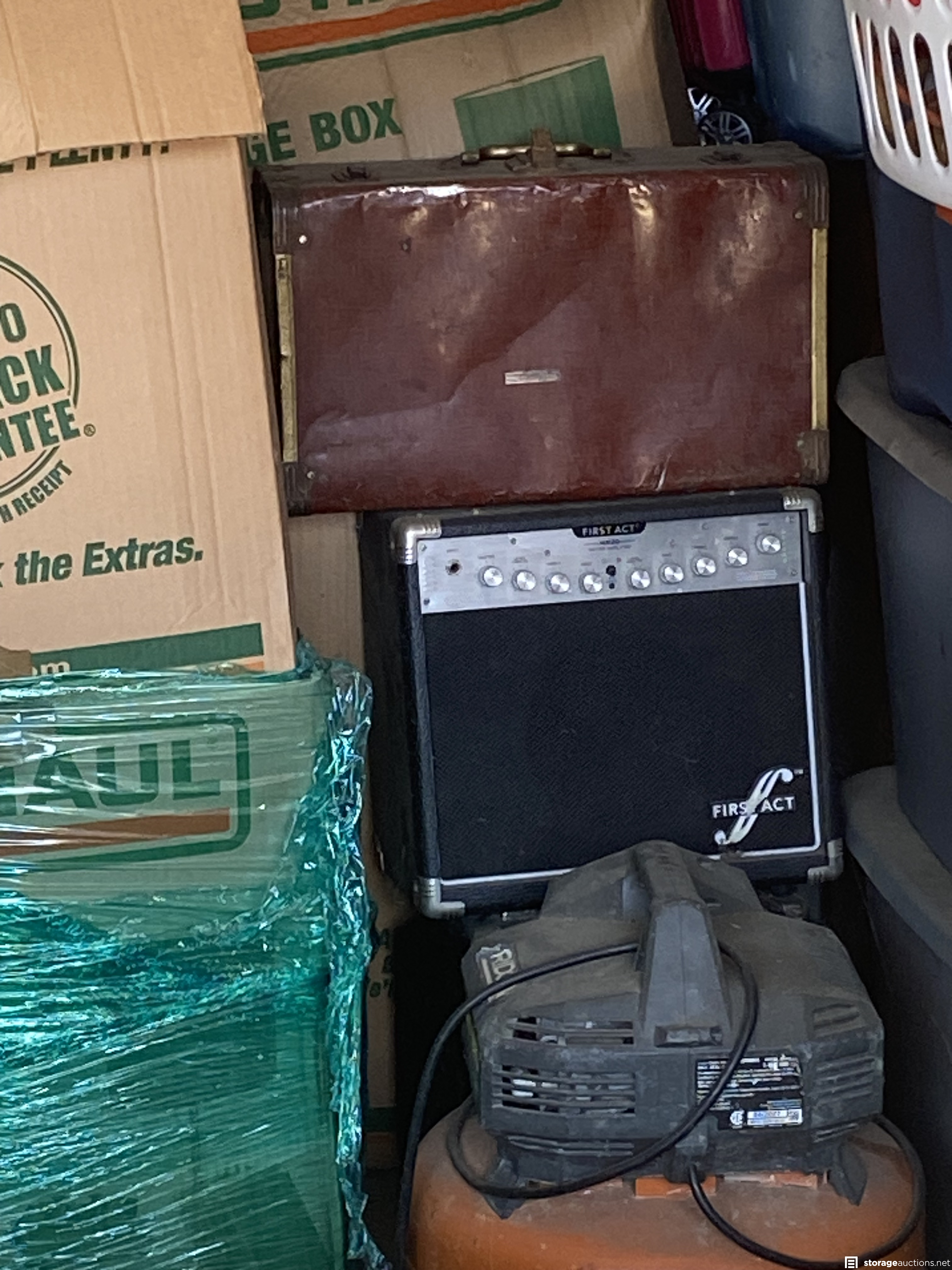 Instrument case, amplifiers, air compressor, suitcases, coffee table totes boxes