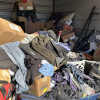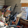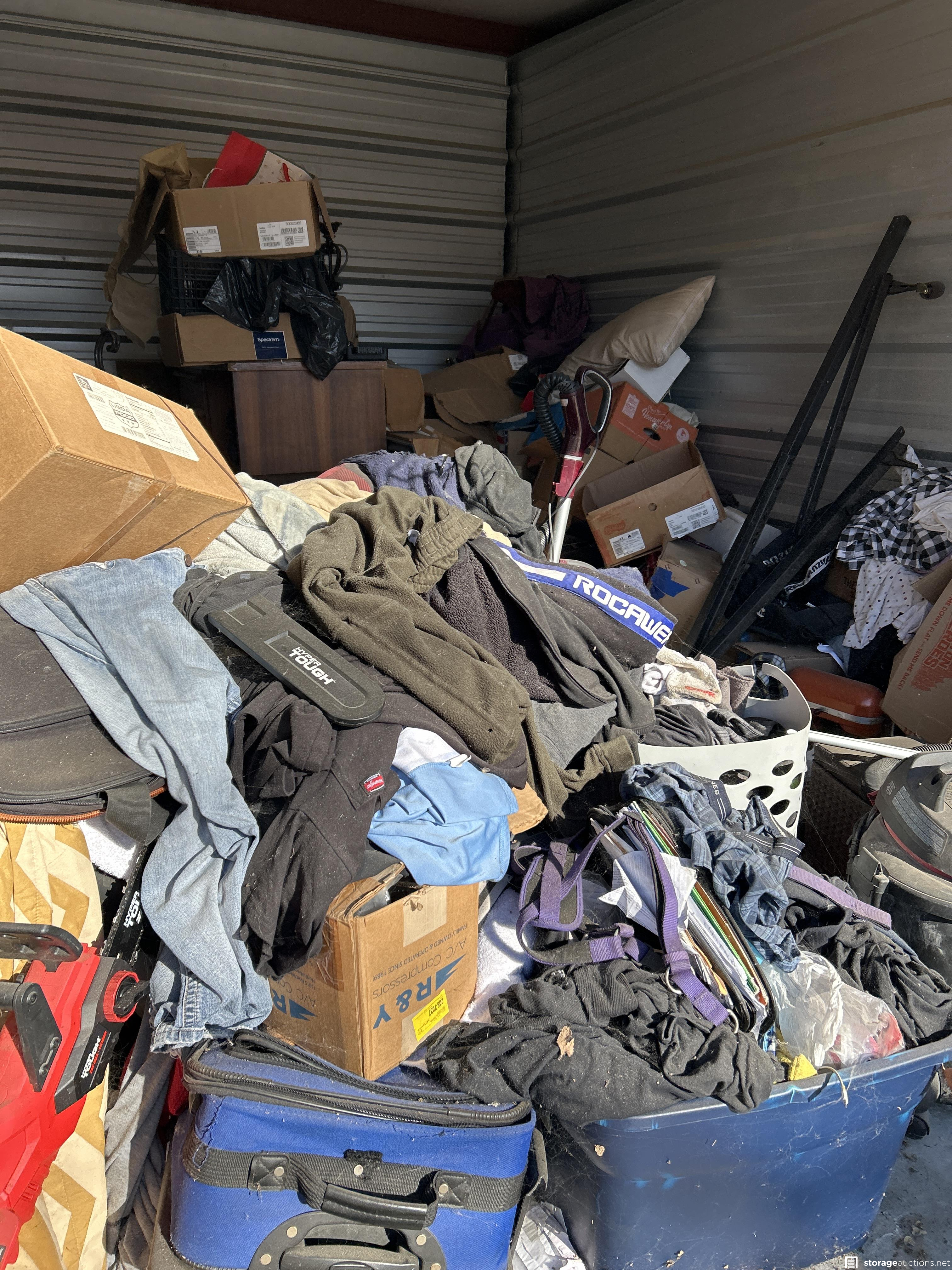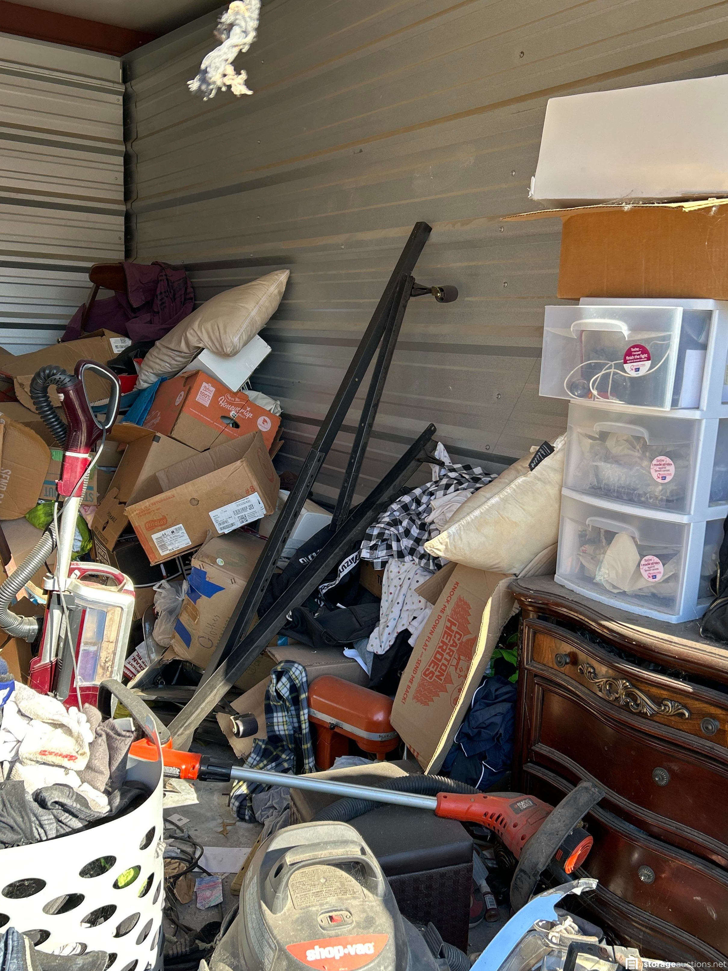 This unit has clothes, suitcase, bed frame, vacuum, boxes, dresser, shop vac