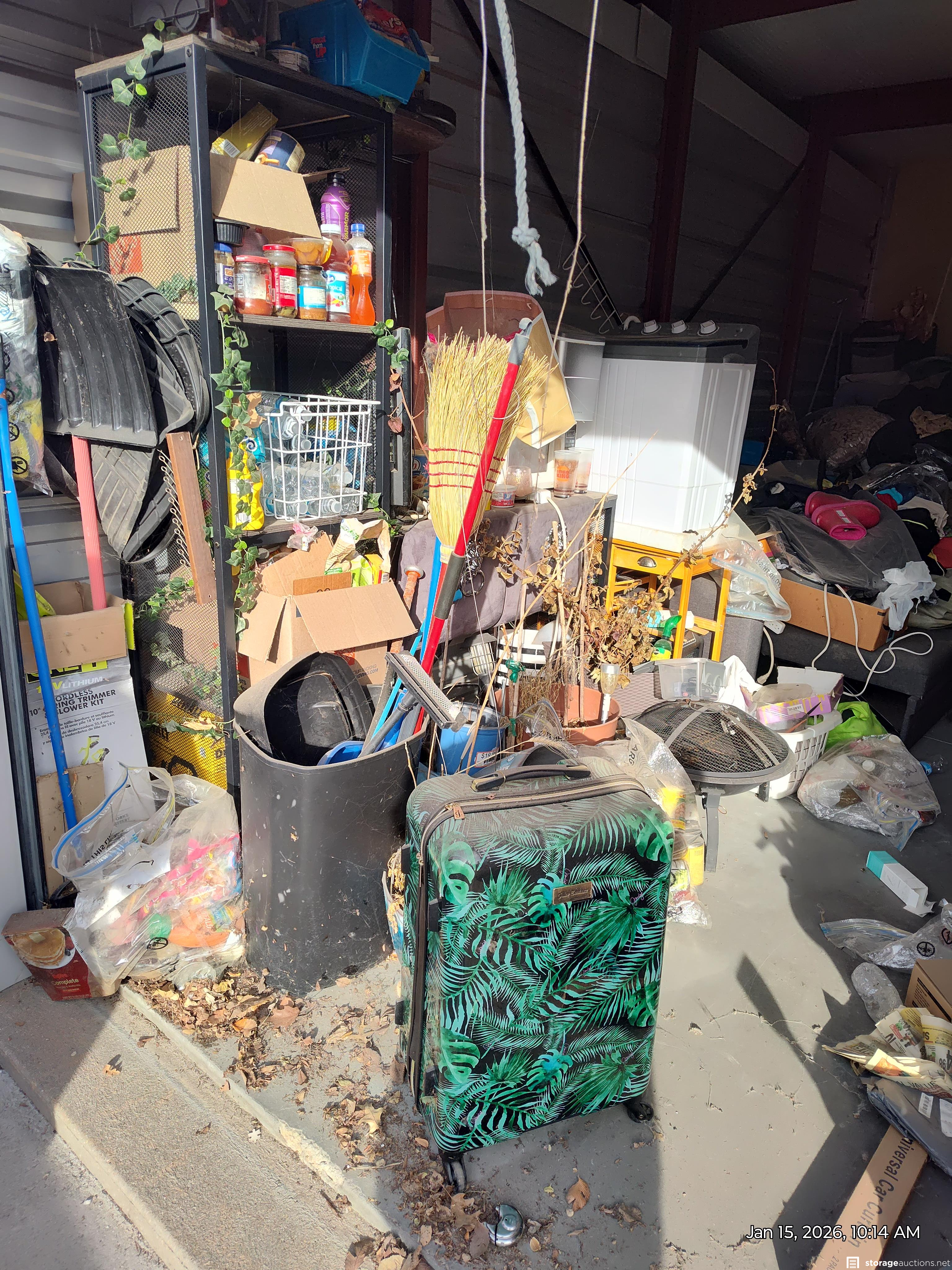 This unit has shelves, suitcase, firepit, boxes, totes