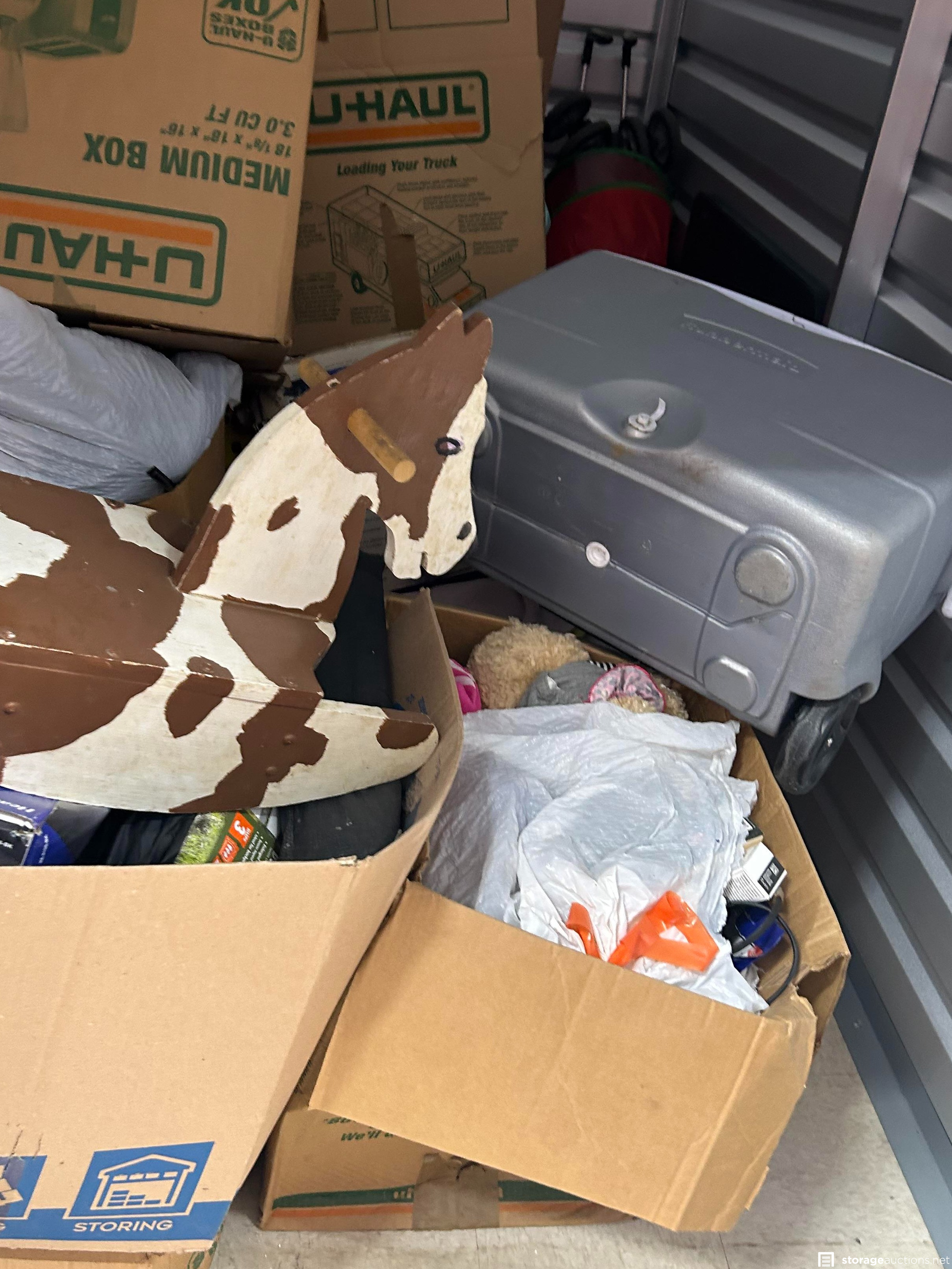This unit has boxes, cooler, rocking horse