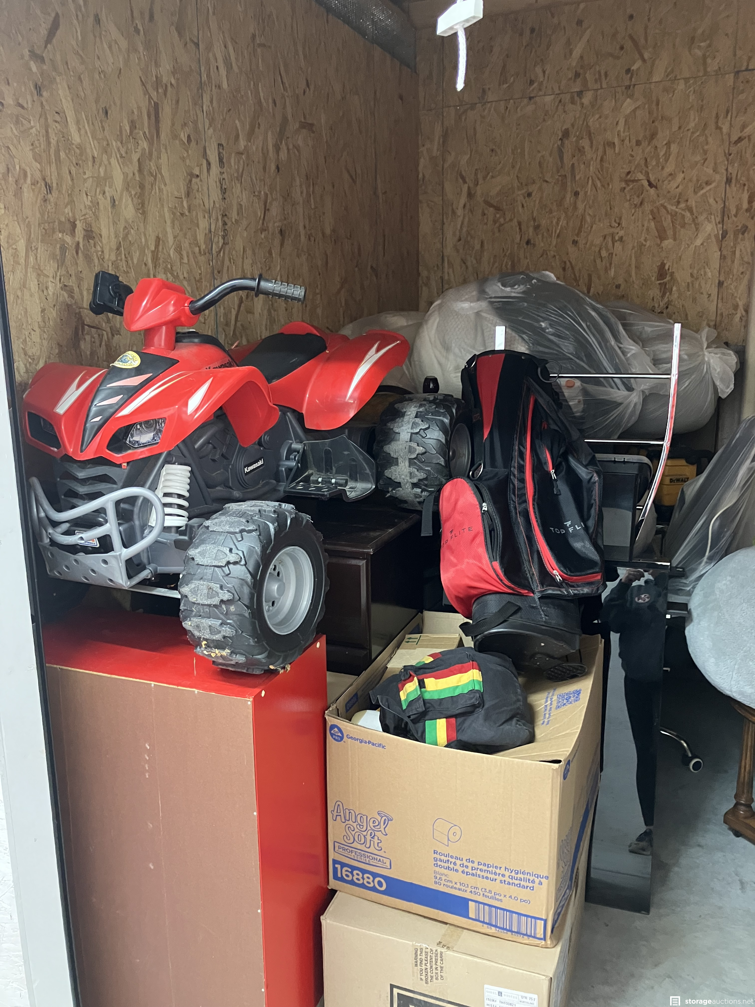 unit has multiple unopened boxes, Kids toy ATV, desk, chair, mattress and box spring, 2 lamps, side table, shelf piece, large globe, stuffed animals, games, bags of clothes