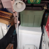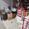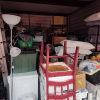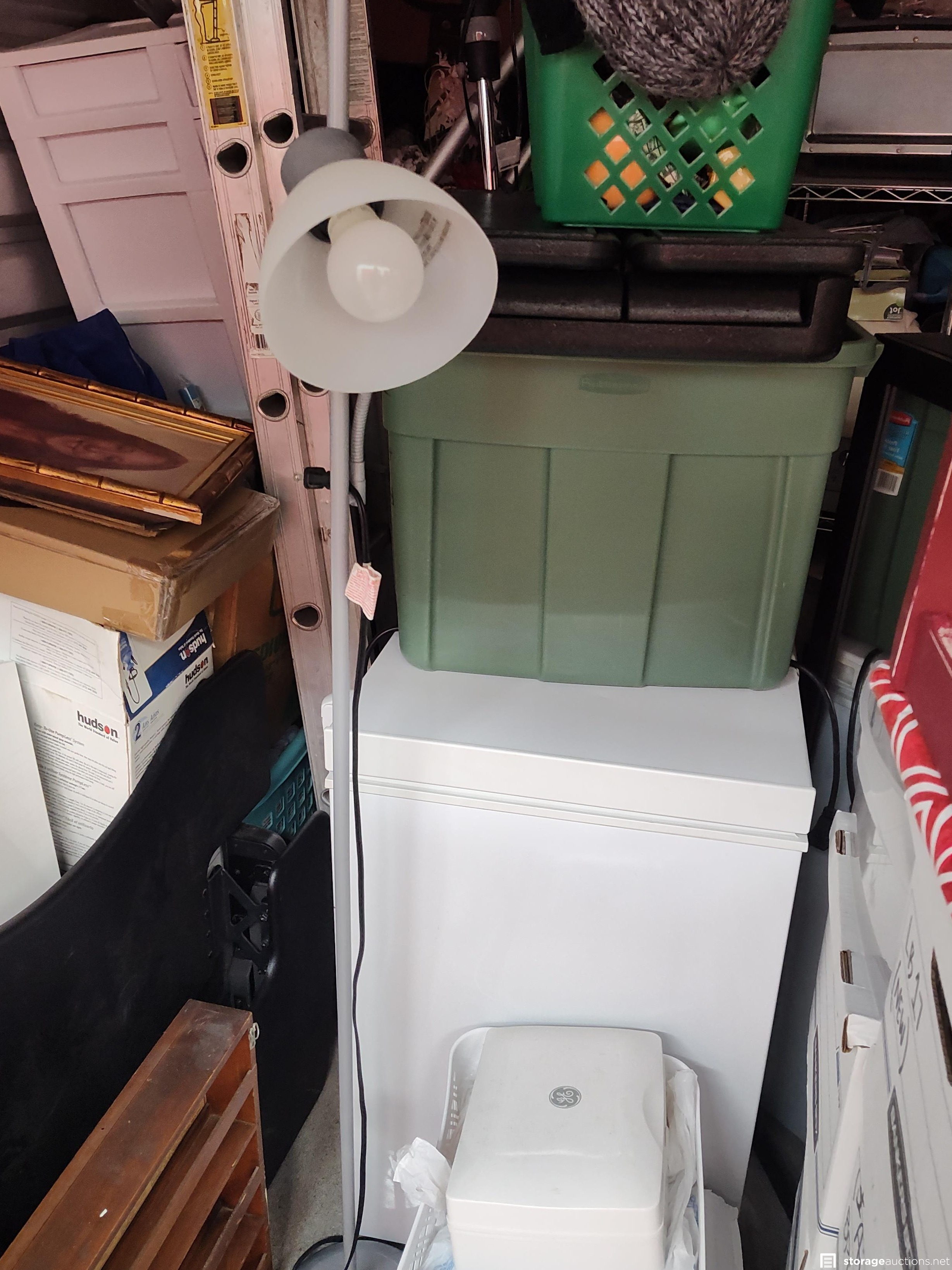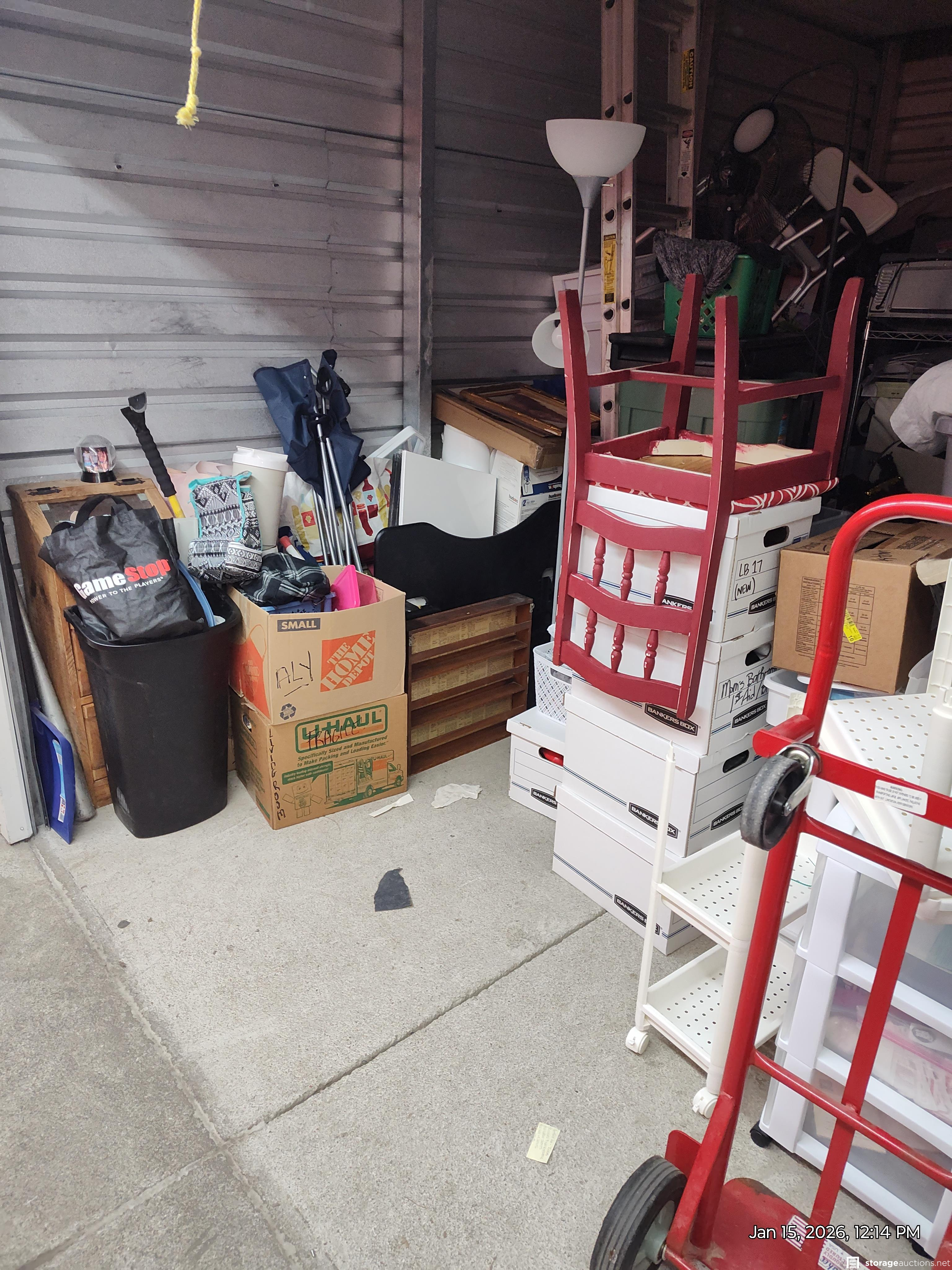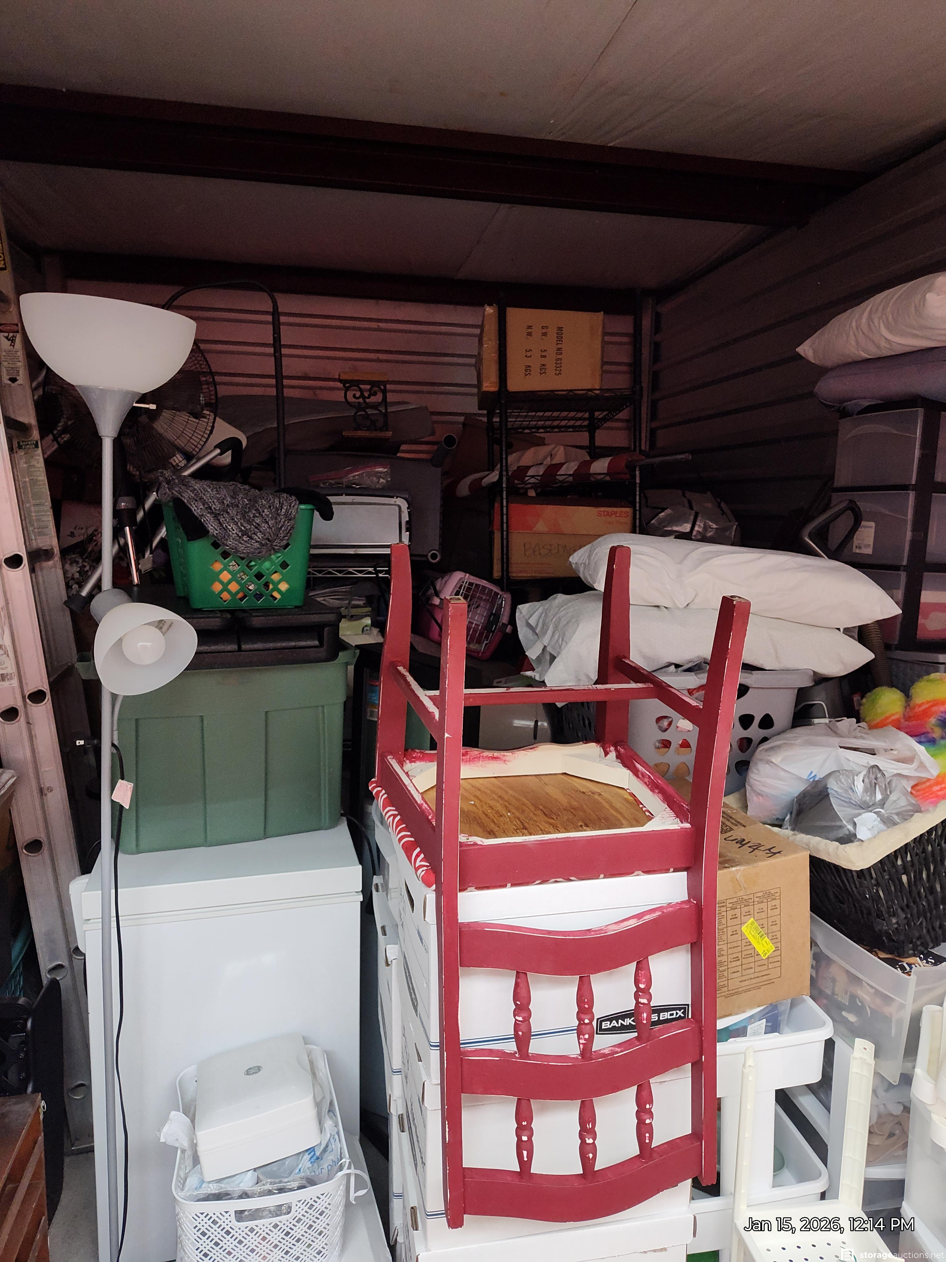This unit has chair, boxes, totes, ladder, lamp, shelves, dolly, deep freeze