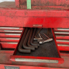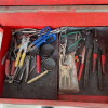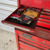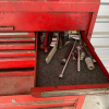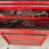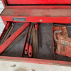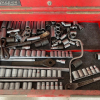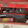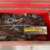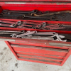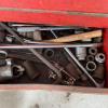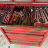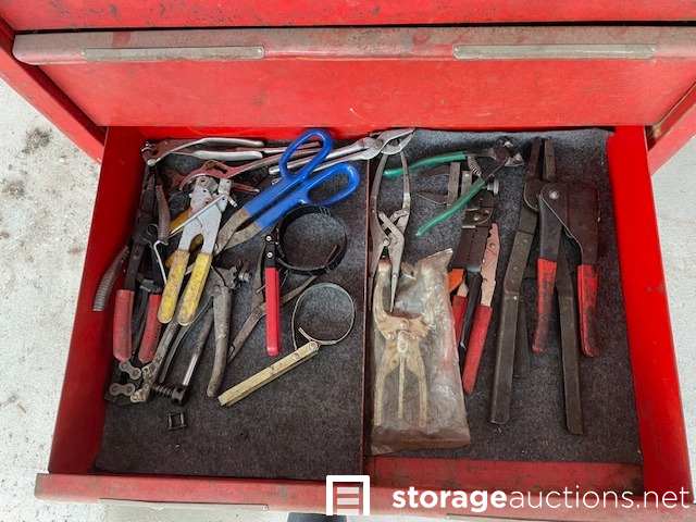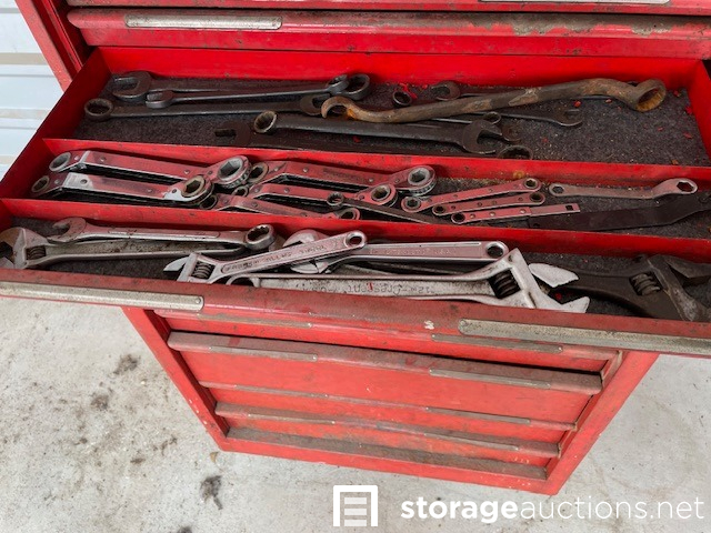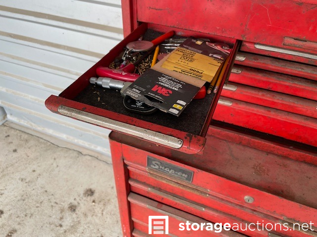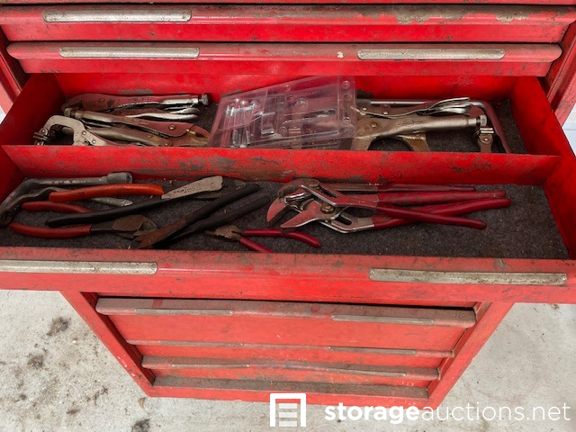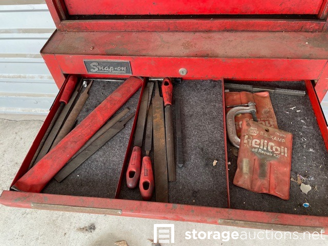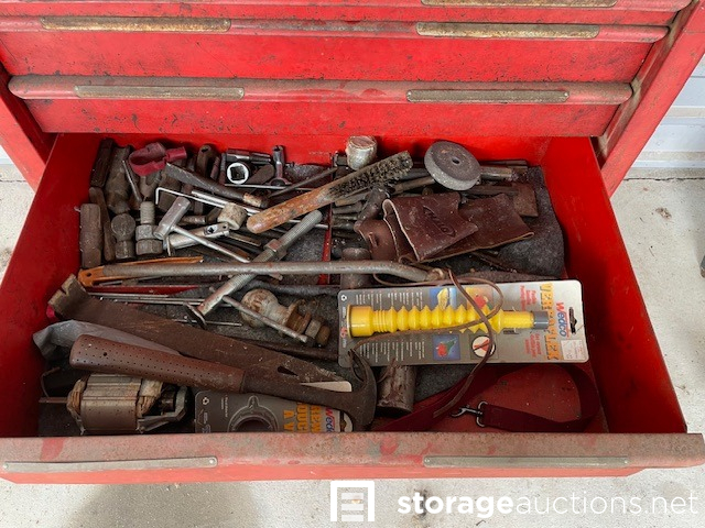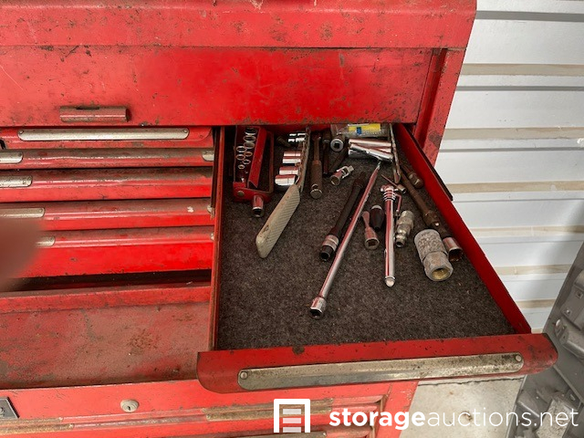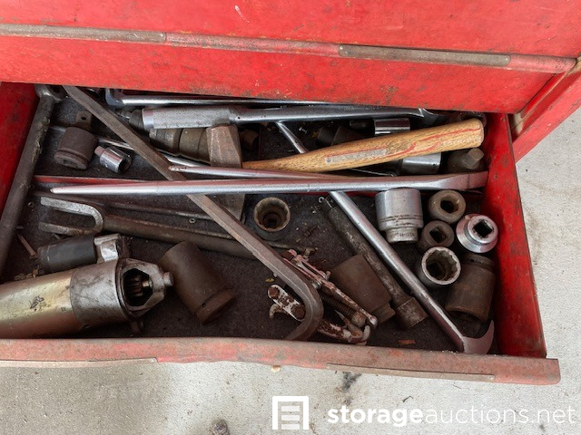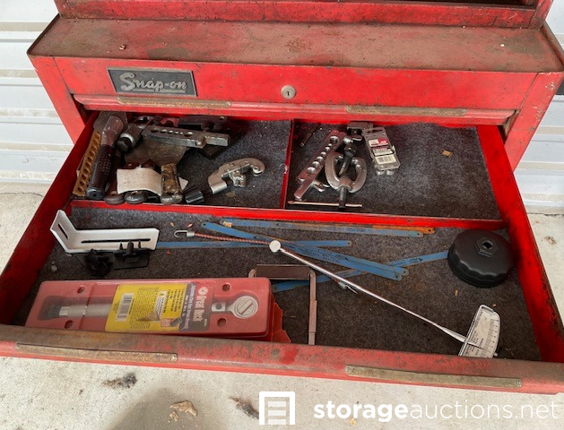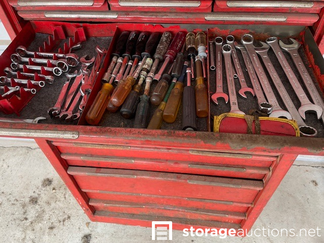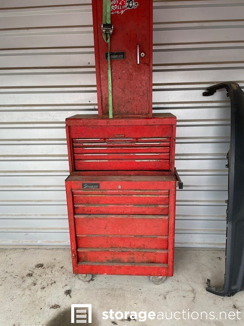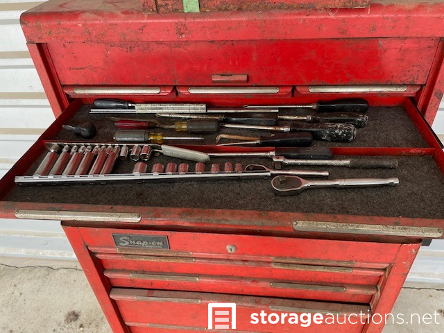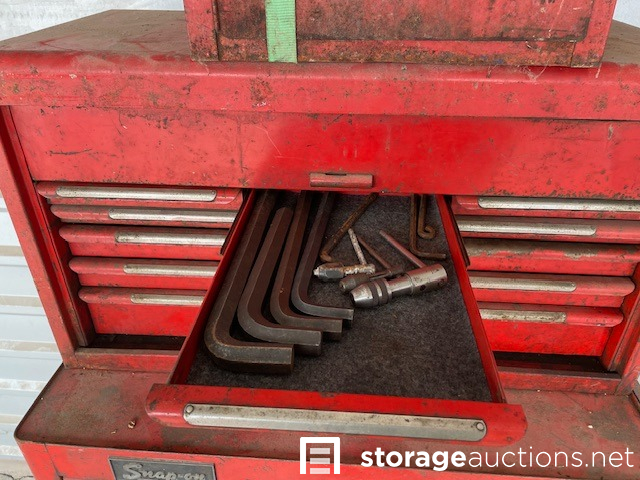 This unit seems to contain a older Snap-on Toolbox with assorted tools such as sockets, end wrenches, Crescent wrenches, nut drivers, files, and misc. specialty tools. This unit has a front bumper for some type of car.