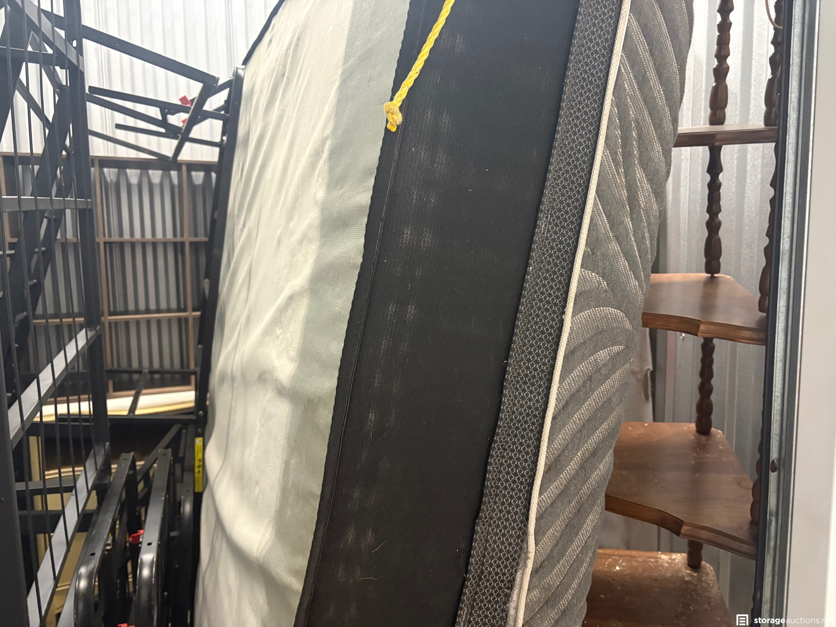 MATTRESS, BOX SPRINGS, BED FRAME, WOODEN CORNER SHELF, STORAGE CUBBY, DRESSER, NIGHT STAND, MISC ITEMS