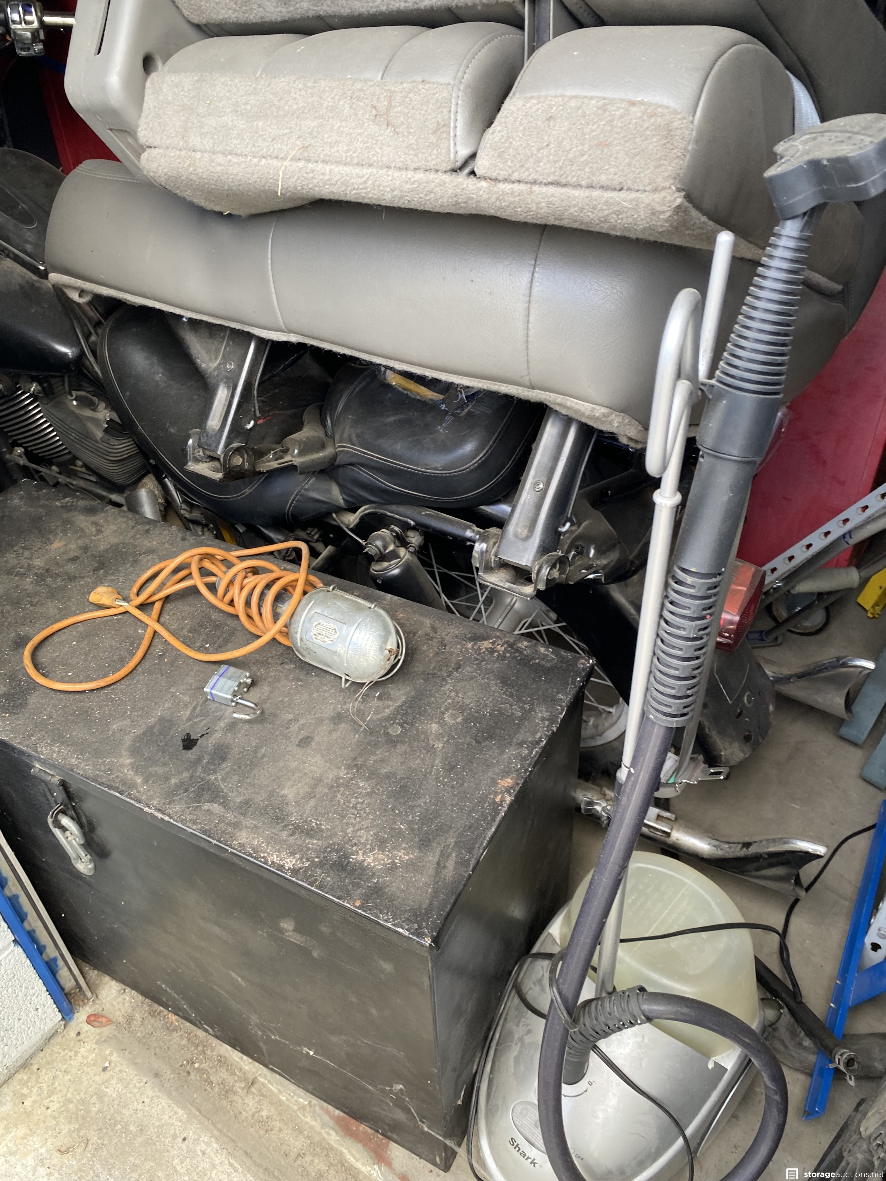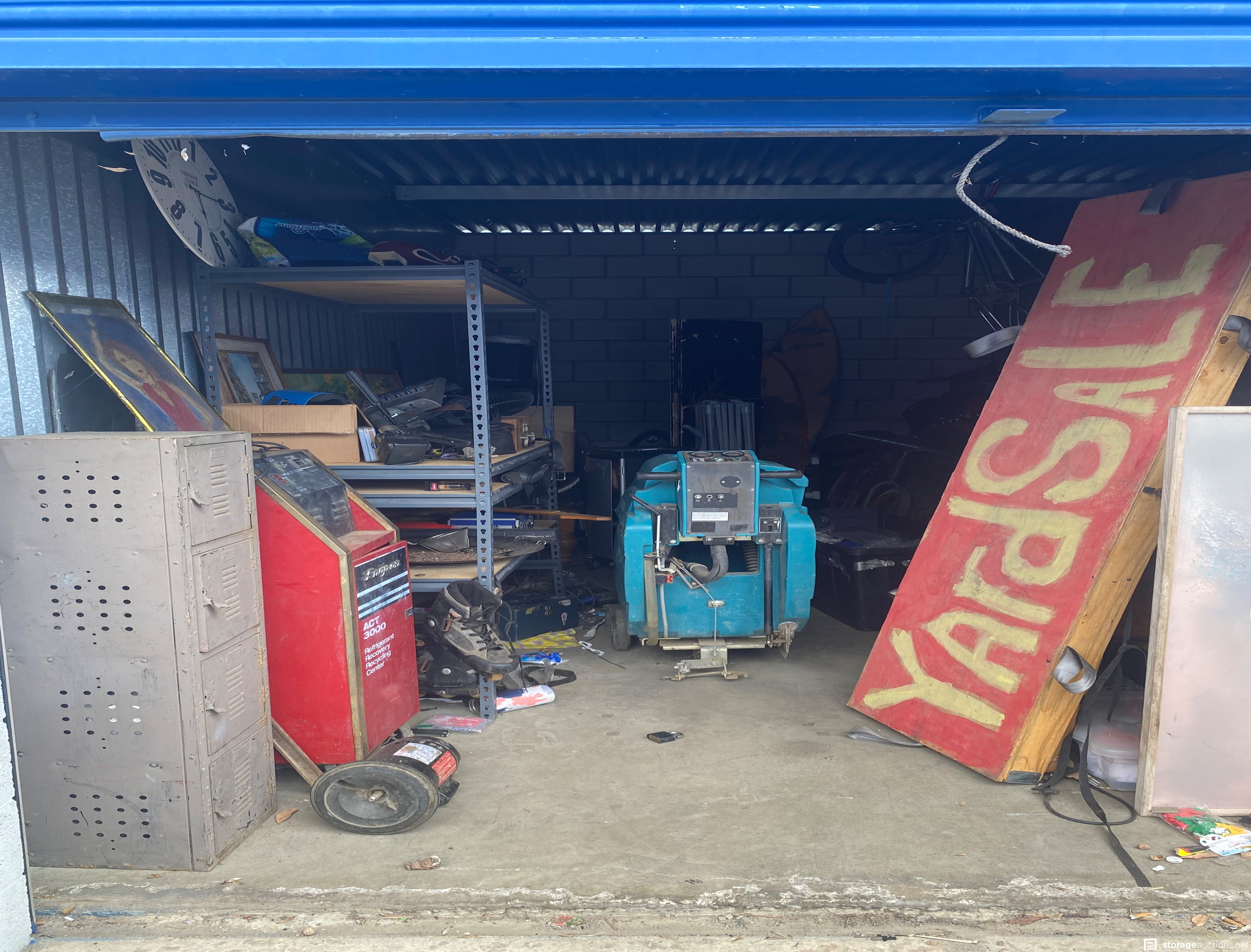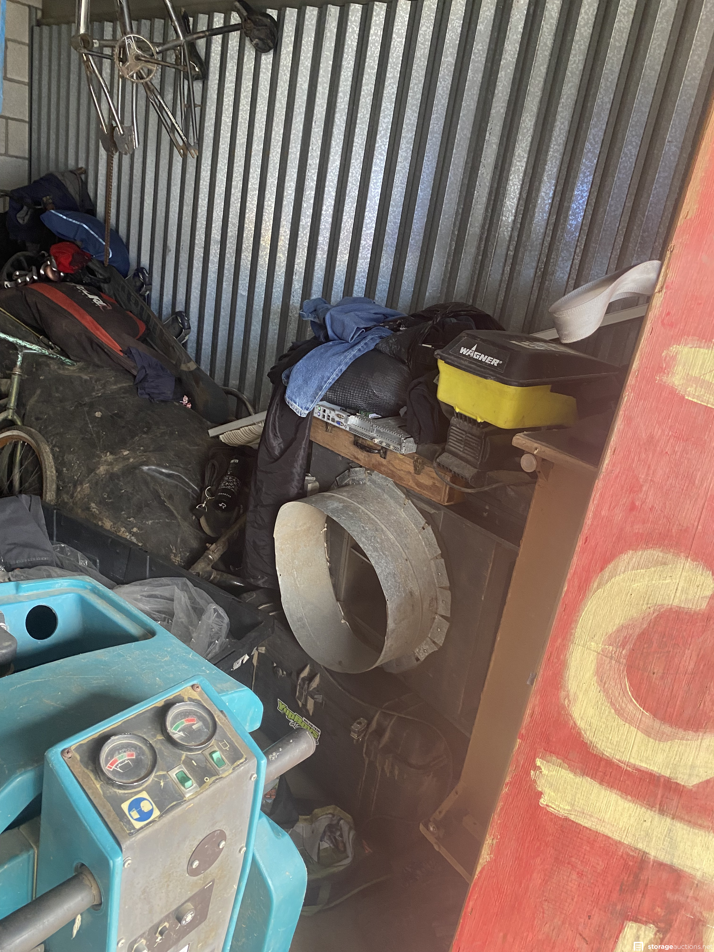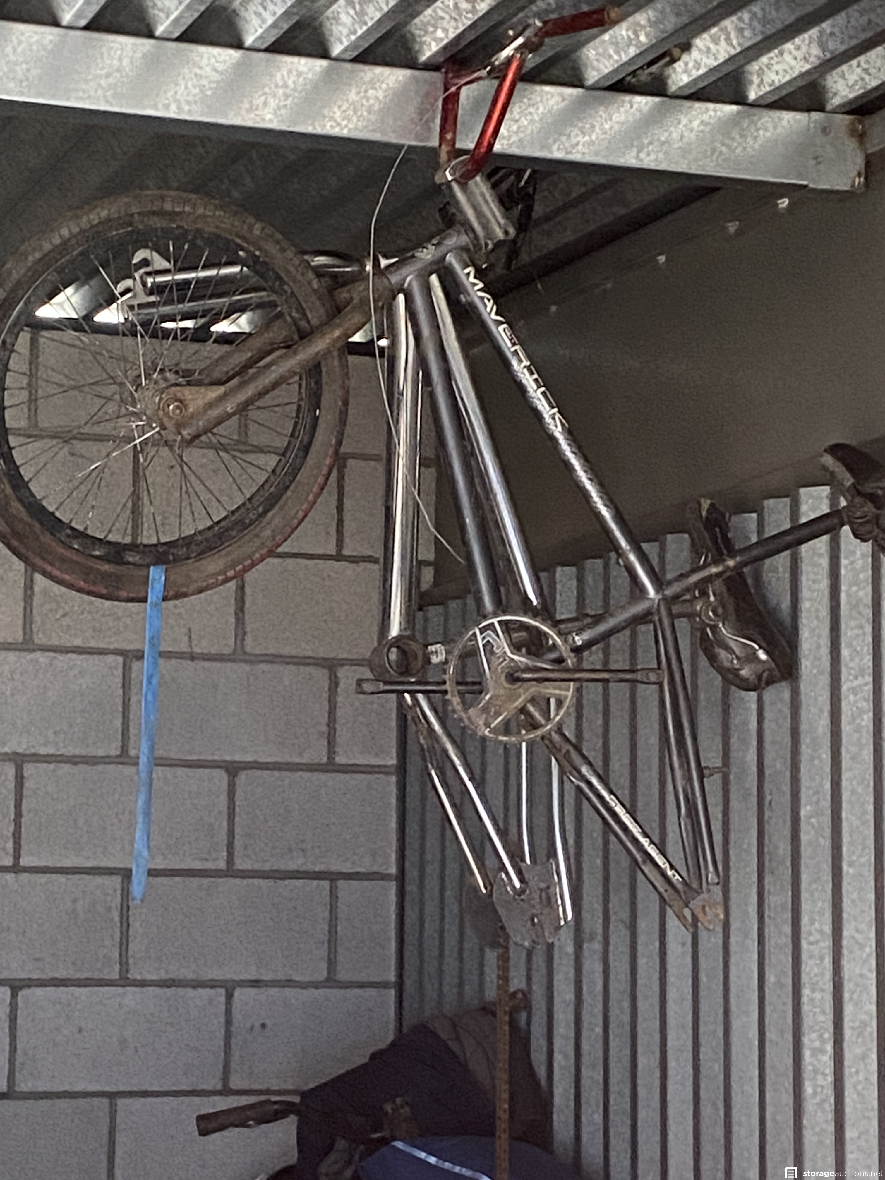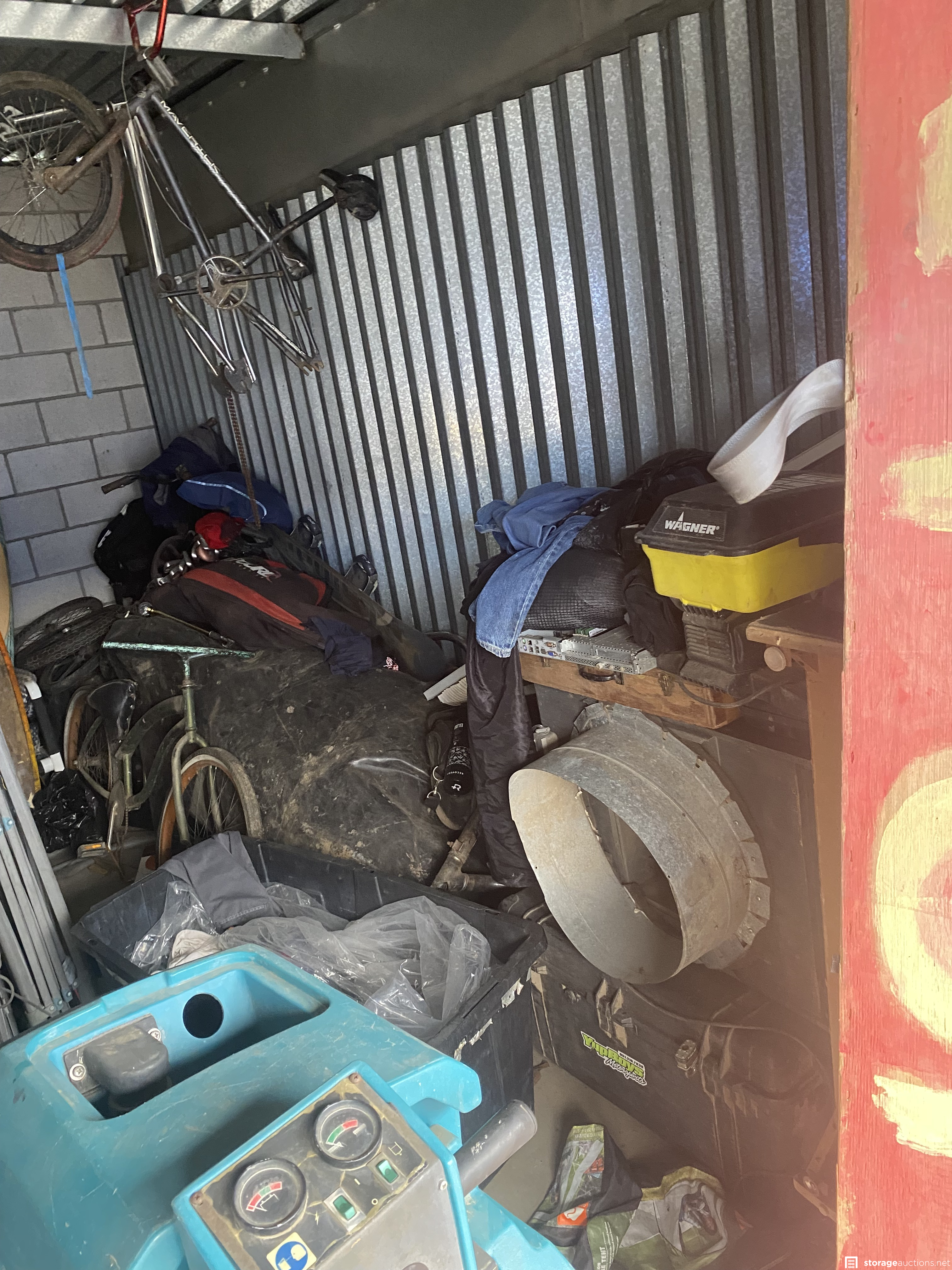 Lockers, metal rack, surfboard, wakeboard, camera, bike, bike frames, snowboard room, divider, vacuums, clothing, toolbox, AC, unit miscellaneous