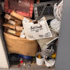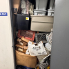 This unit appears to contain, bags 10+ boxes, 10+ totes, sewing machine, milk crates, dart board, bags, misc items.
