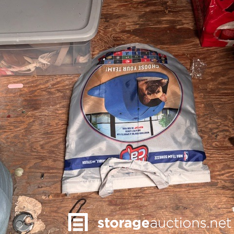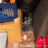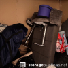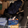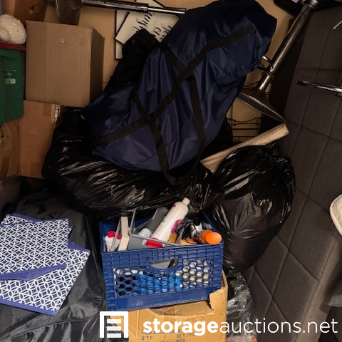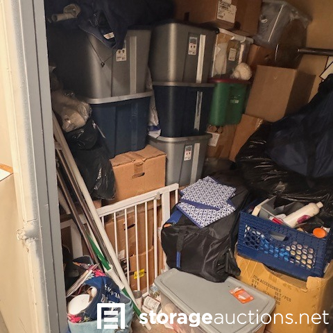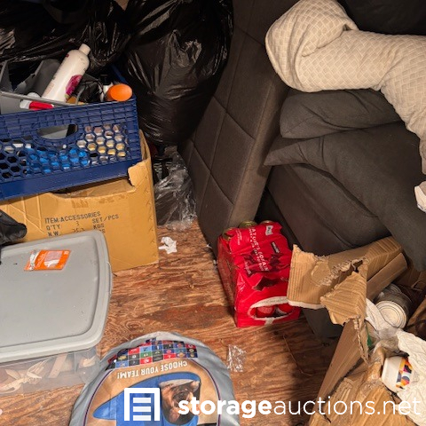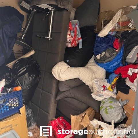 This unit appears to contain, bags, 15 boxes, clothing, bedding, 8 totes, dog food, large duffle bag 2 bar stools, dog gate, futon, wall art, toaster, dog shelter, misc items