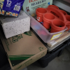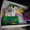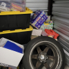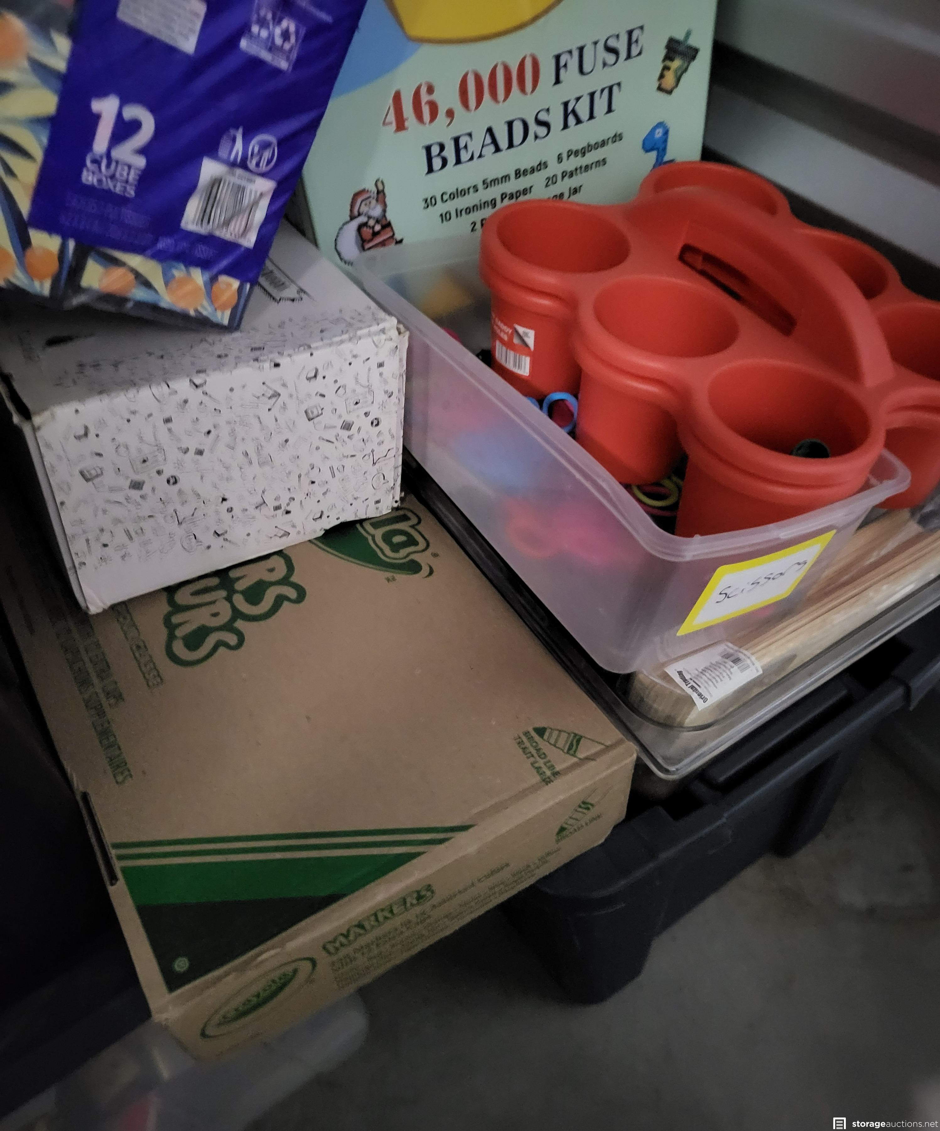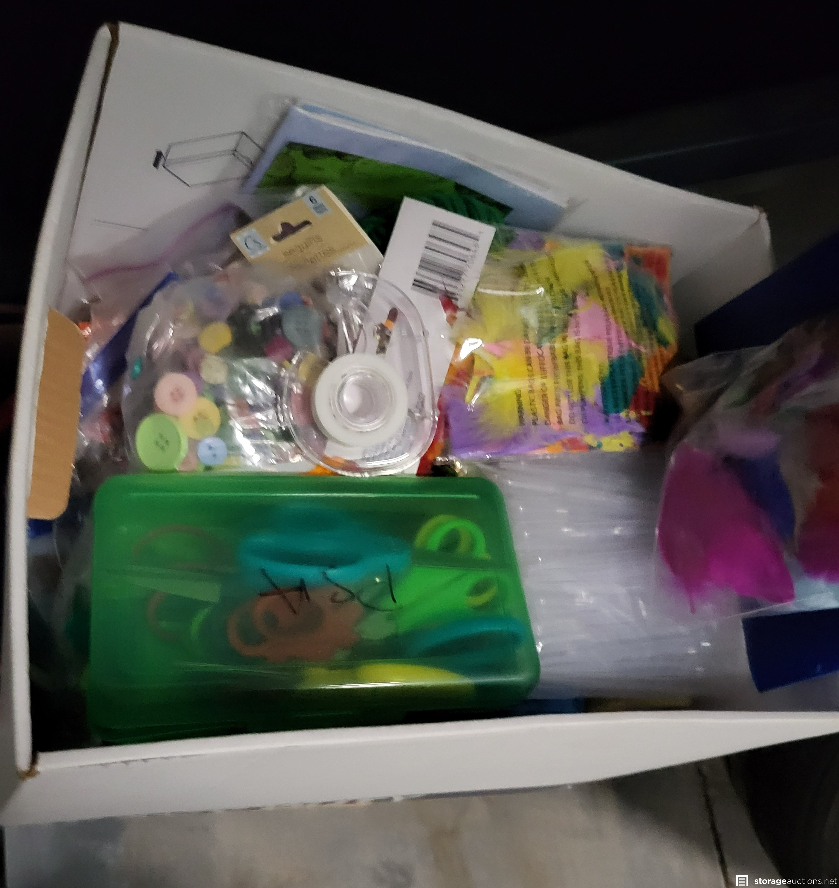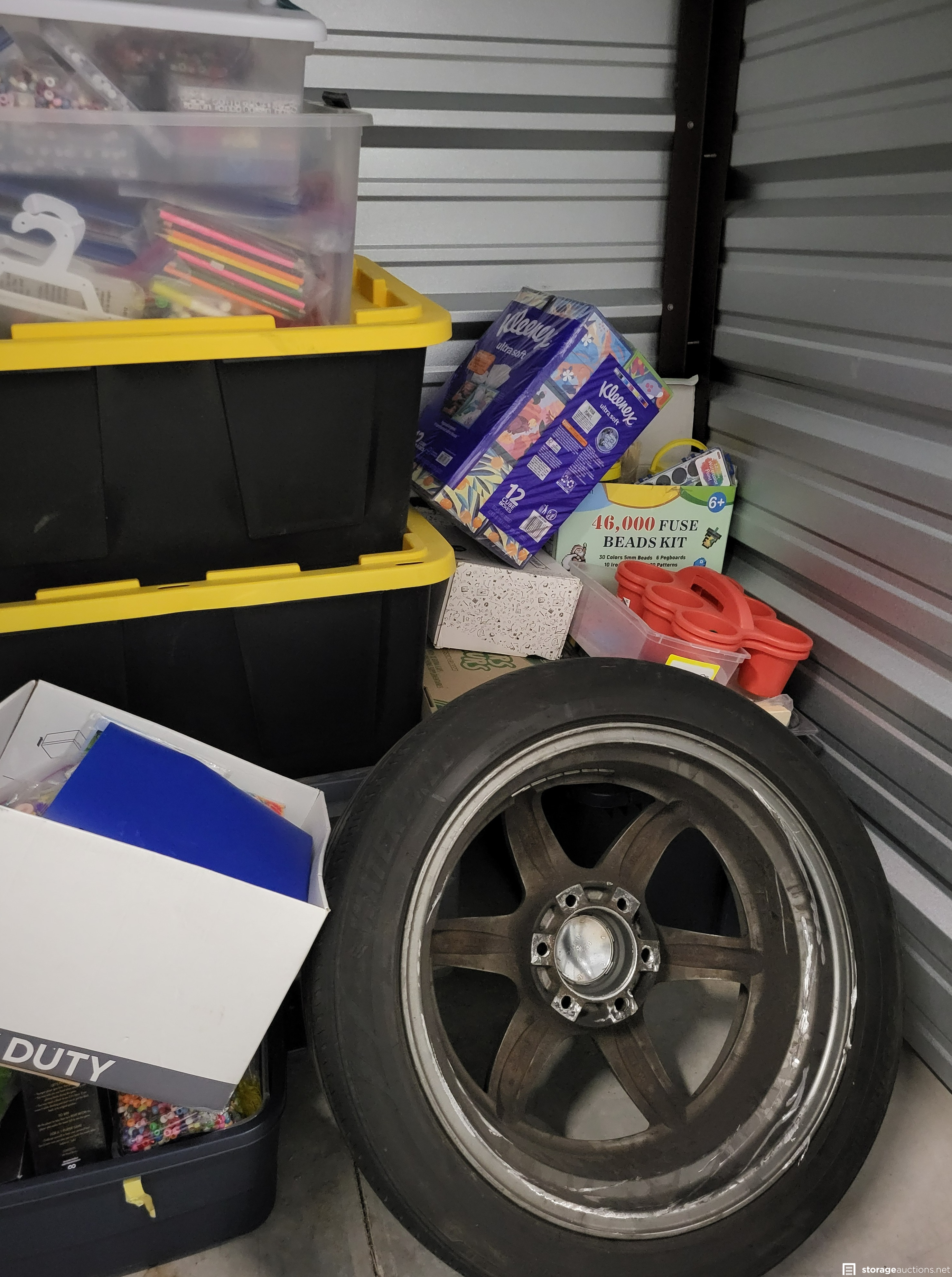 Many craft items, buttons, pipe cleaners, beads etc. Wheel and tire, Various totes.