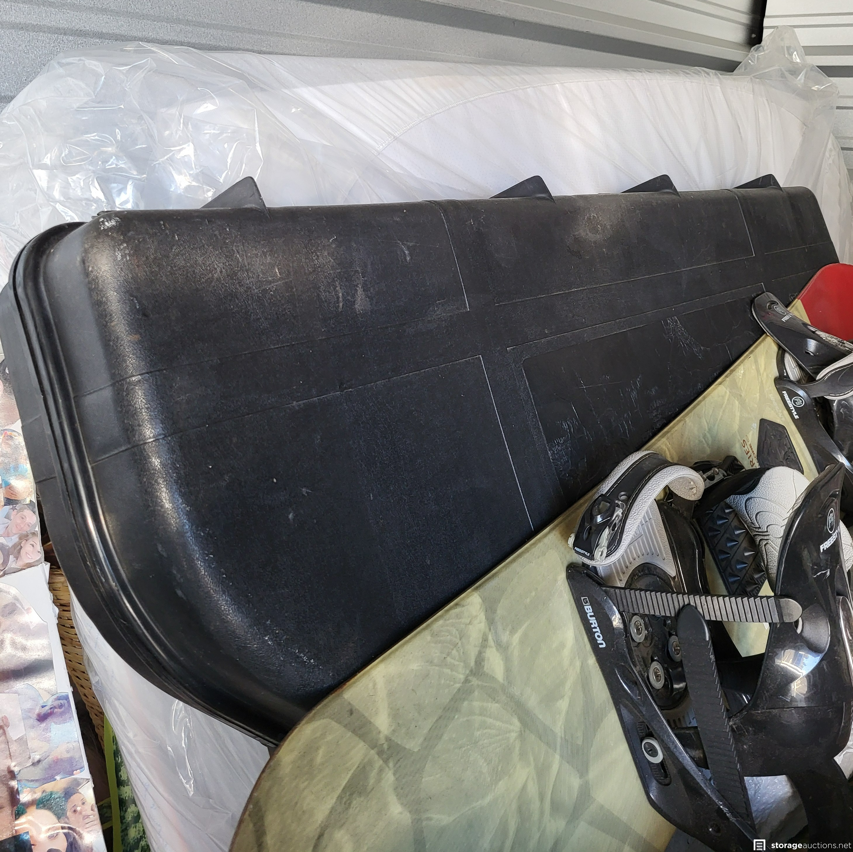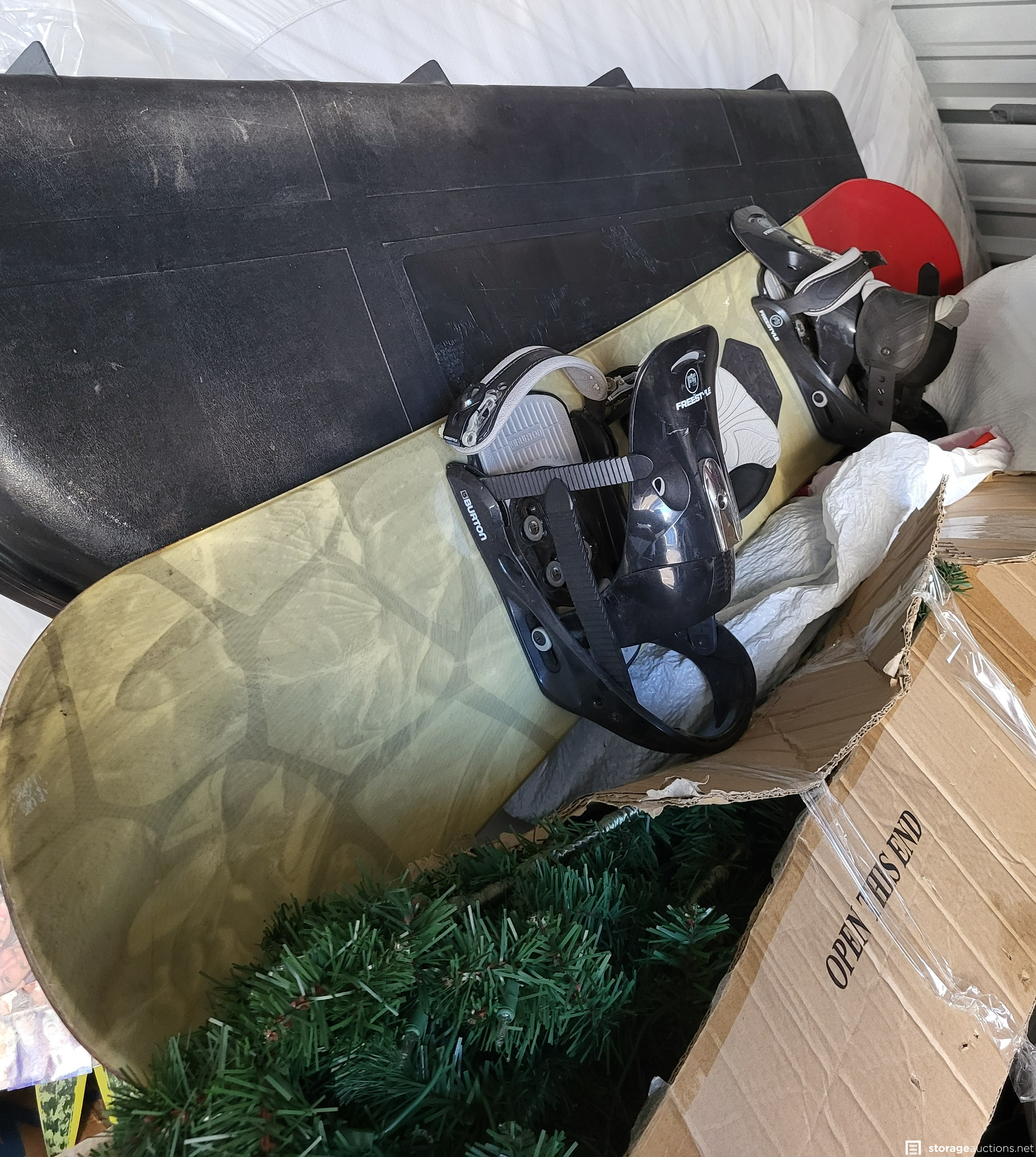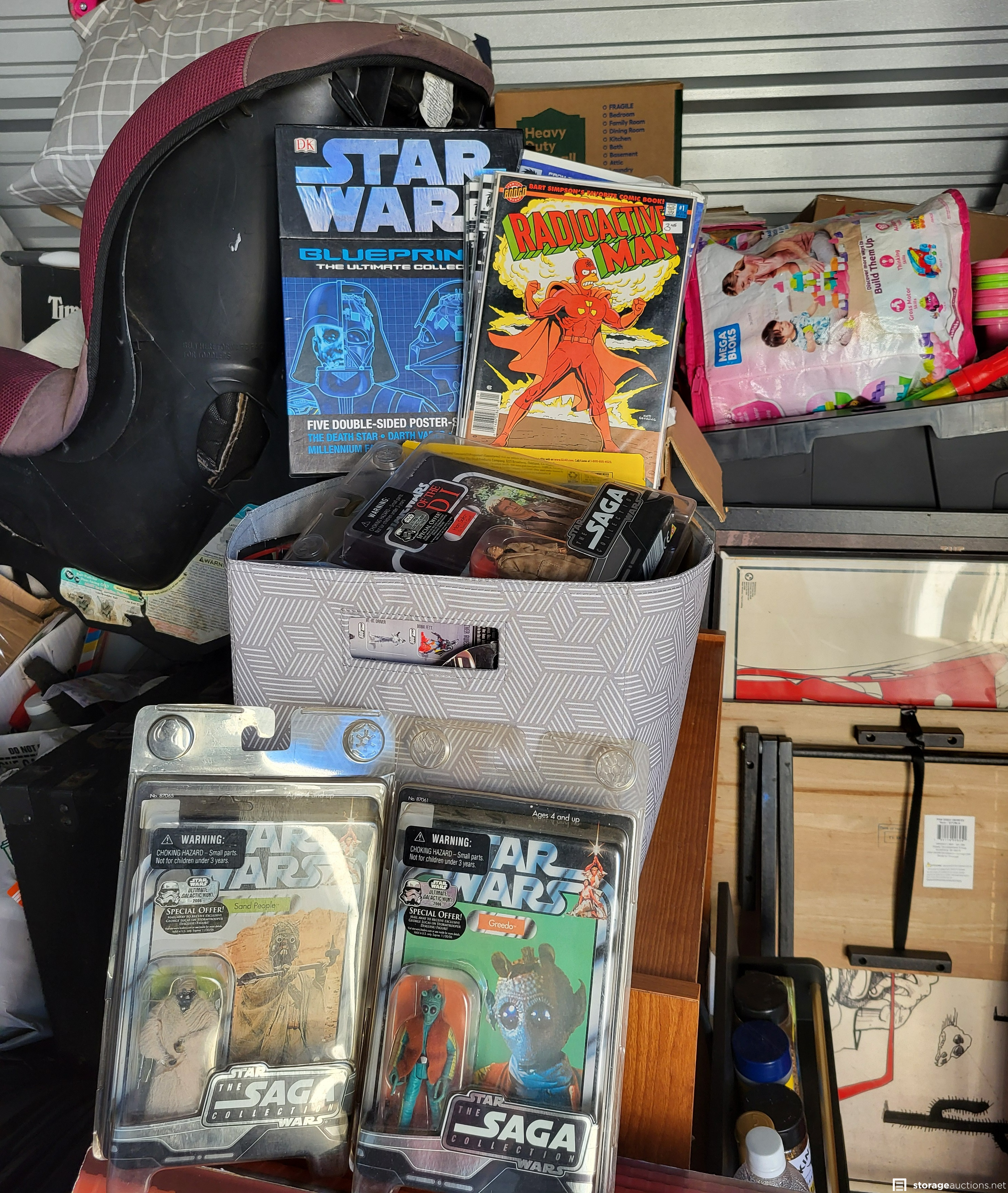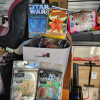 Star Wars action figures, Star Wars light saber, various comic books, full size mattress, skateboard, snowboard, various cases, luggage, Christmas tree, totes, bags, children's toys, wall art, household goods.