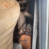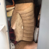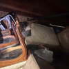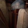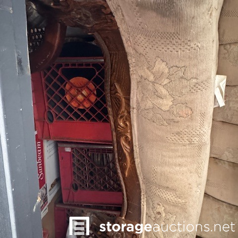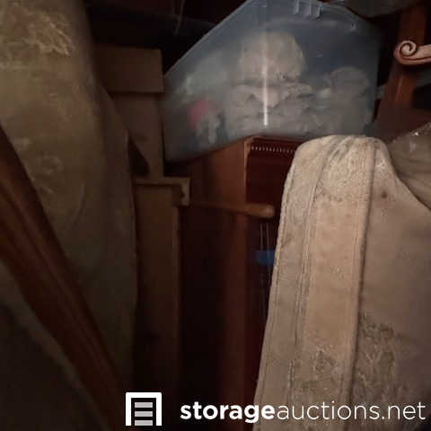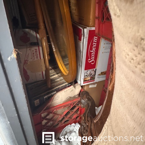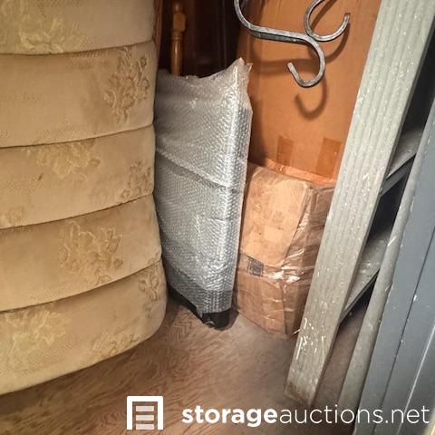 this unit appears to contain, 6 boxes, bedding, ladder, 2 totes, TV, sectional, chairs, milk crates with vinyl records table, dresser, mirror, misc items.