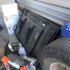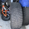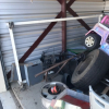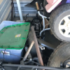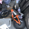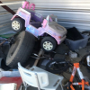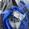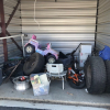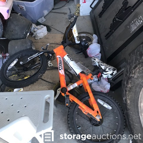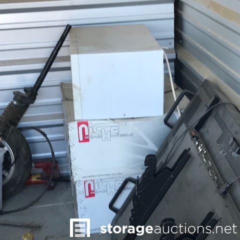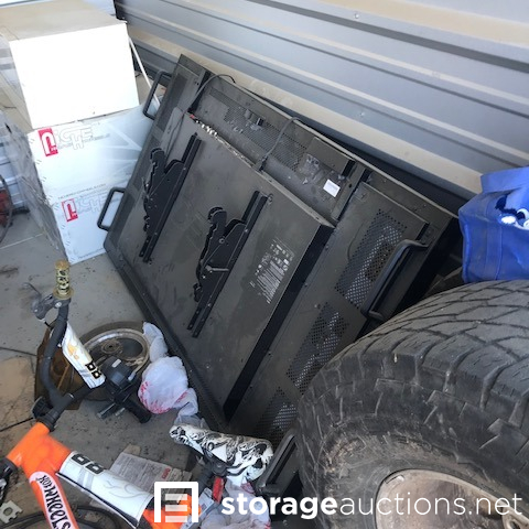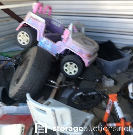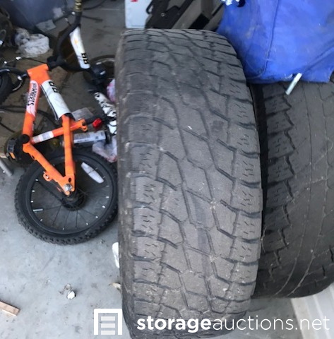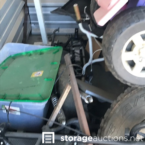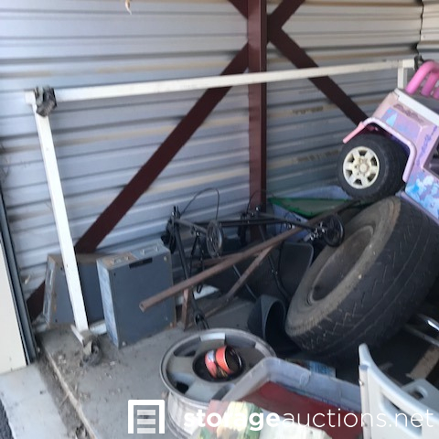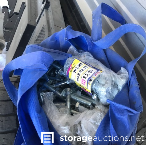 Bag full of lag bolts, tires, wheels, toy jeep, TV, Hot Wheels bike, rolling rack.