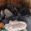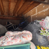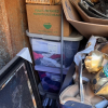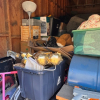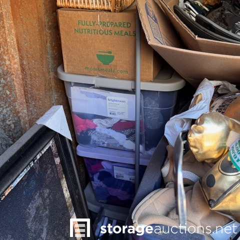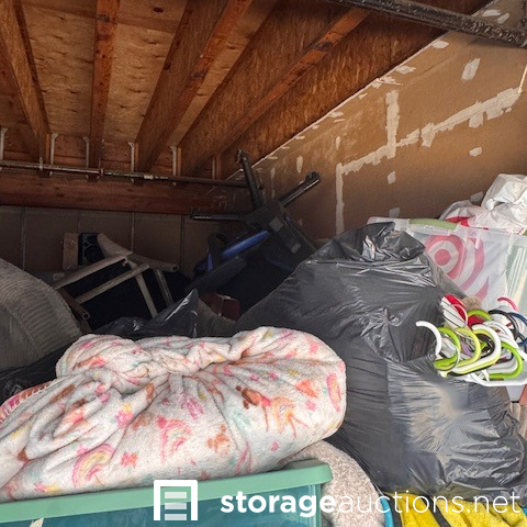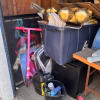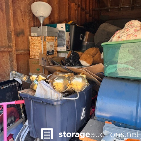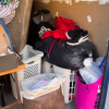 This unit appears to contain, bags, clothing, bedding, lamp, speaker, mini fridge, grill, pot and burner, house hold items, gaming chair, decoration, wall art, scooter, misc items.