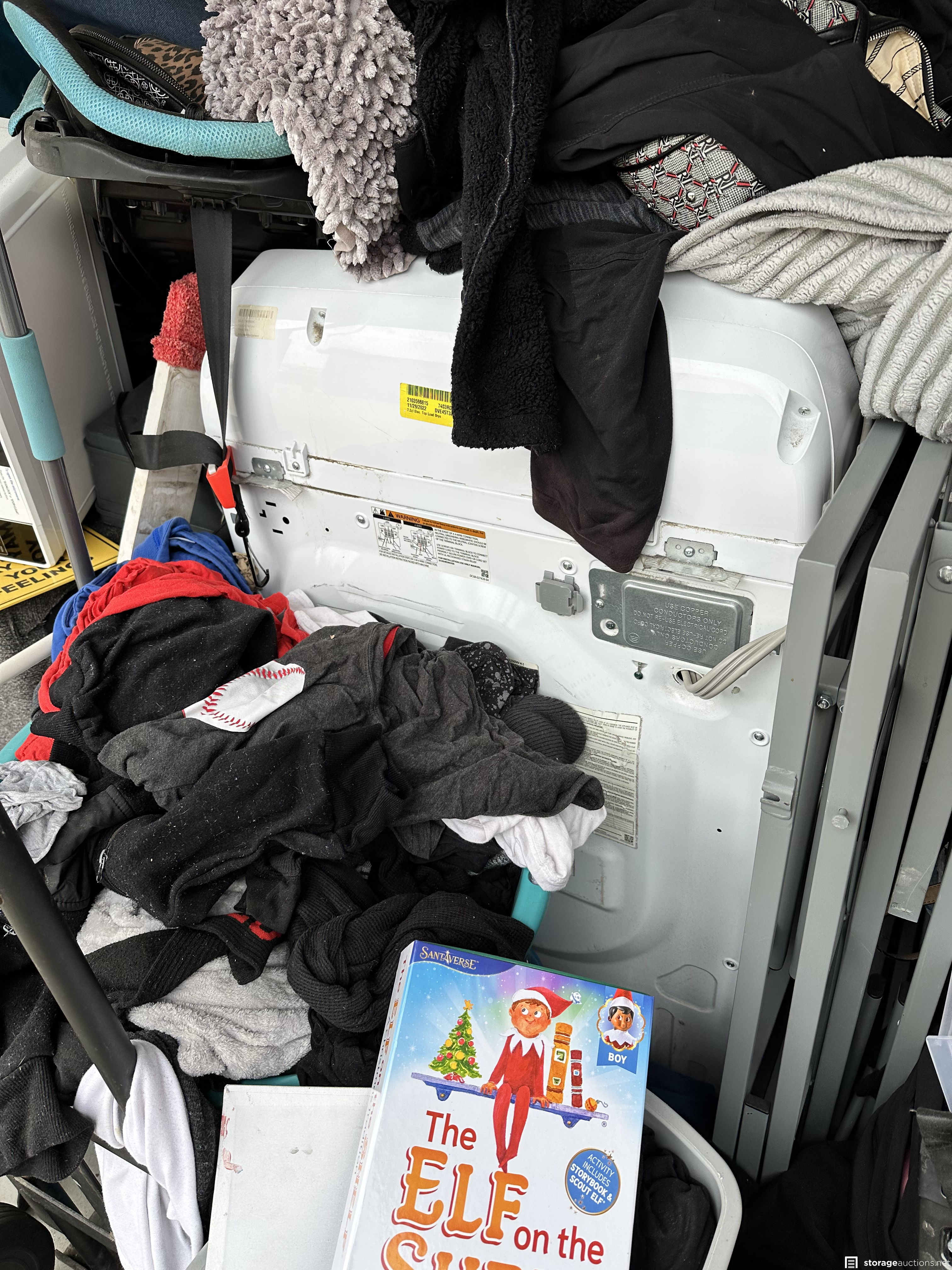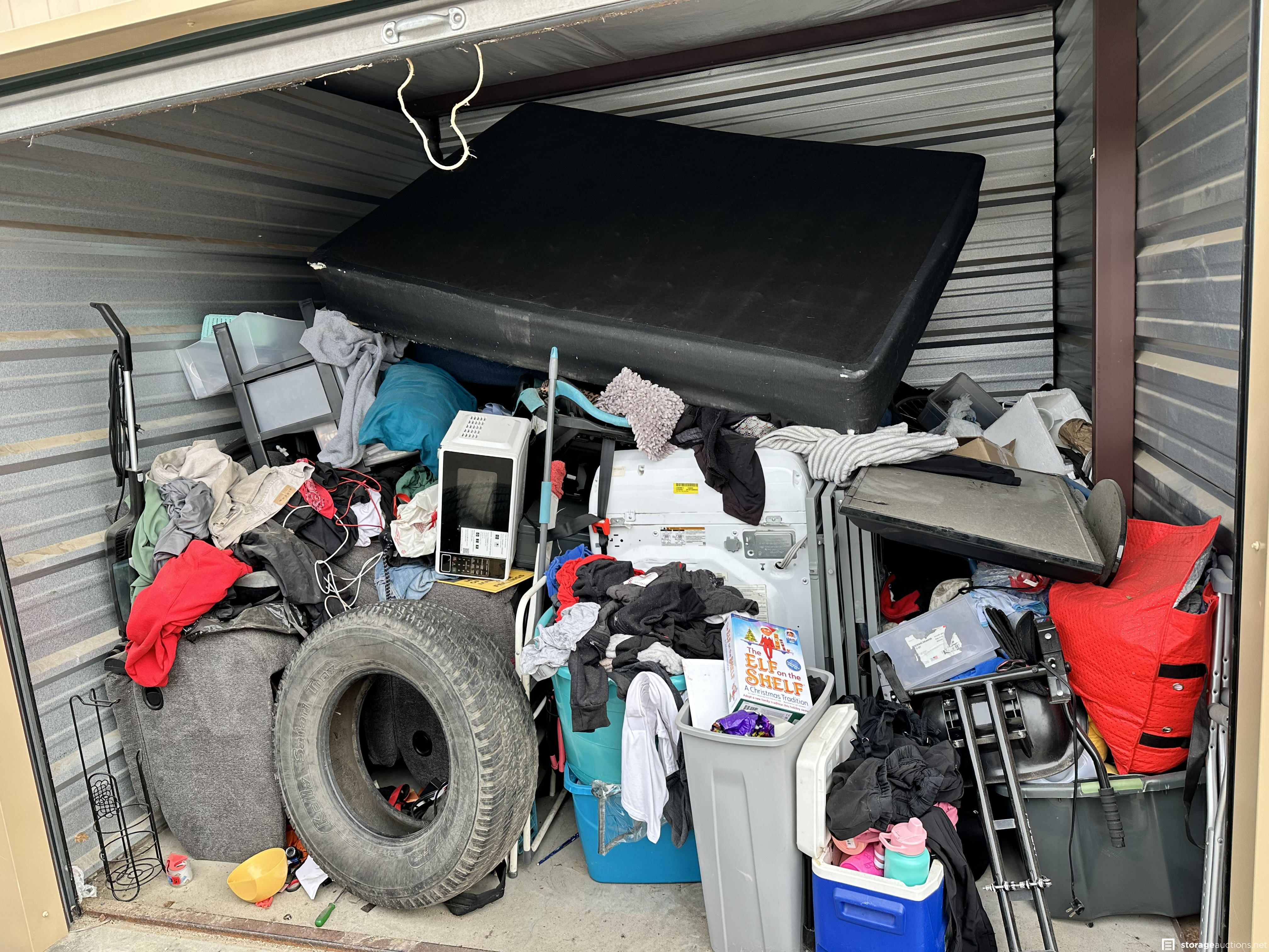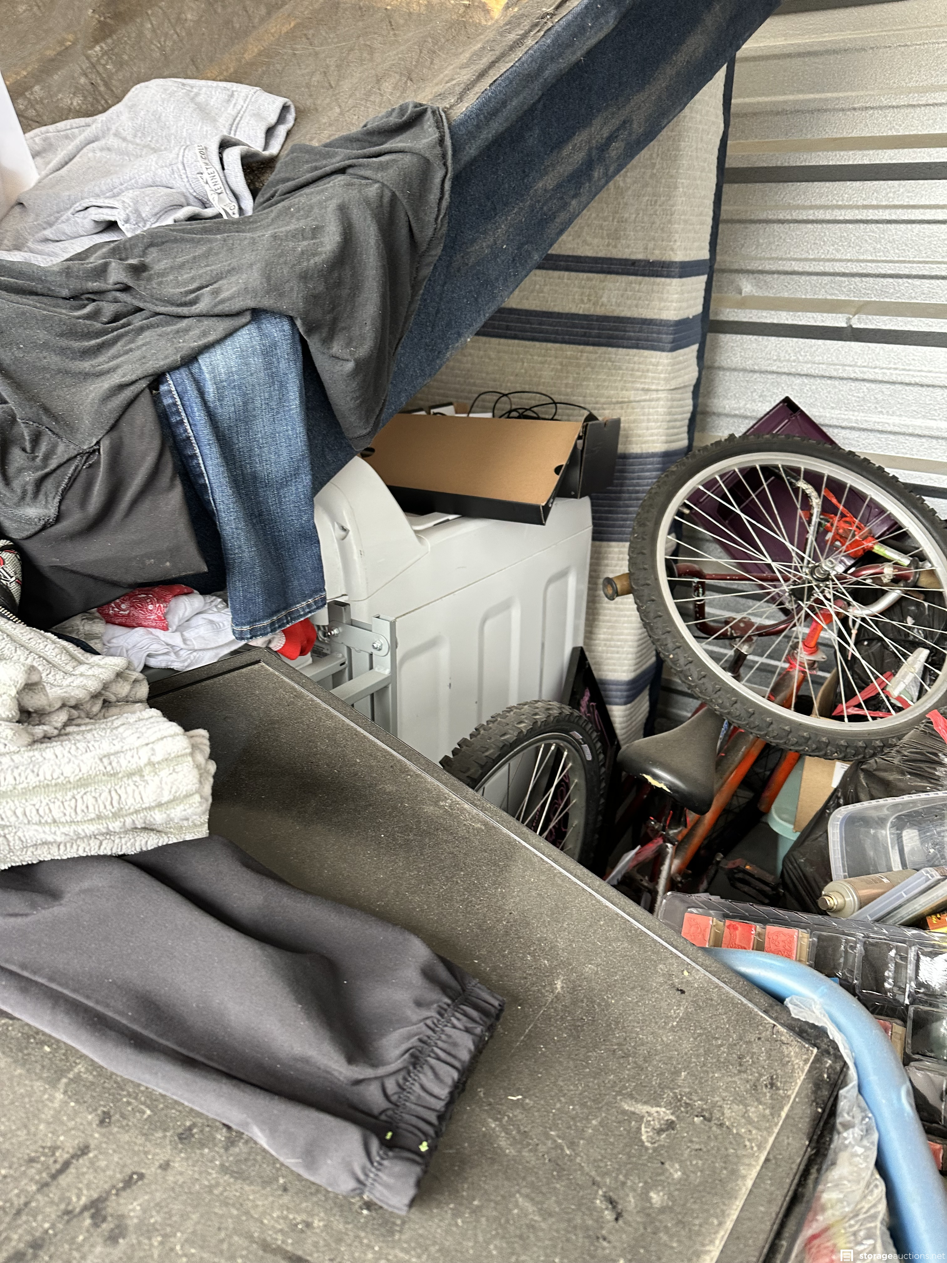 Unit contains household goods, washer and dryer set, appliances, household goods, clothing, couch, mattress