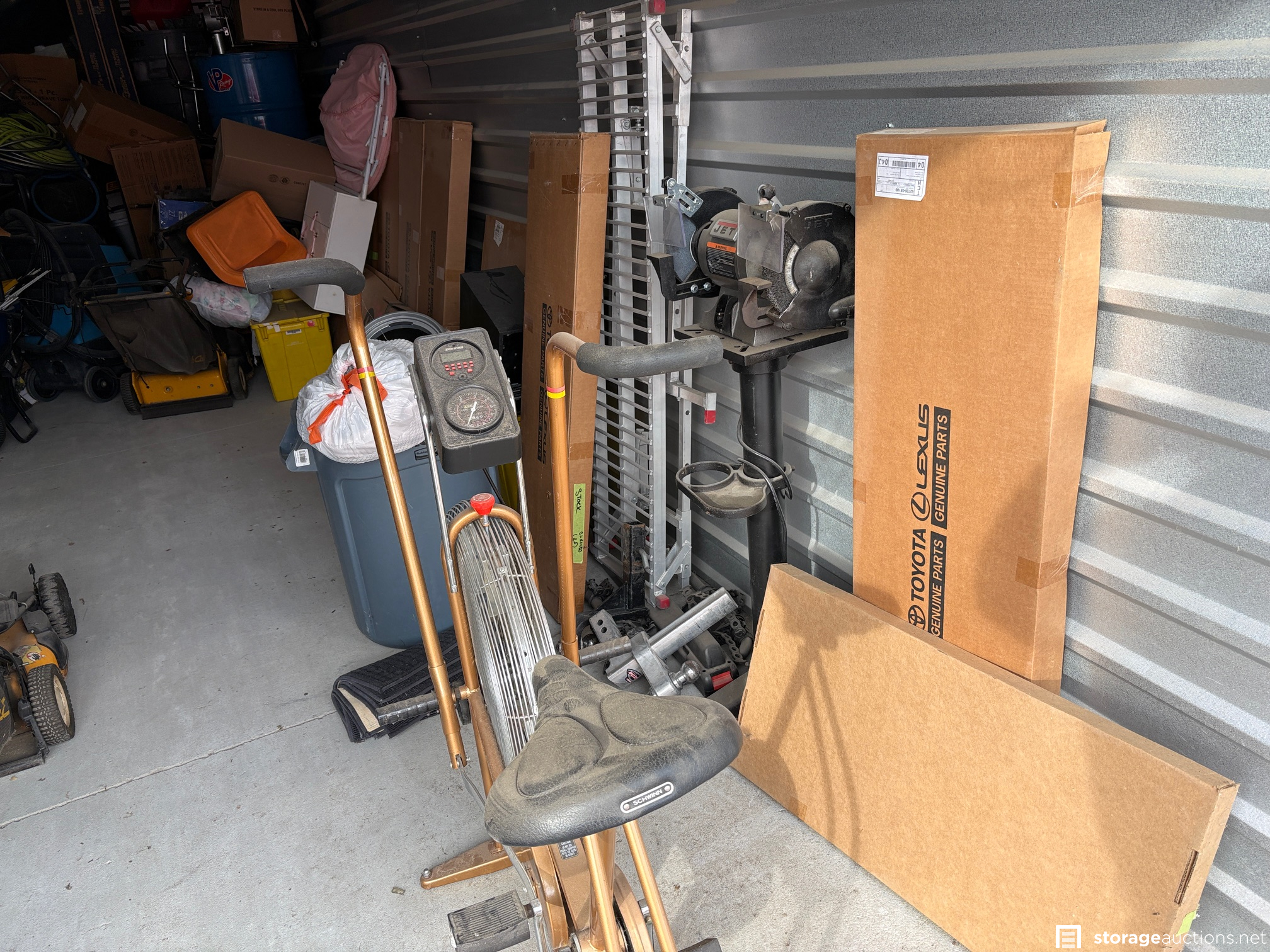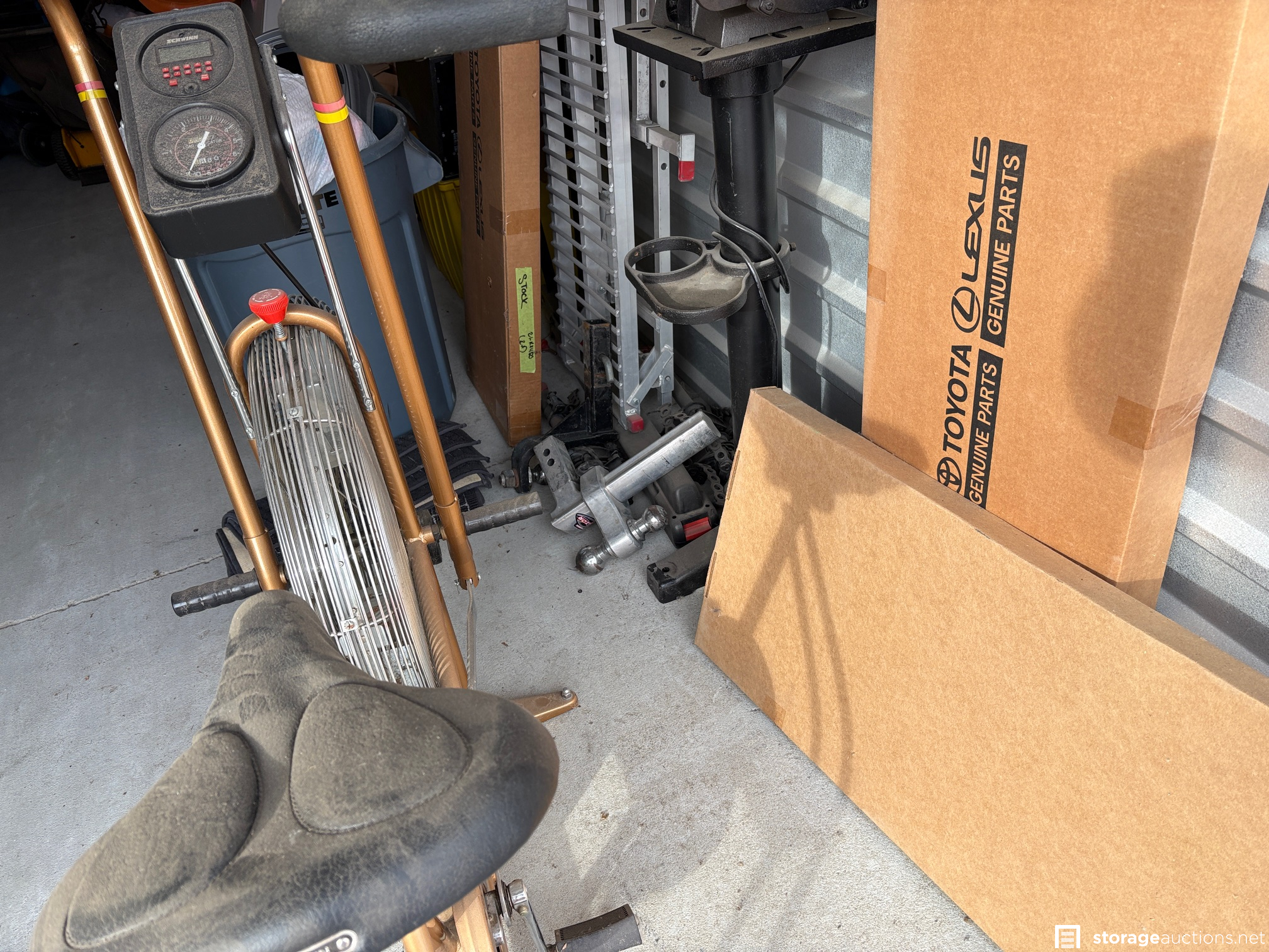 BOXES, TOTES, FAN, HITCH RECEIVER, EXERCISE BIKE, CABINET, MOWER, GAS CAN, TOOLS, MISC ITEMS