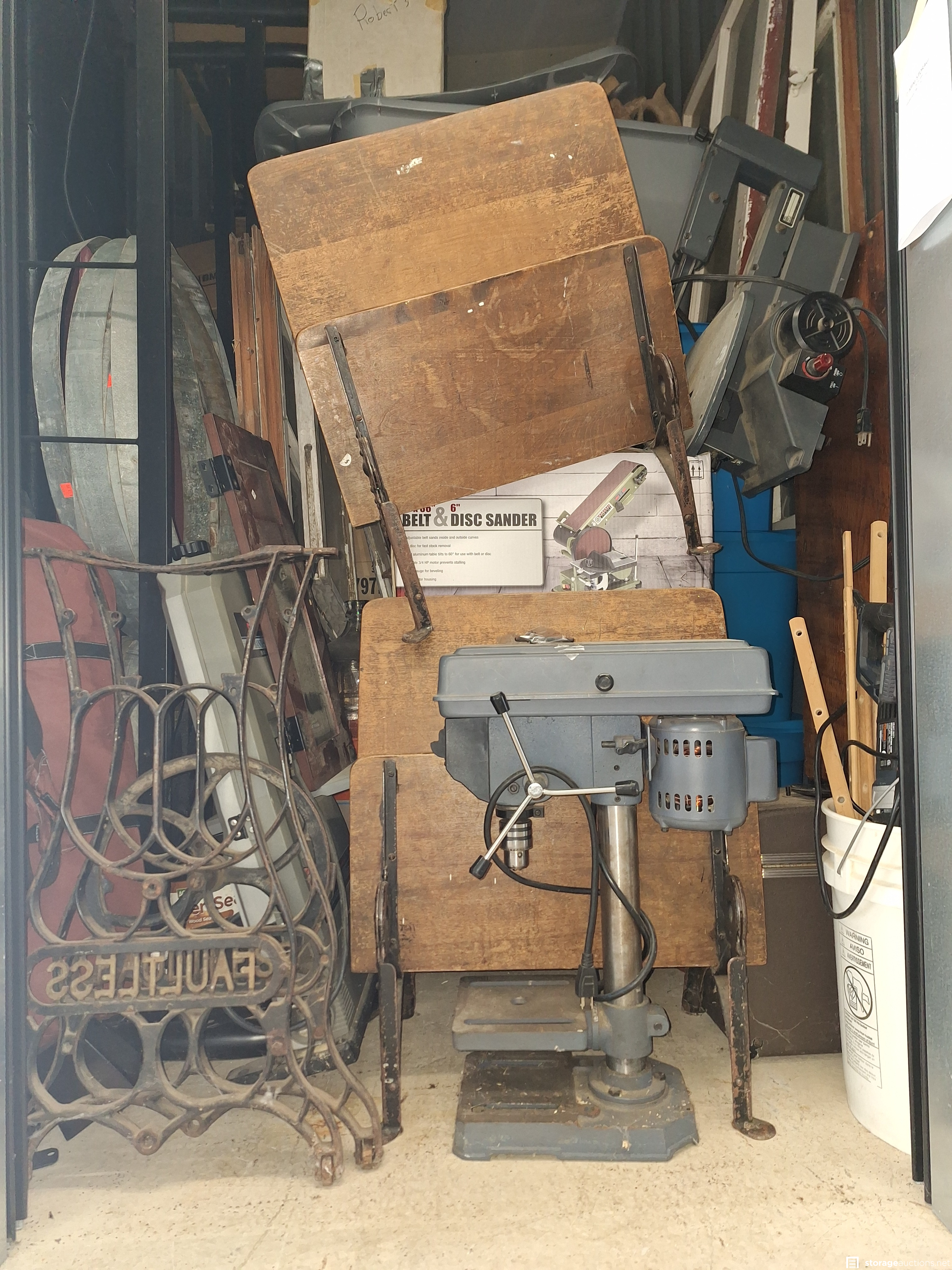 Antiques, antique schoolhouse desks, woodworking machinery, woodworking tools, woodworking supplies, scrap wood, 4 kid or twin beds, old windows, totes, canning supplies, old chest.