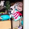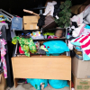 WHAT YOU SEE IS WHAT YOU GET. Things seen from the doorway: Various boxes, bags of clothing and belongings, household goods, large screen TV and stand, furniture, children's toys and items, Christmas holiday decor, skateboard with pink wheels.