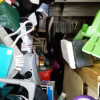 Household goods, small fridge, grill, tools, bike, sporting goods, boxes and containers.