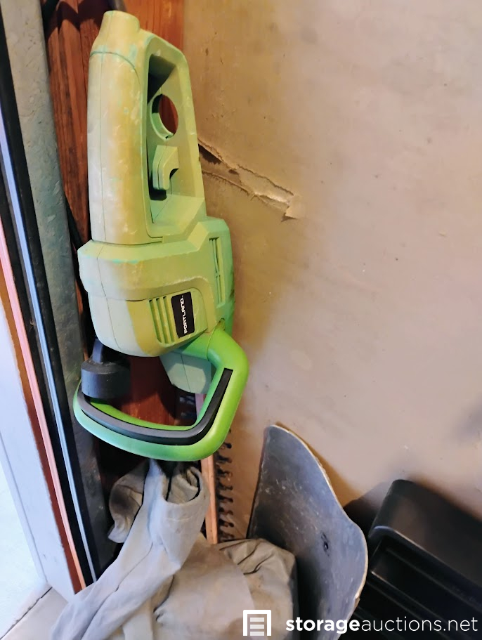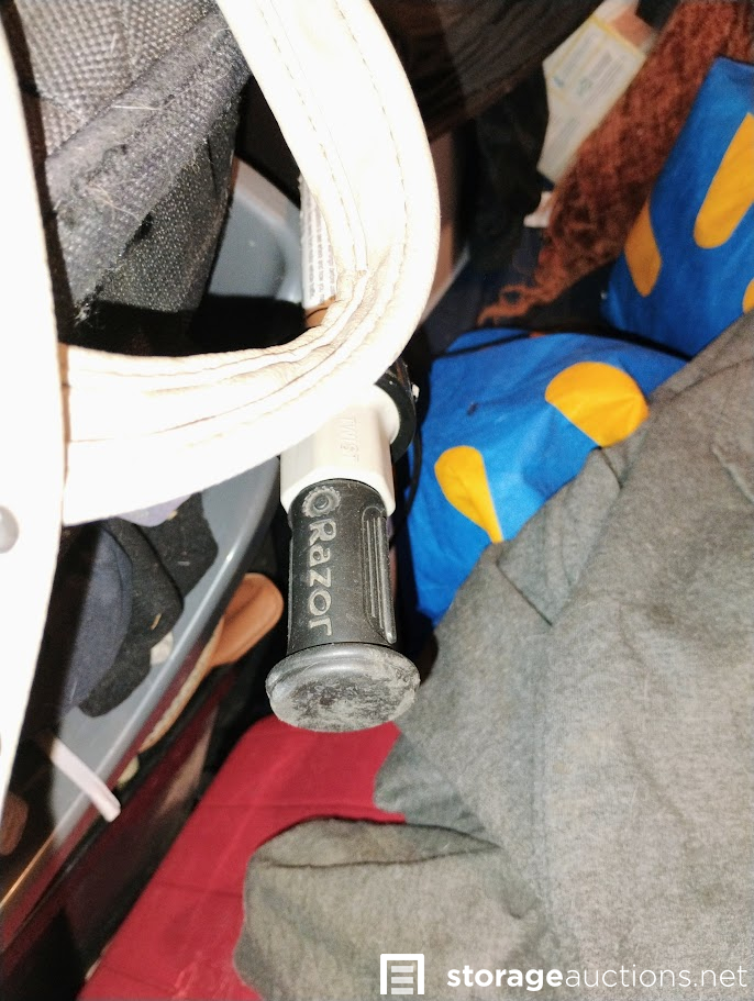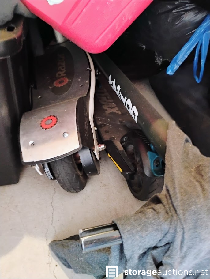 Electric Hedge Trimmer (Portland 3.5 Amp, 22 in.), various handbags, various totes and luggage, reusable shopping bags, many black plastic bags likely full of clothing, red and white plastic cooler, Razor Electric Scooter (white), and a GoTrax Electric Scooter (black).