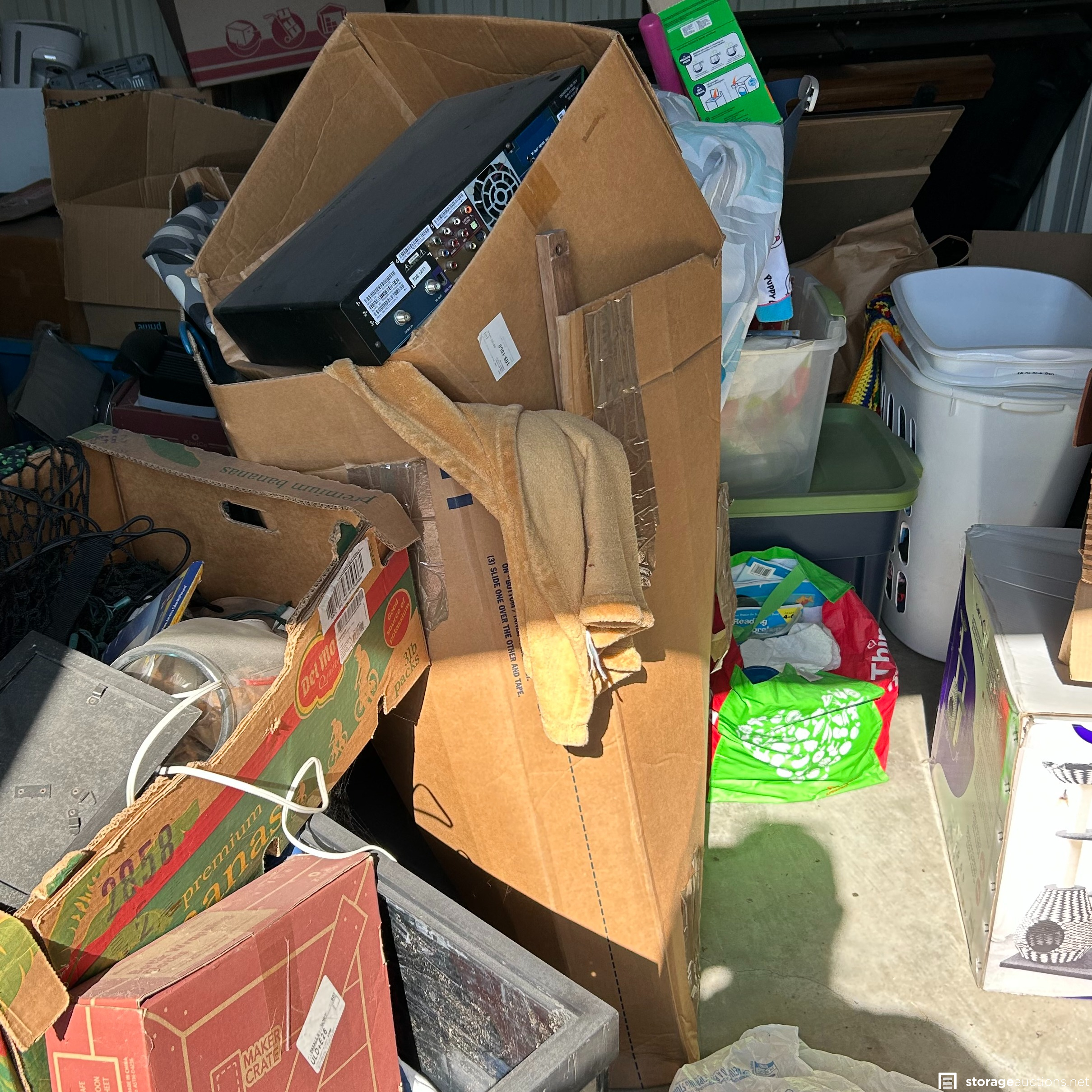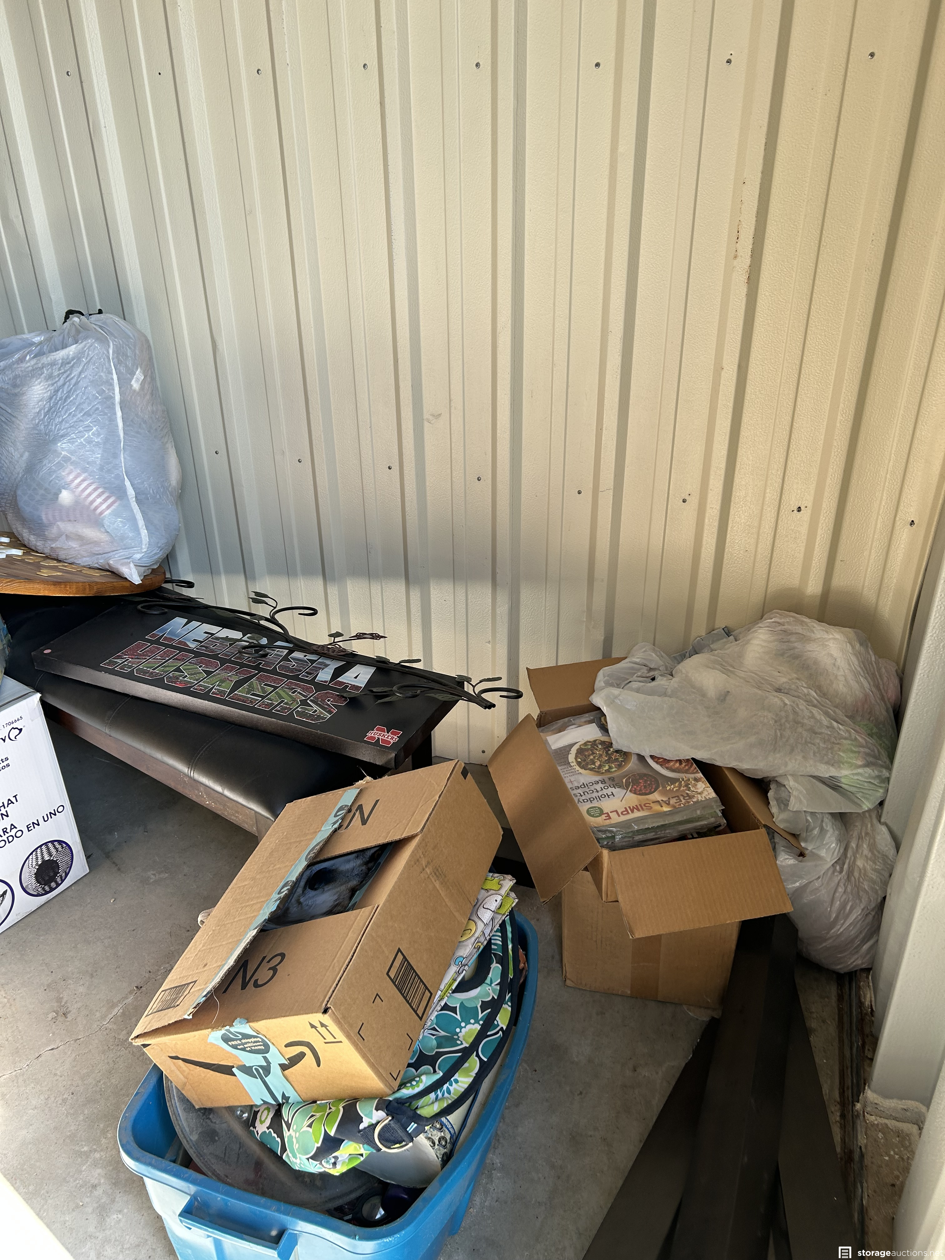 This unit has boxes, totes, bed frame, fish tank
