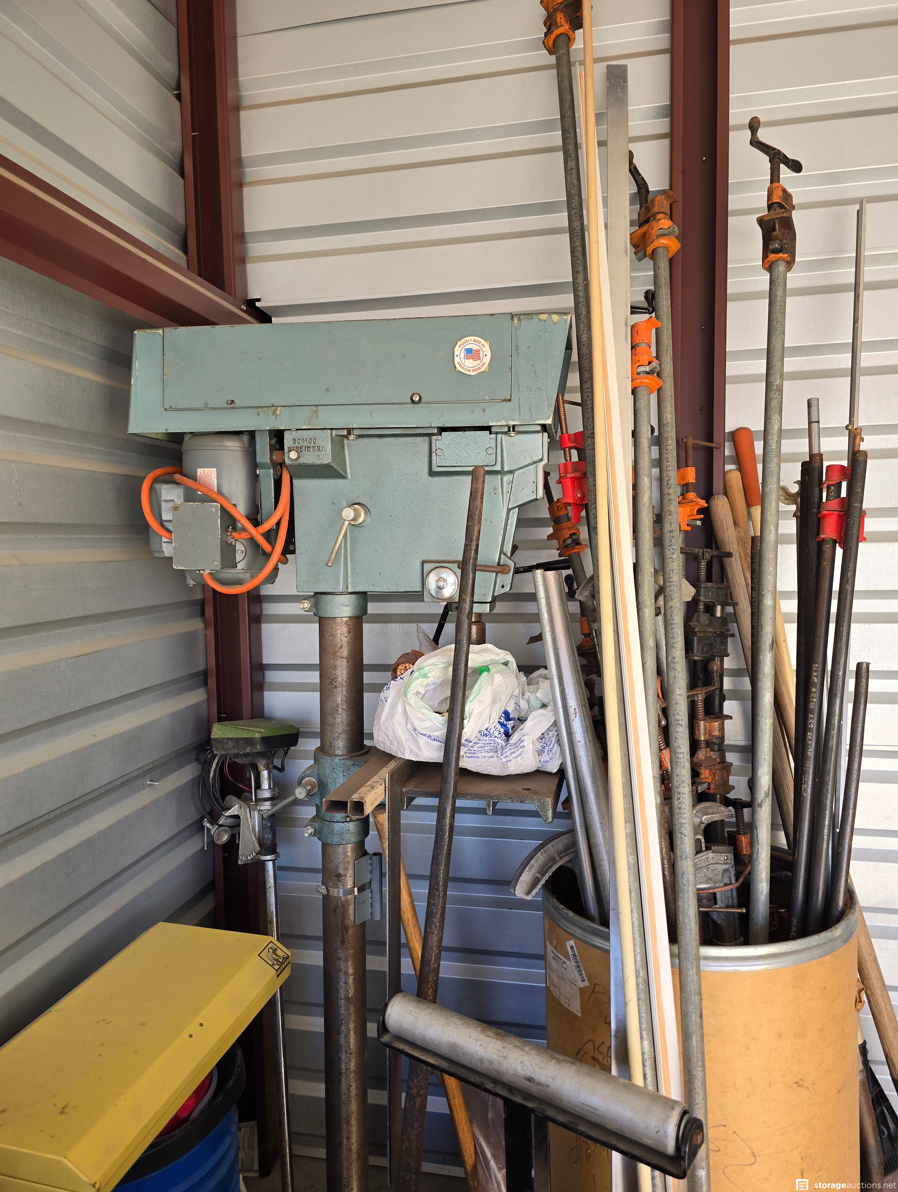 Tools, drill press, Fish tank and all things needed to use it. Concrete mixer, Woodworking tools in cases, multiple tool boxes, Fan, nice white shelf, sanding blades never used. shop mates and much more.