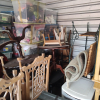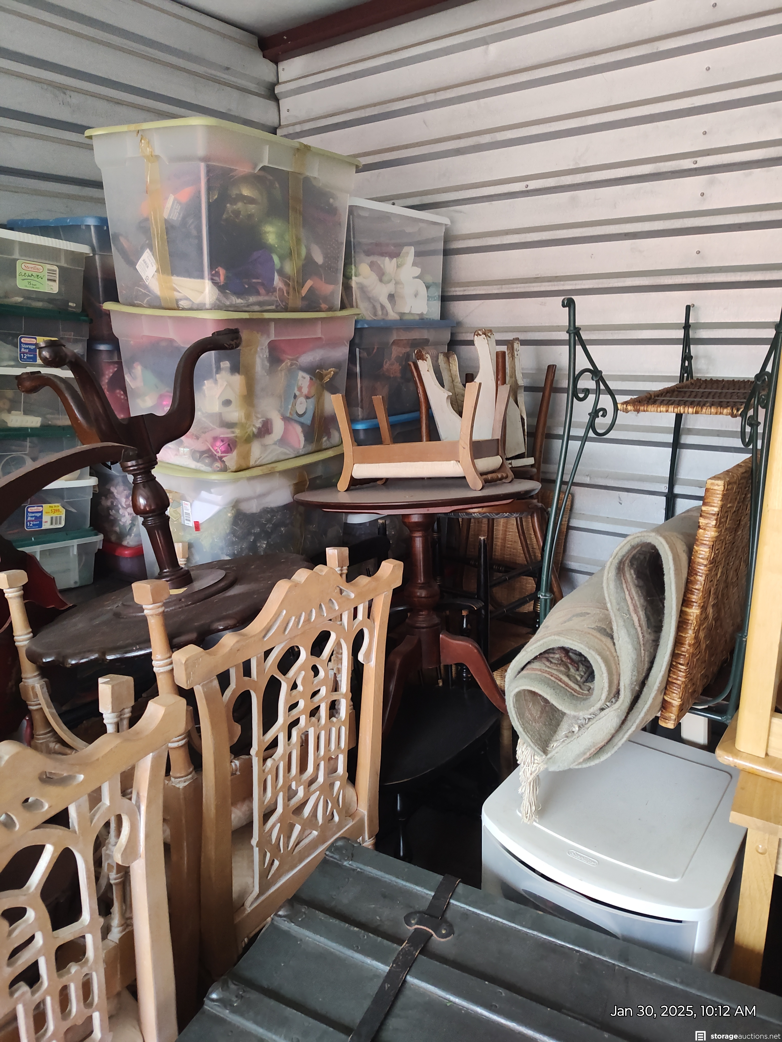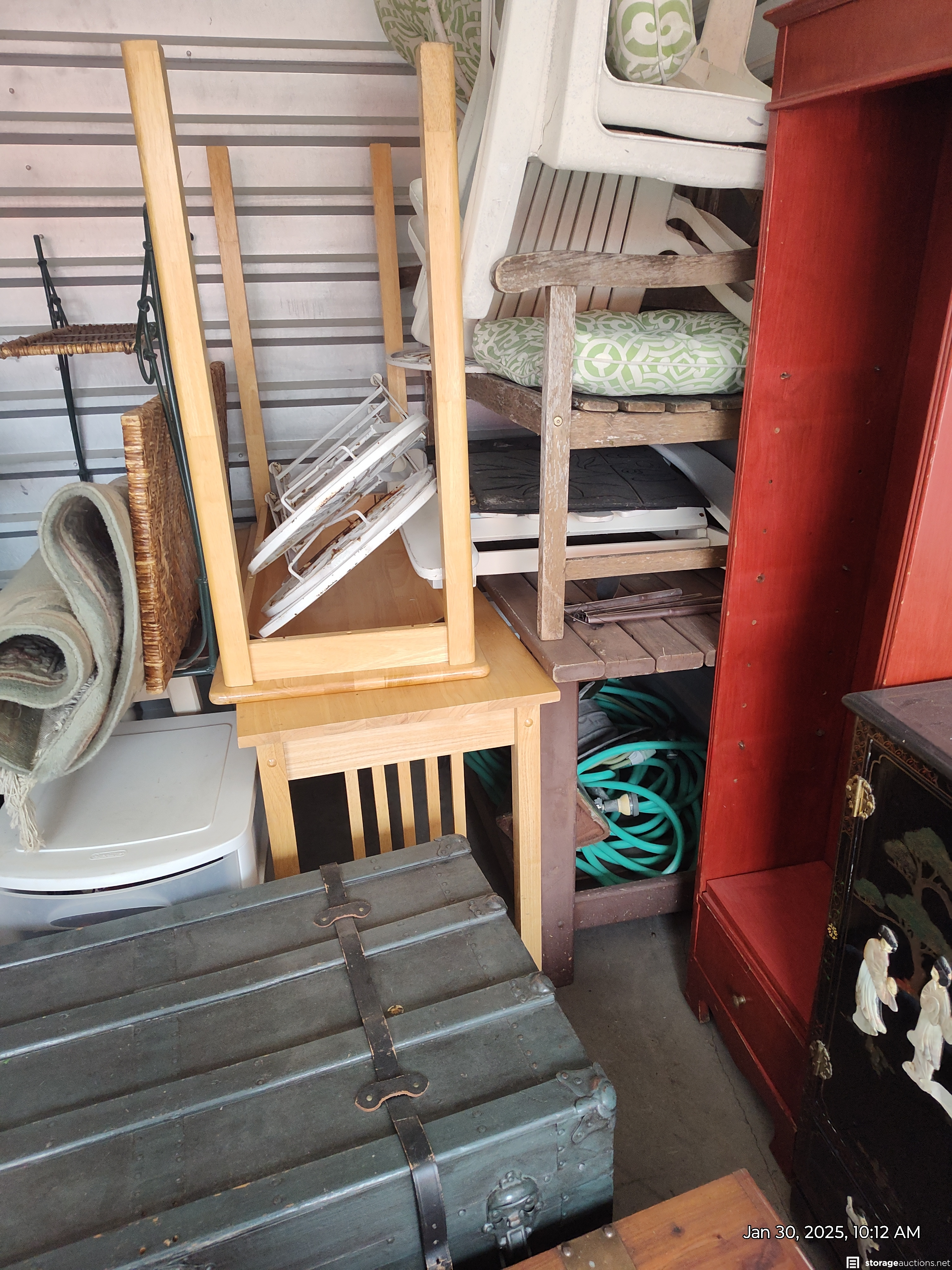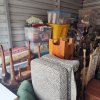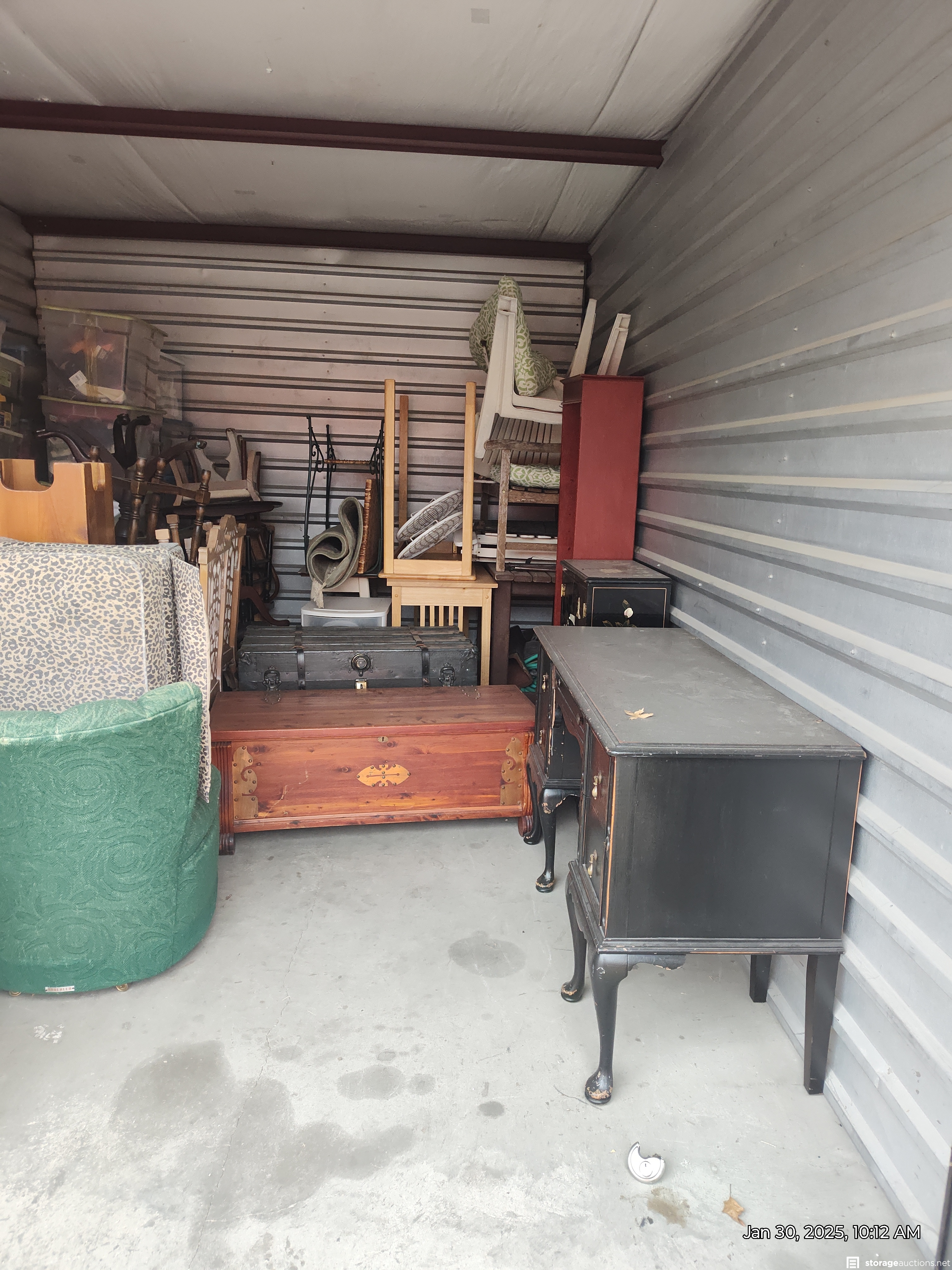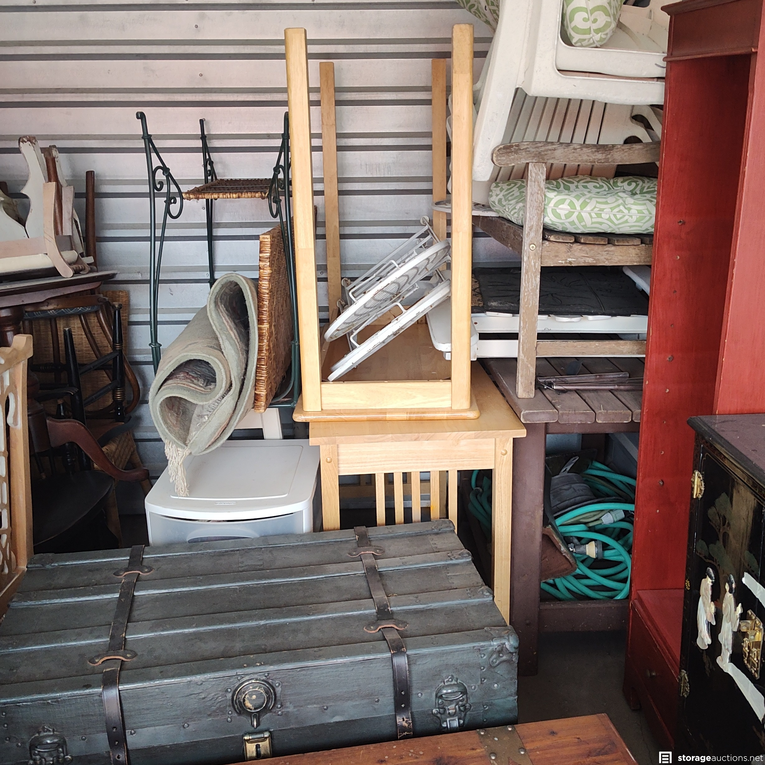 This unit has desk, trunks, chairs, totes, dresser, tables