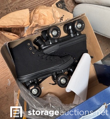 2 SEATS FROM A TAHOE POSSIBLY - TOTE, BOXES, SHOES, AND ROLLER SKATES