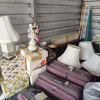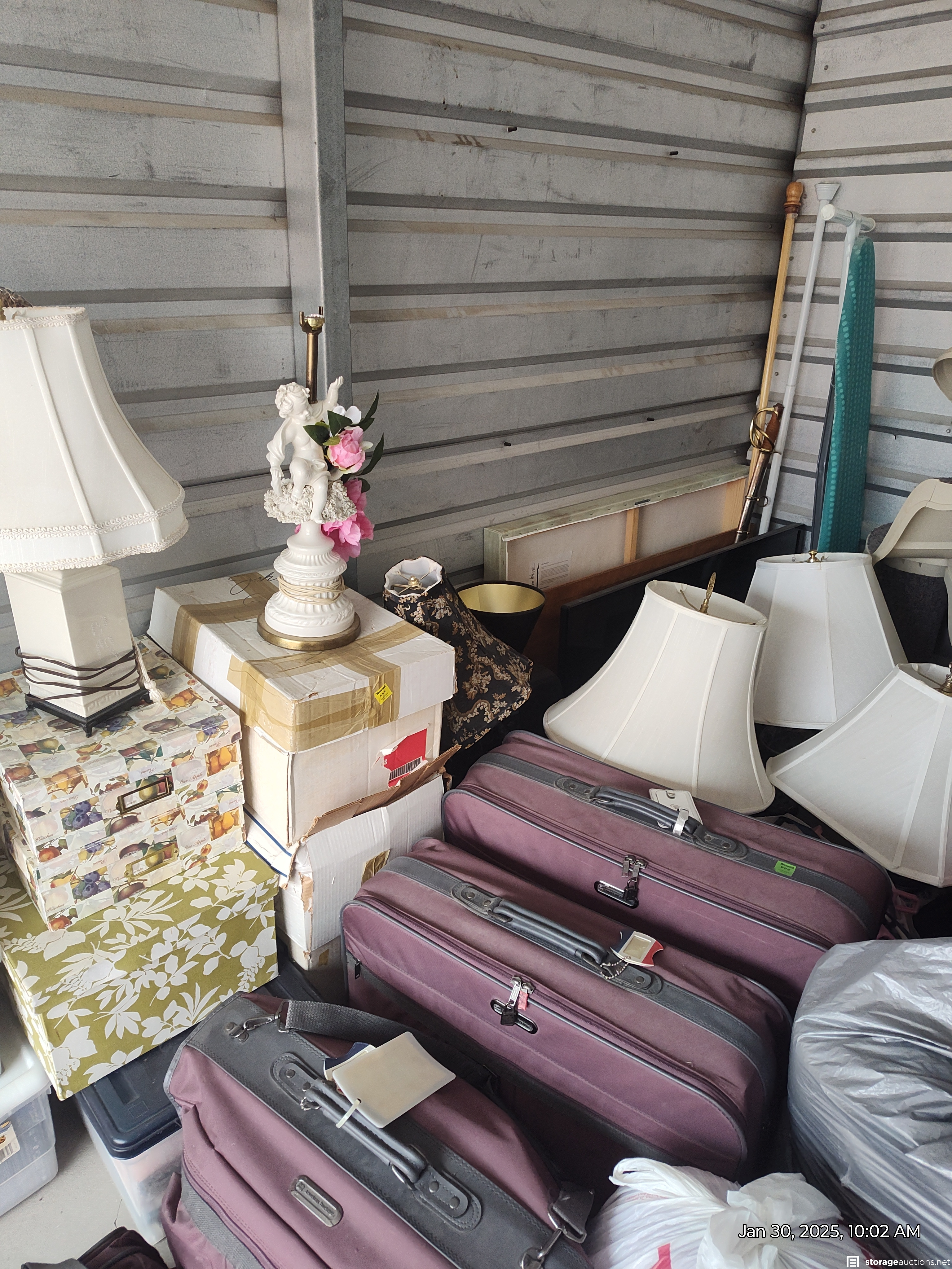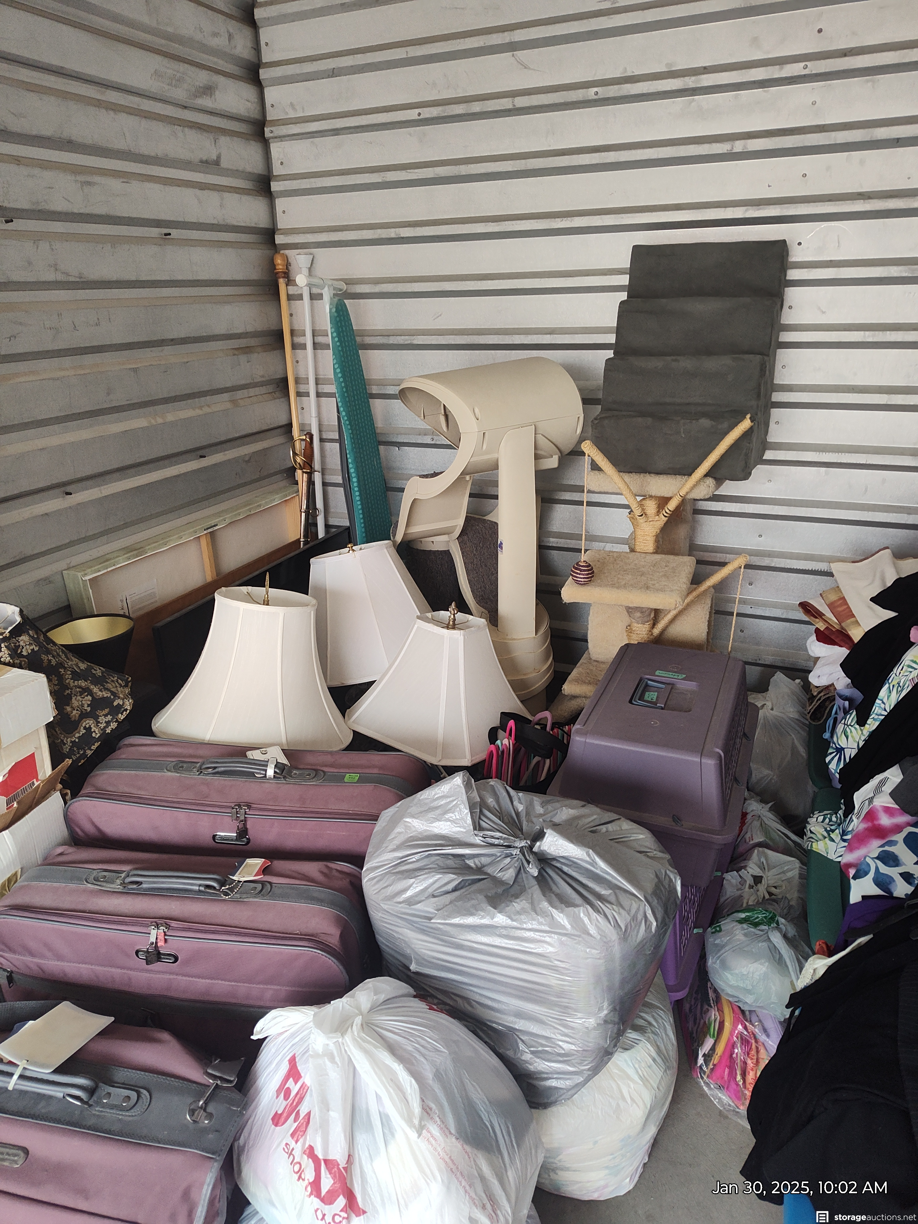 This umit has lamps, boxes, suitcases, bags, art, clothes, cat tree, books, magizines