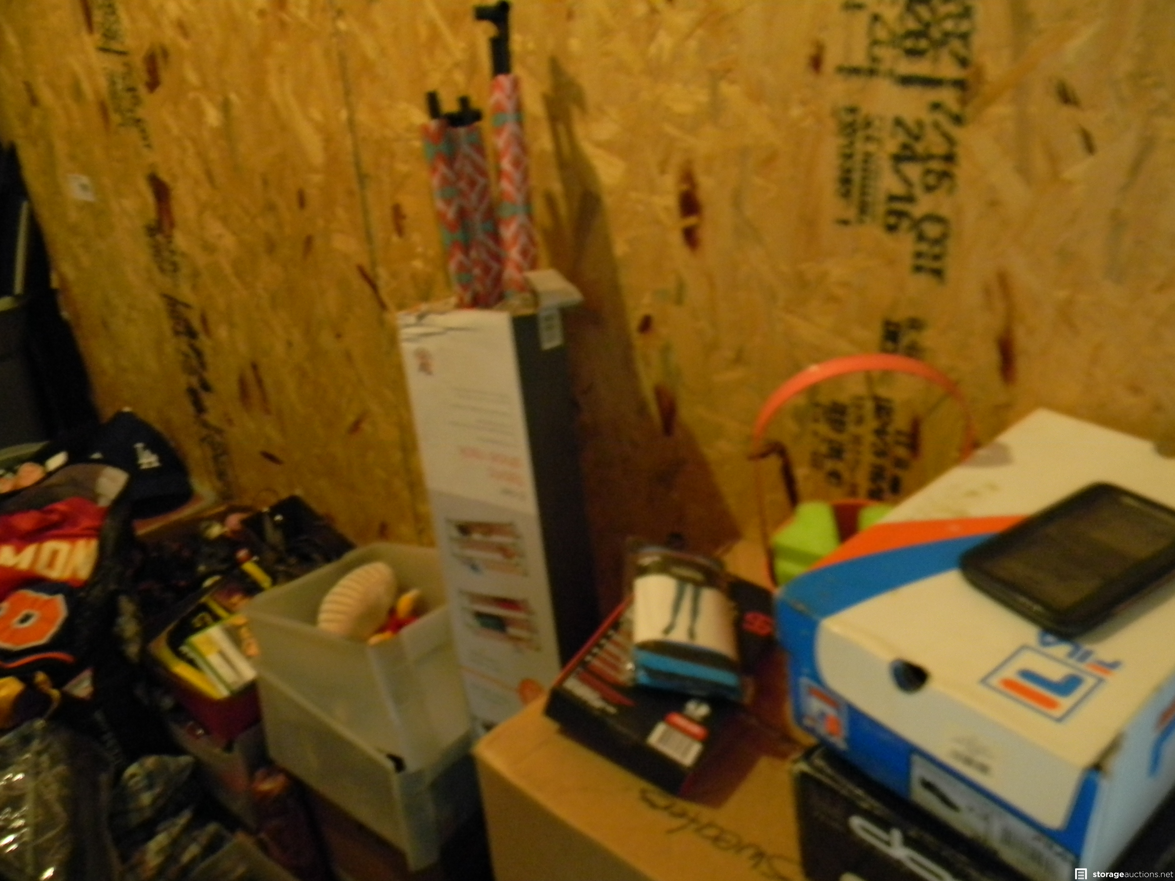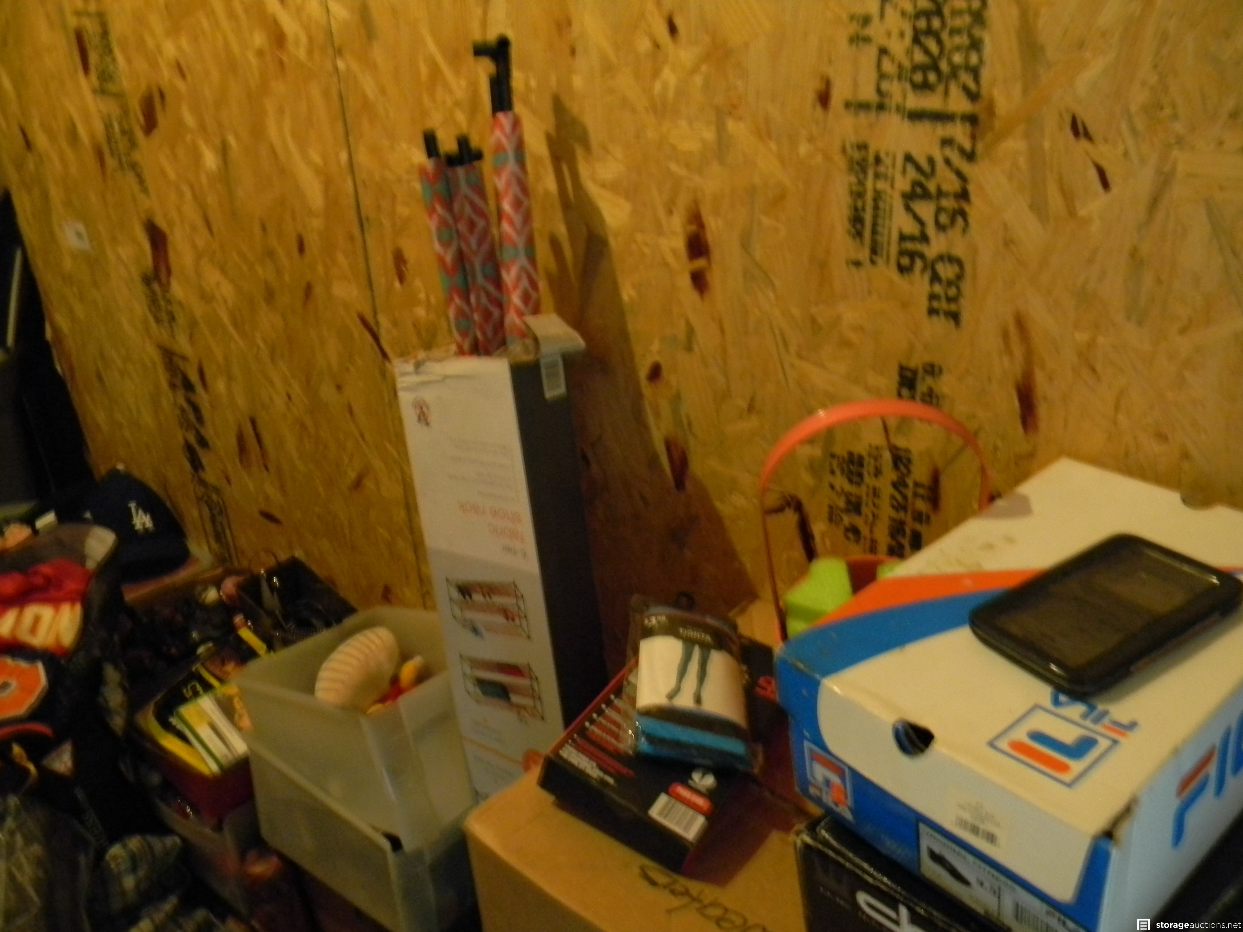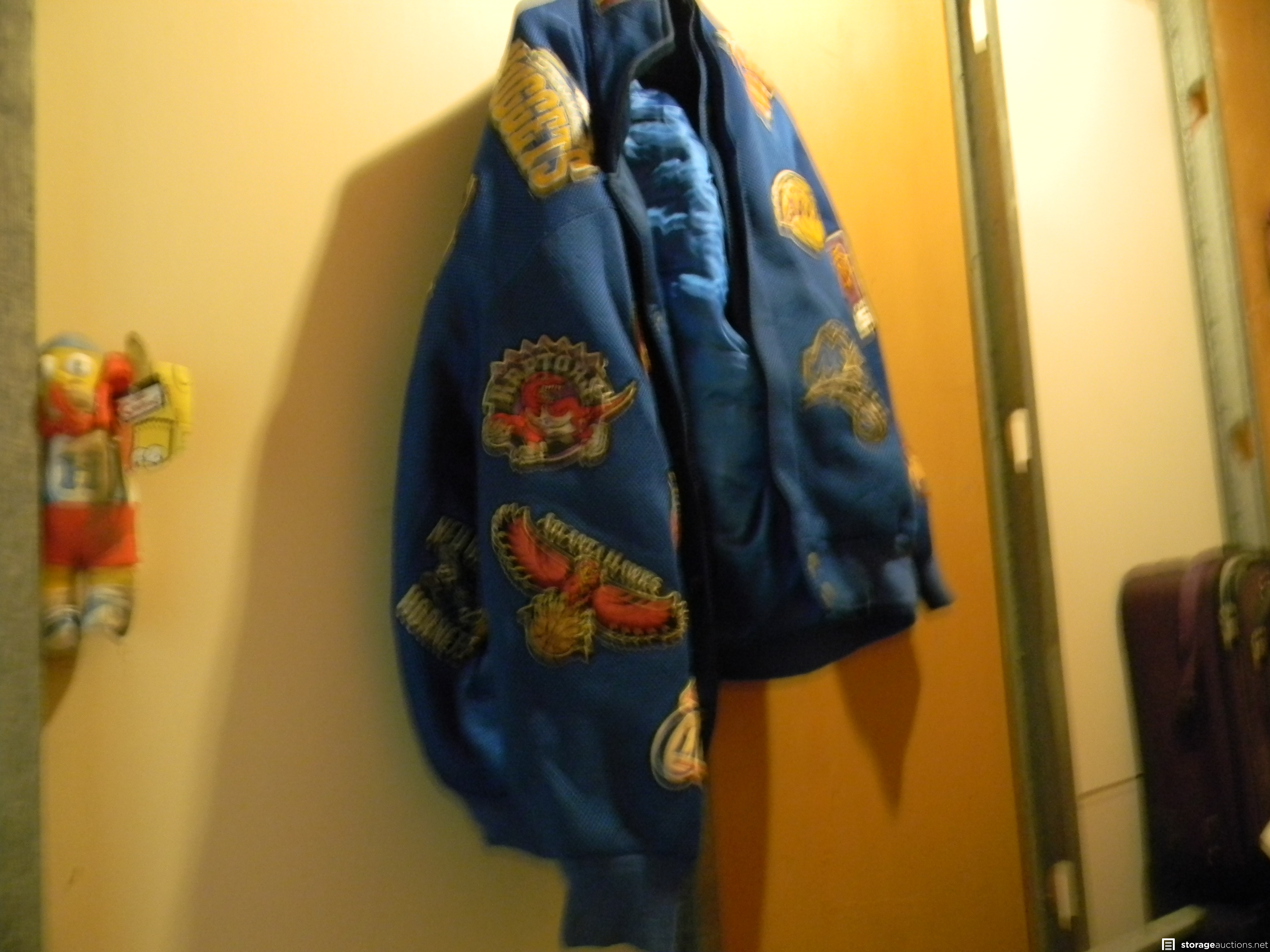 PRO JERSEY’S, PLASTIC FILE CABINETS, “LA” SPORTS JACKET, 4 PLASTIC BINS, SHOE BOXES, SIDE TABLE, SPORTS HATS, SHOES, PLUSHIES, BED IN A BAG, CLOTHING