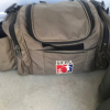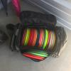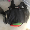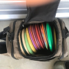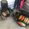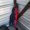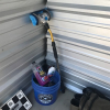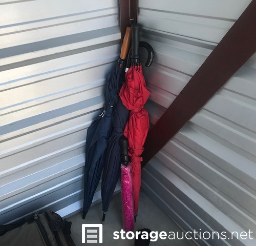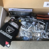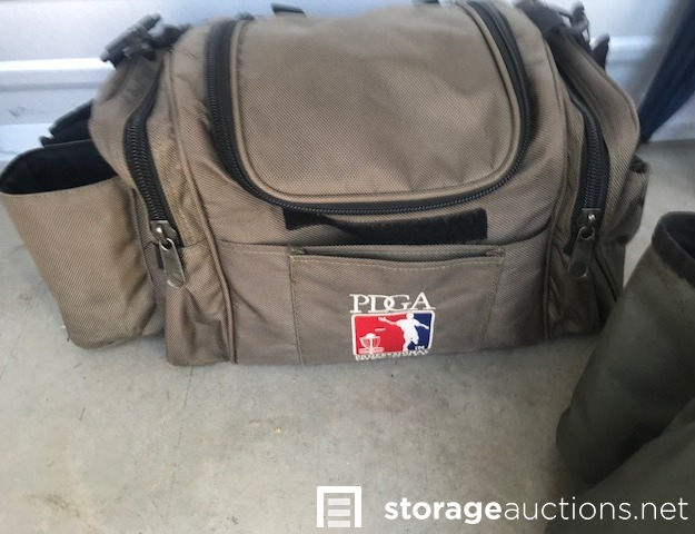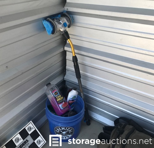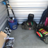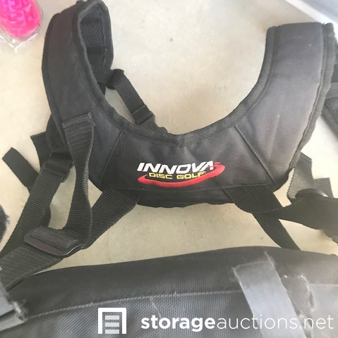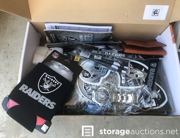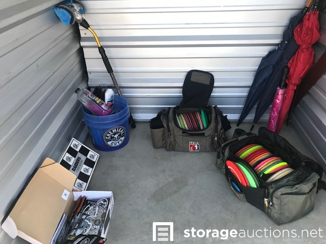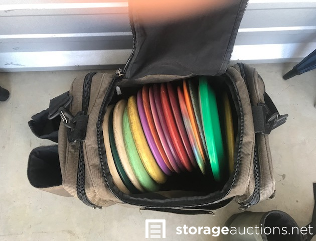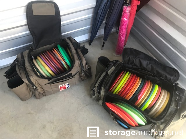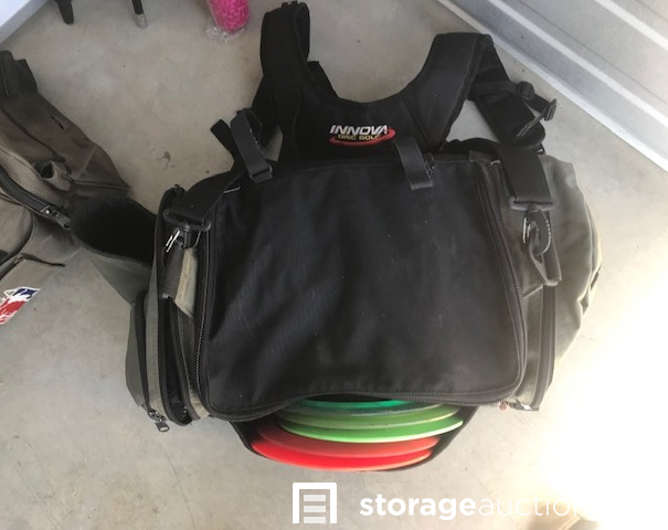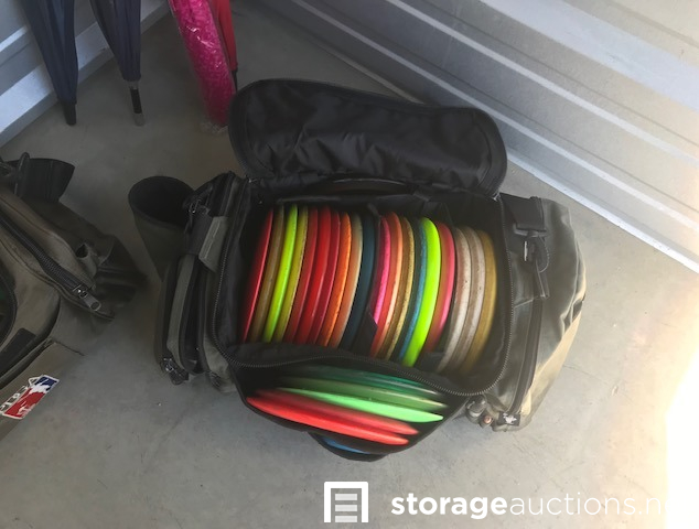 Oakland Raiders memorabilia, Disc golf backpack and bag full of discs, car washing supplies, and umbrellas.
