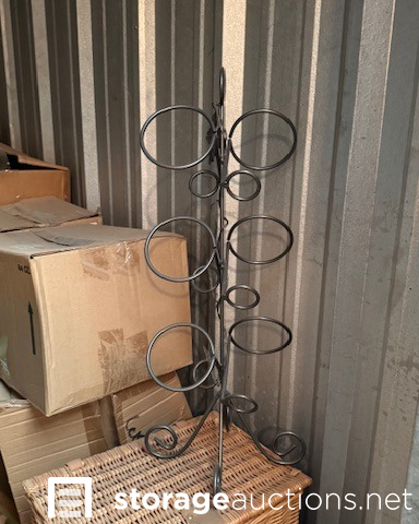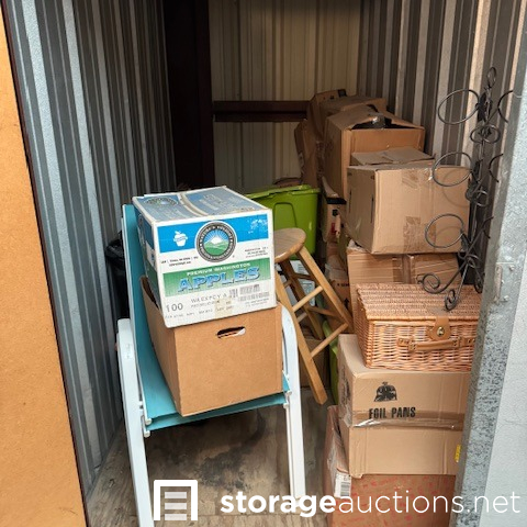 THIS UNIT HAS LOTS OF BOXES, 2 LAWN CHAIRS, WINE RACK, BAR STOOL, AND TV TRAYS