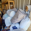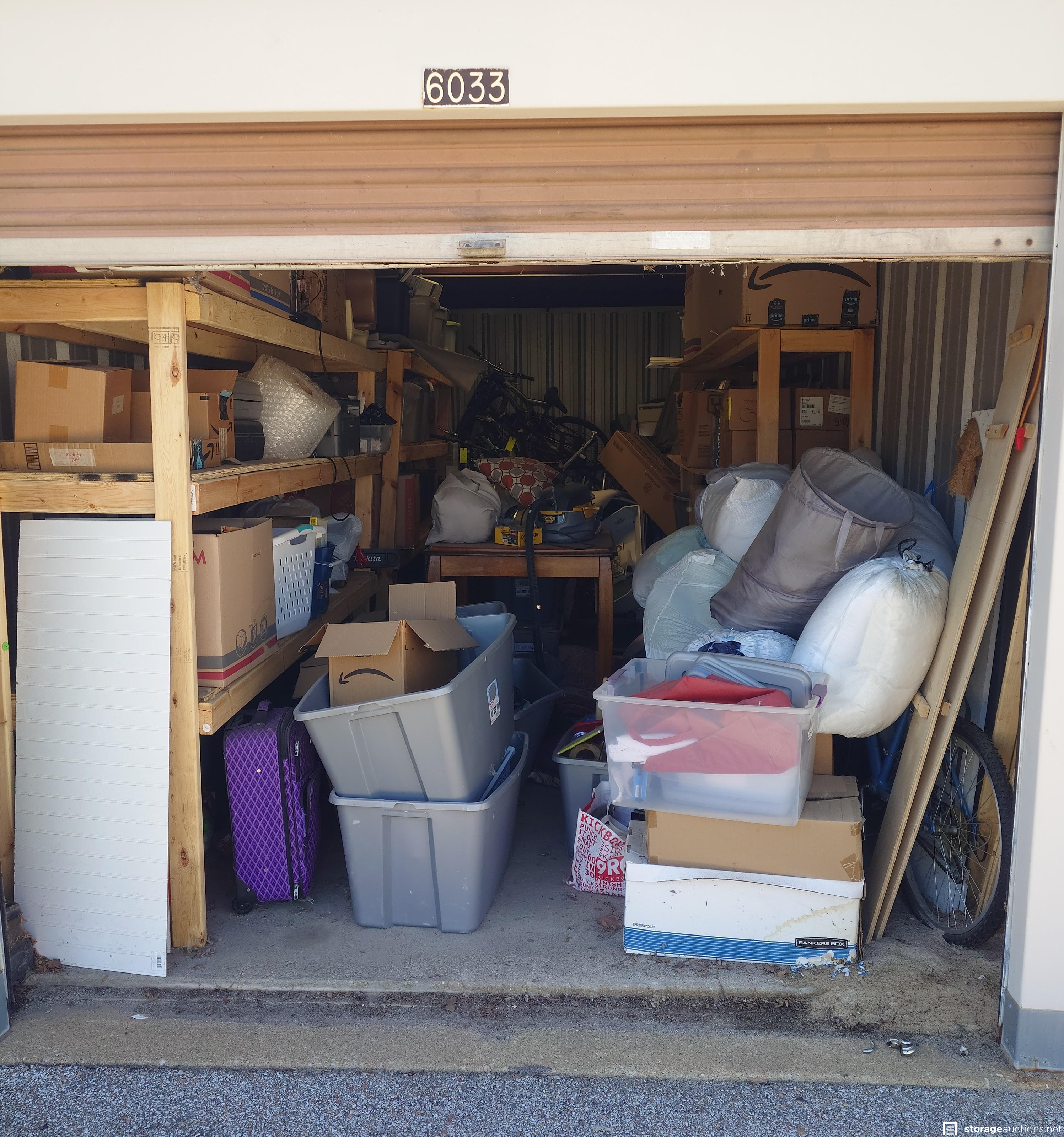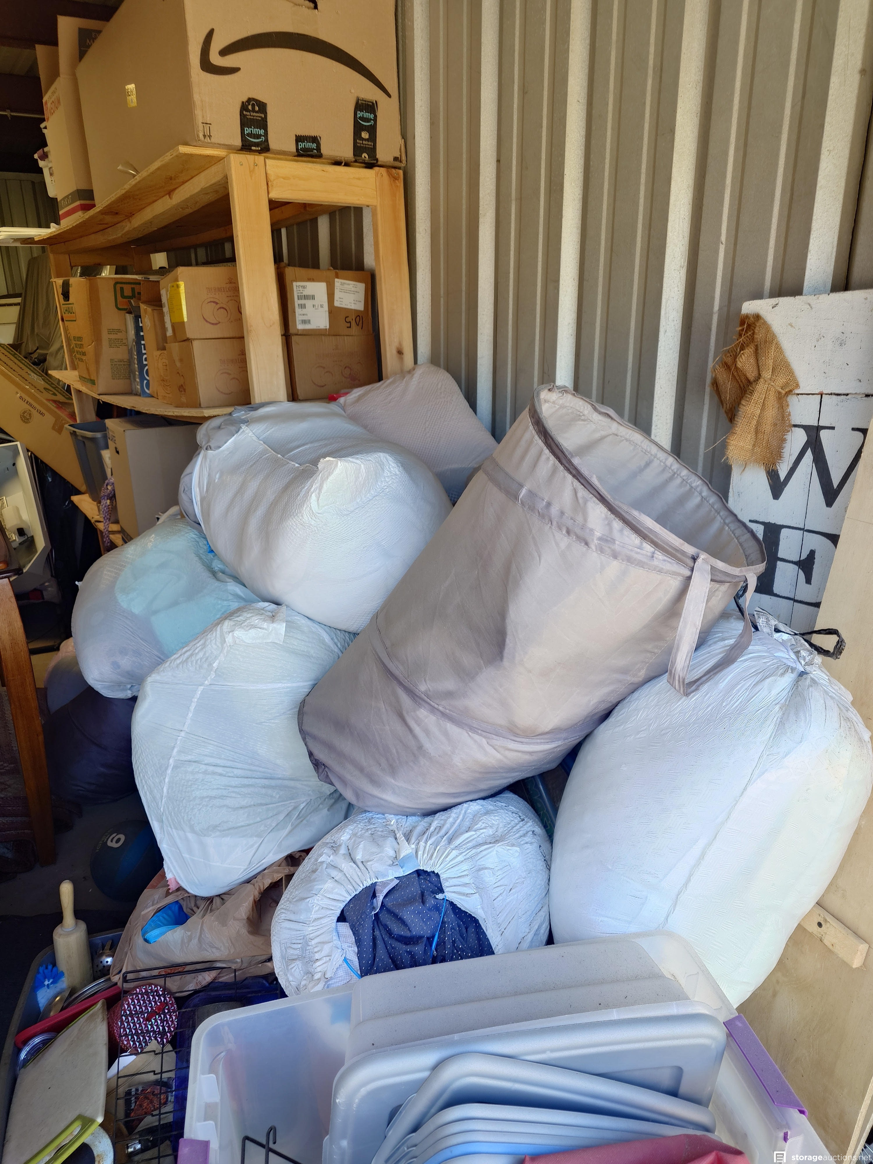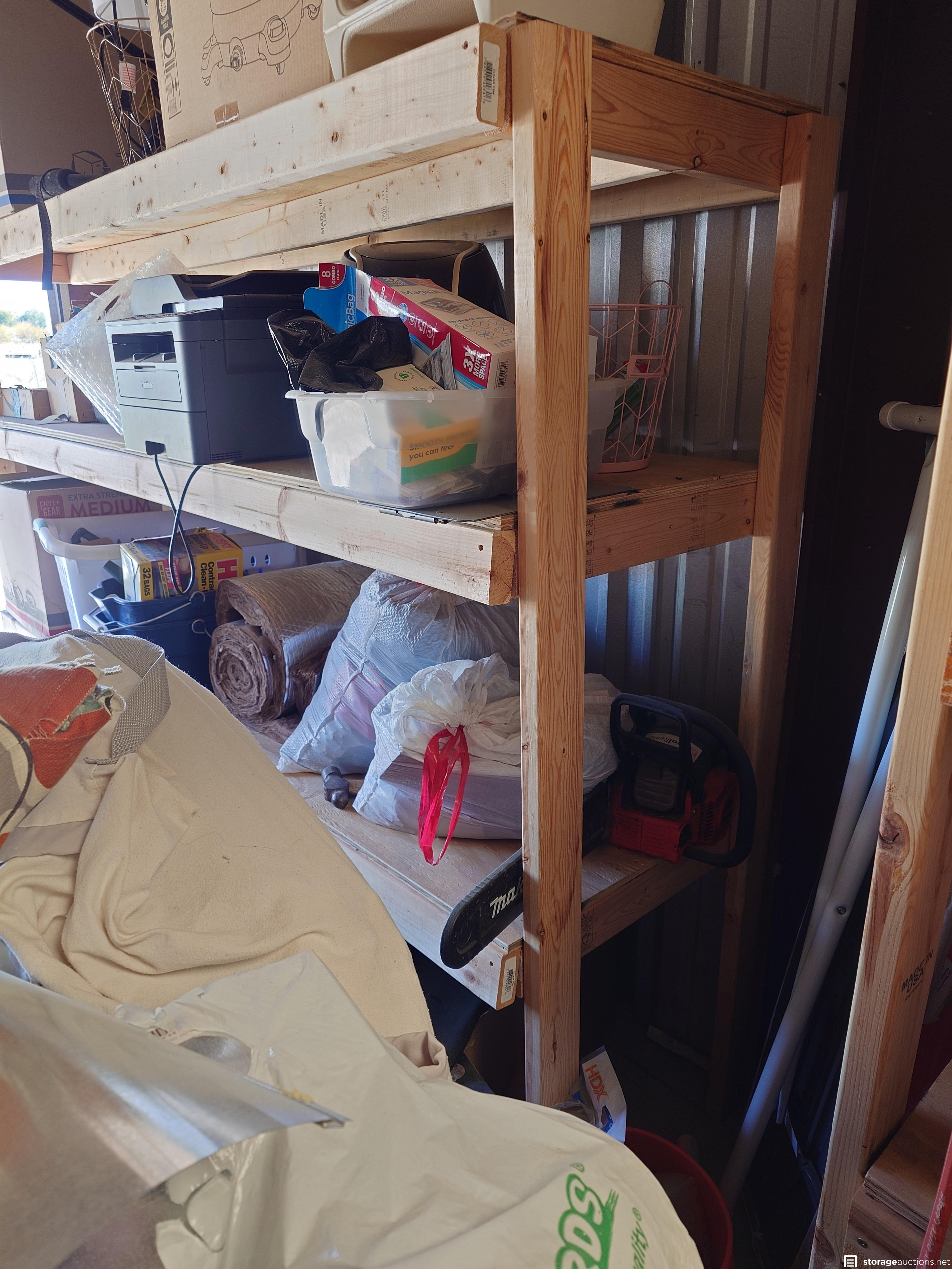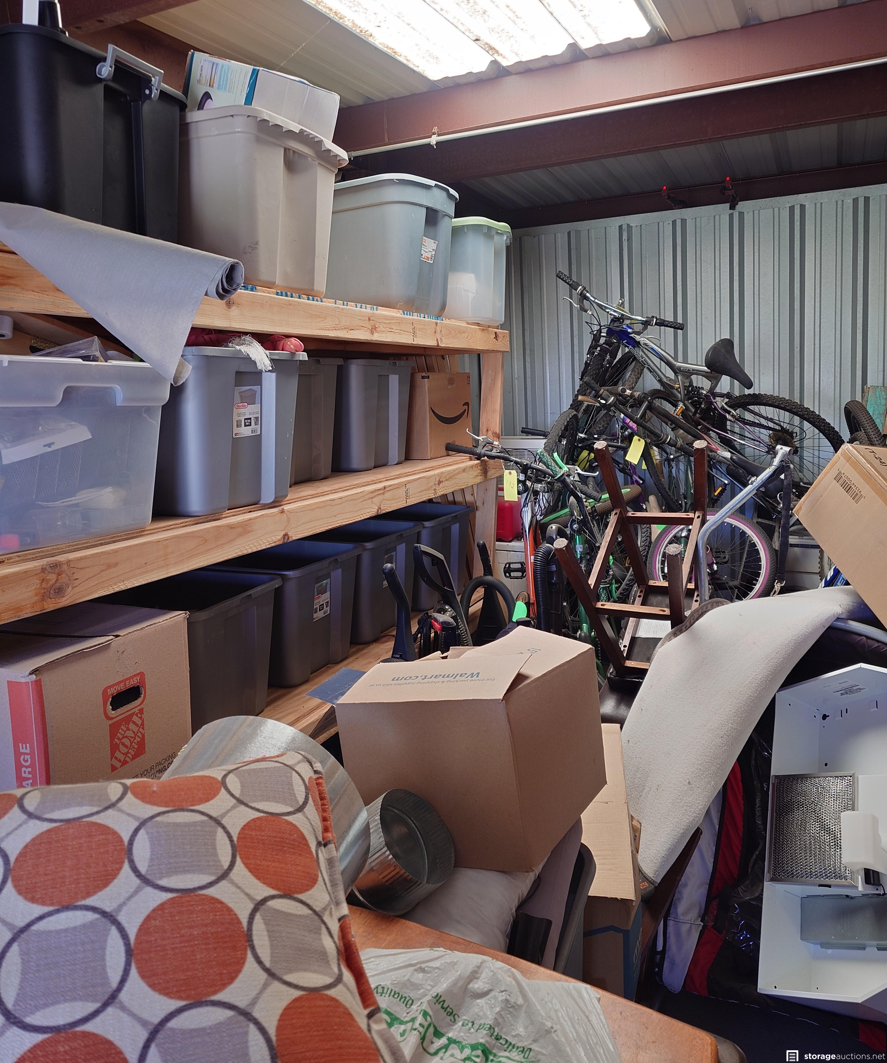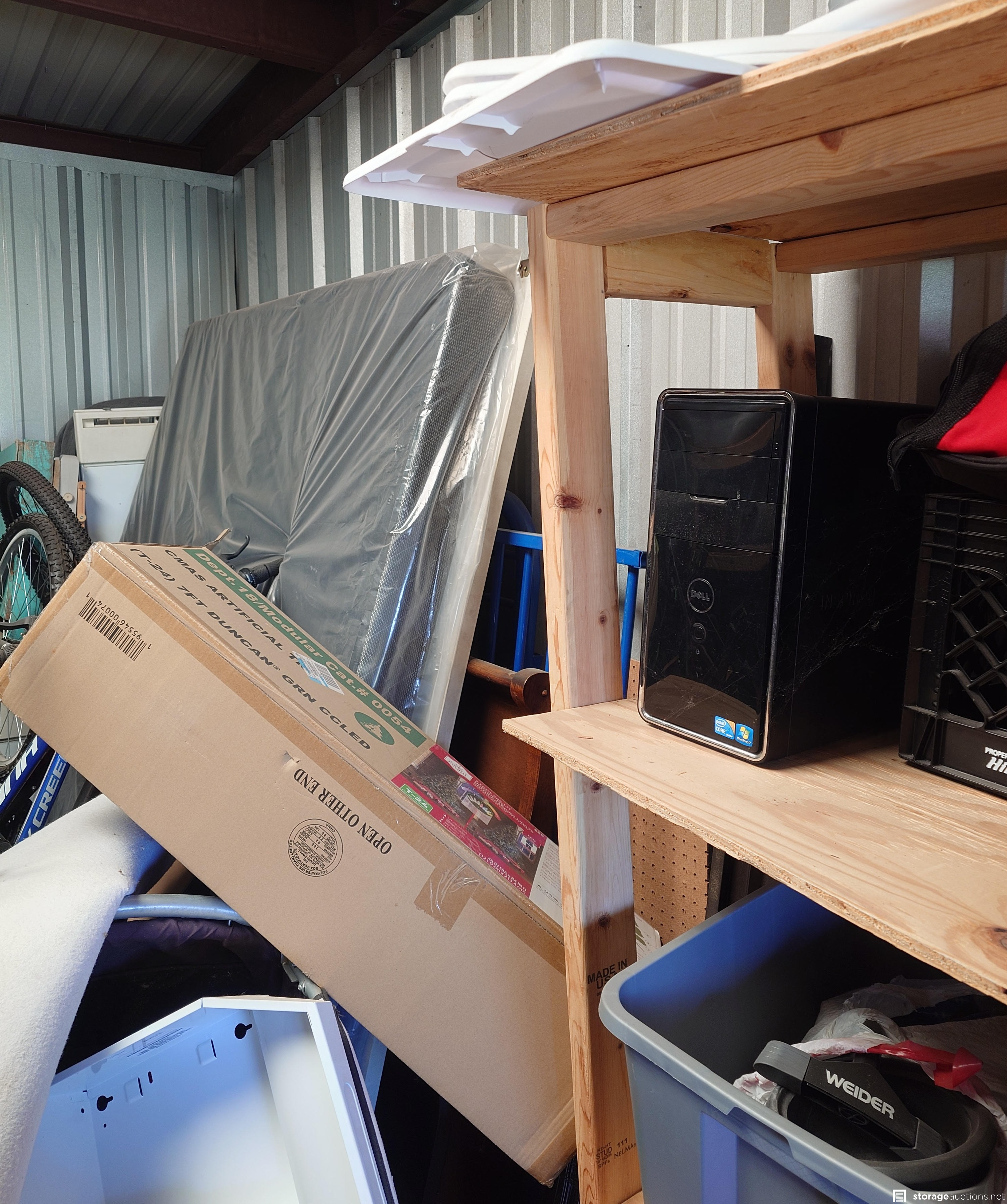 THIS UNIT HAS LOTS OF BOXES, TOTES, BAGS, BICYCLES, WOODEN SHELVES, HOME DECOR, MATTRESSES, CHAIN SAW, PRINTER, AN UNOPENED TREE CHRISTMAS BOX AND MISC.. ITEMS