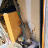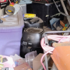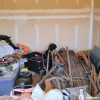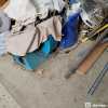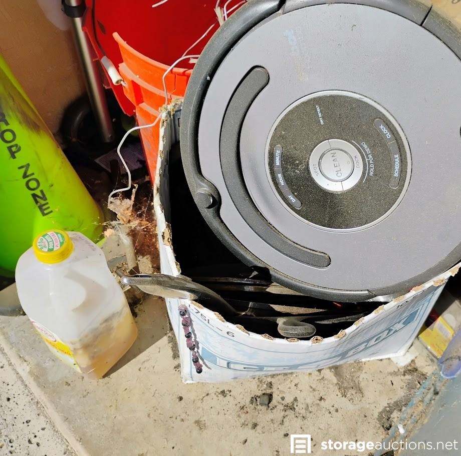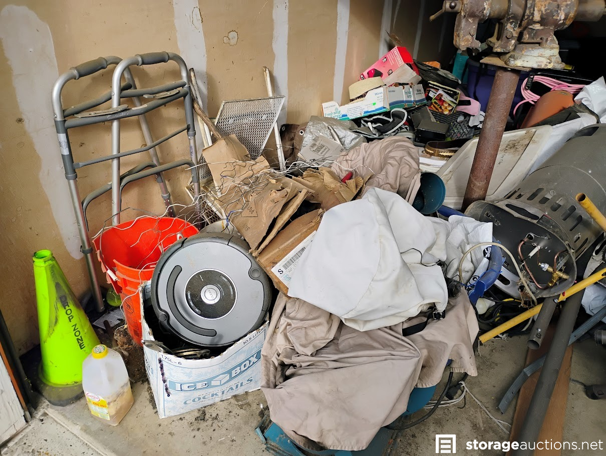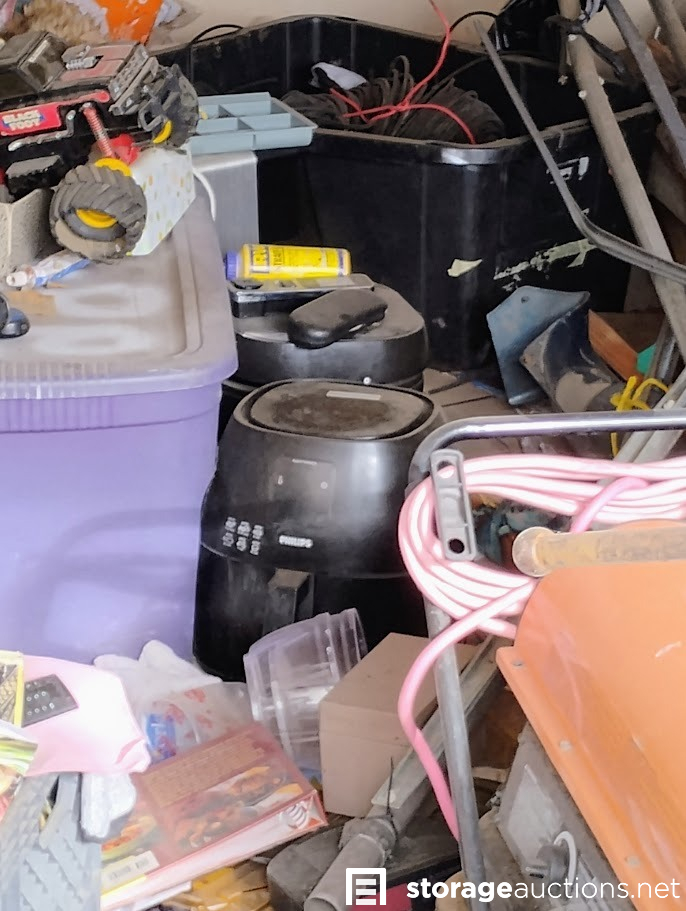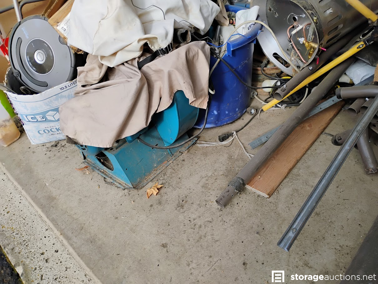 WHAT YOU SEE IS WHAT YOU GET. Things seen from the doorway: green safety cone, Roomba robot vacuum, electric motor(?) or dust collector(?), walker, orange bucket, cast iron skillets, standing vice, hat, tire chains, books, 2 air fryers(?) radiant heater, various bins, totes, and boxes, halogen lights on stand, wood, various metal posts and poles, R.C. truck, View Master booklet (?), hard truck bed cover, various tools, AMES drain spade, wood cabinet, tarps.