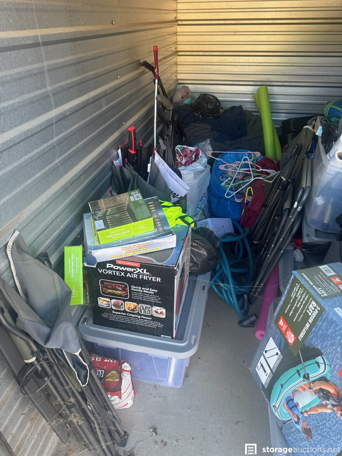 Camping chairs, boxes, tubs, dog crate, inflatable boat, water hose, etc.