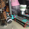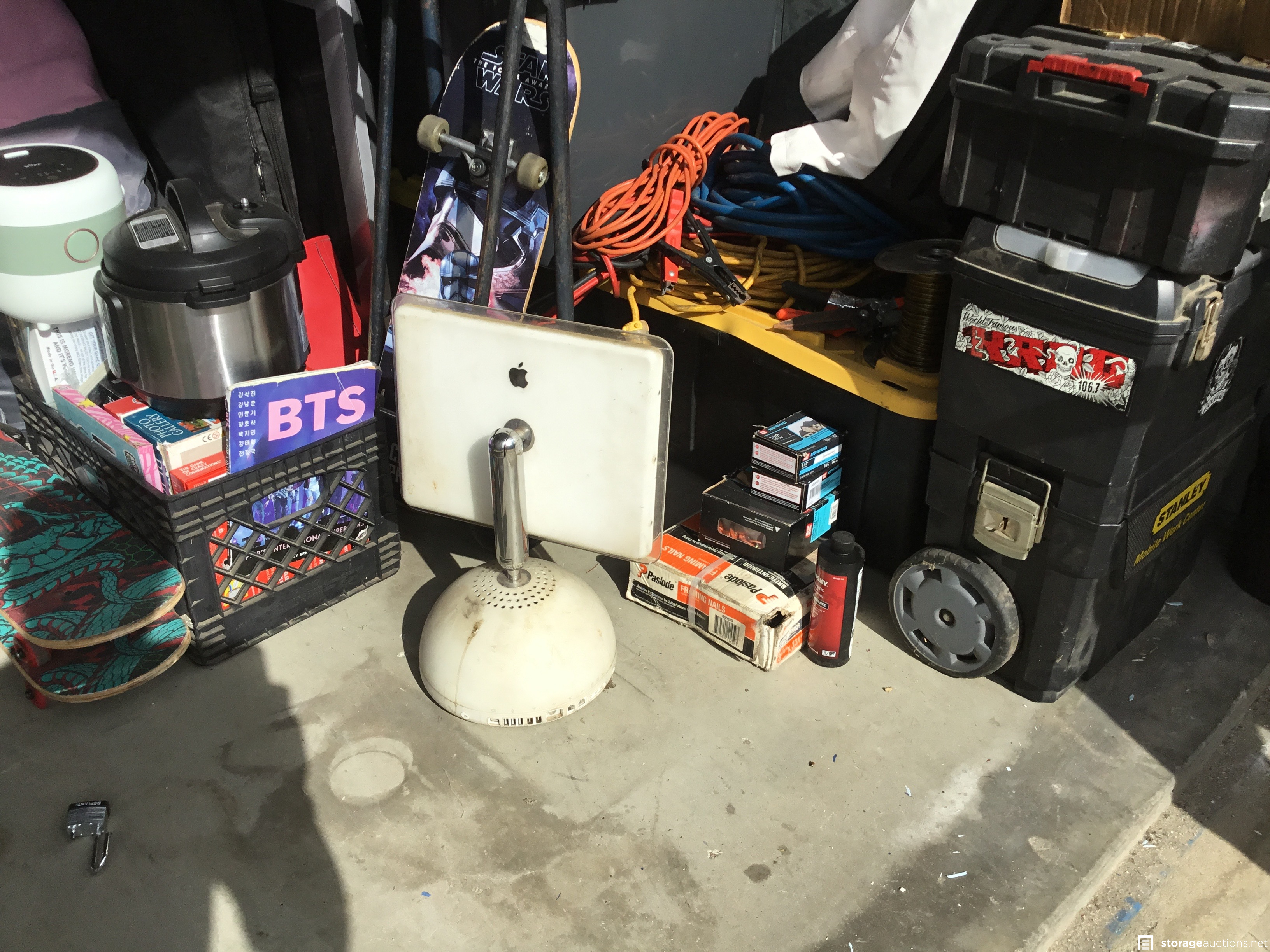 Rolling tool case, 3 skate boards, kids basket ball court, coffee makers, plants, apple computer, razor scooter, hover board, hampers, chairs, dvd player, wall art