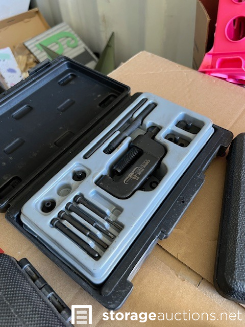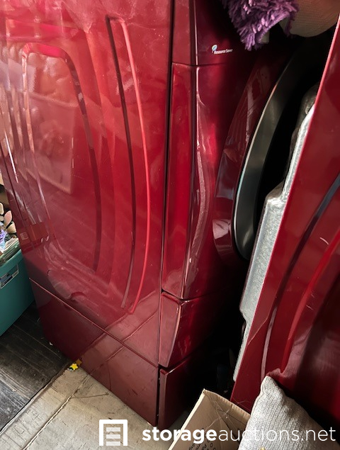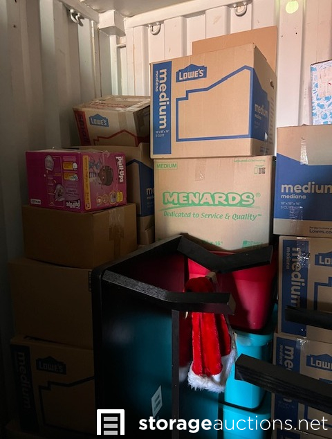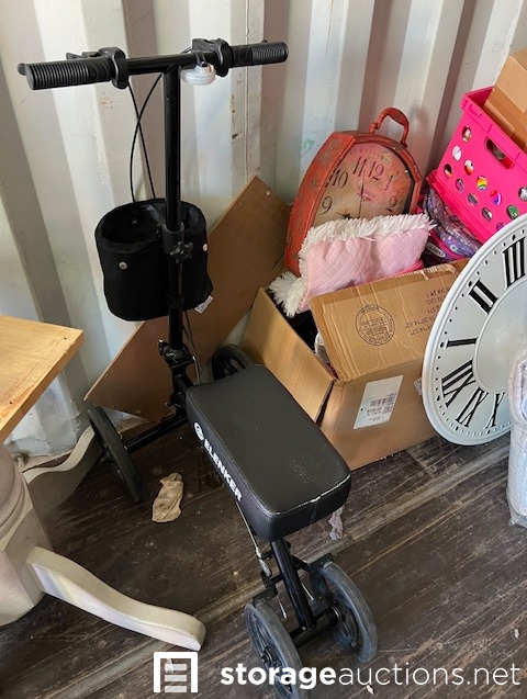 This unit has a lot. There is a round table w/2 chairs, tv with stand, 2 twin mattresses, wall decor, clothes, bedding, clocks, knee scooter, razor kids scooter, end tables, coffee tables, bedside dresser, designer bags, front load washer and dryer with storage drawer base, and some tools.