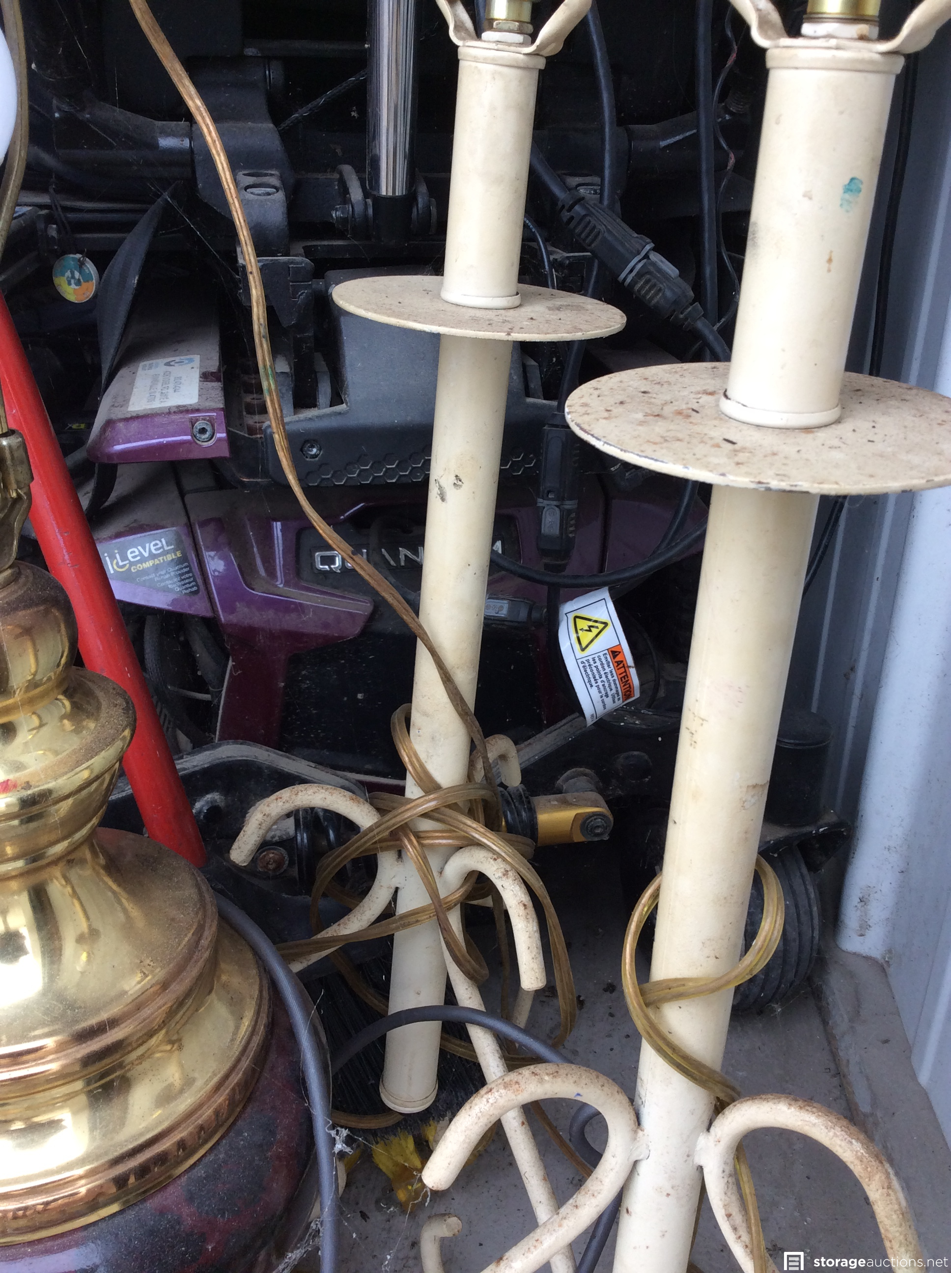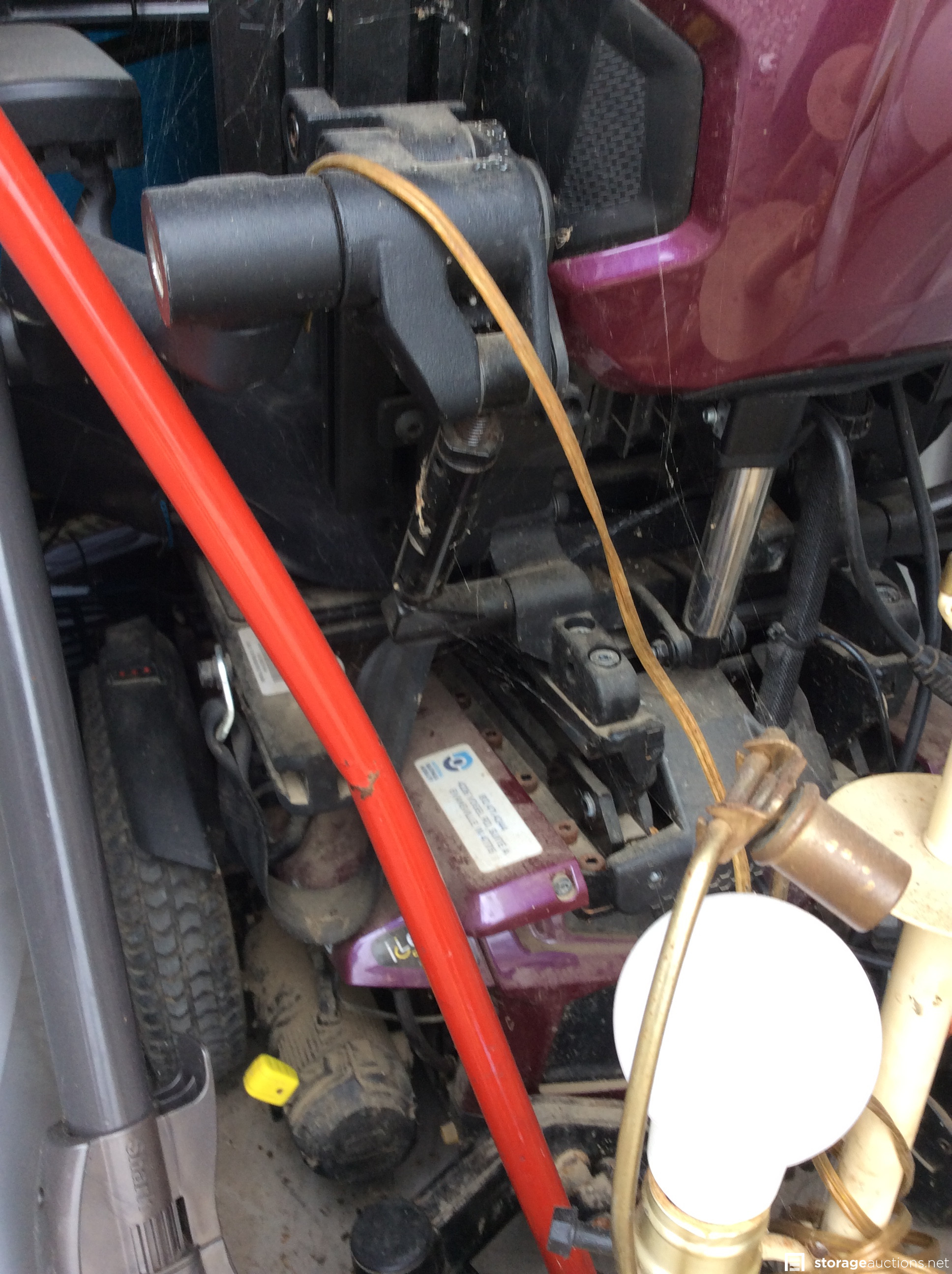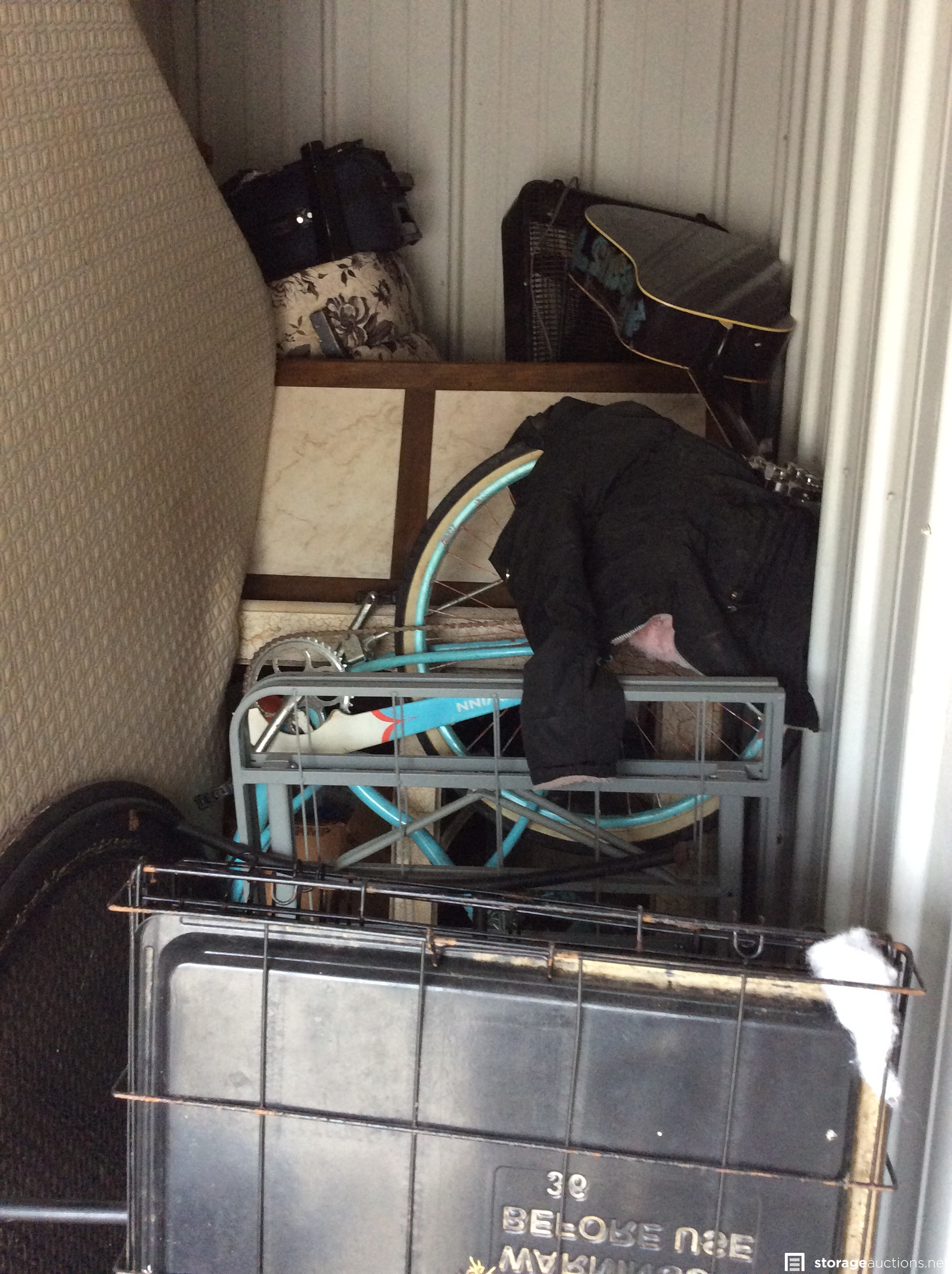 Quantum motorized wheel chair, lamps, dryer,guitar, bike, furniture, suitcase, fan, small heater, possible metal bed frame, possible metal kennel, FULL unit and cannot see most of the contents