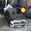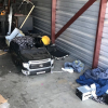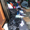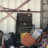 Tool chest, wood stove, clothing, tires, and chairs.