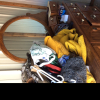 Dresser, canvas chairs, clothes, end table, holster?