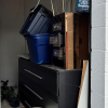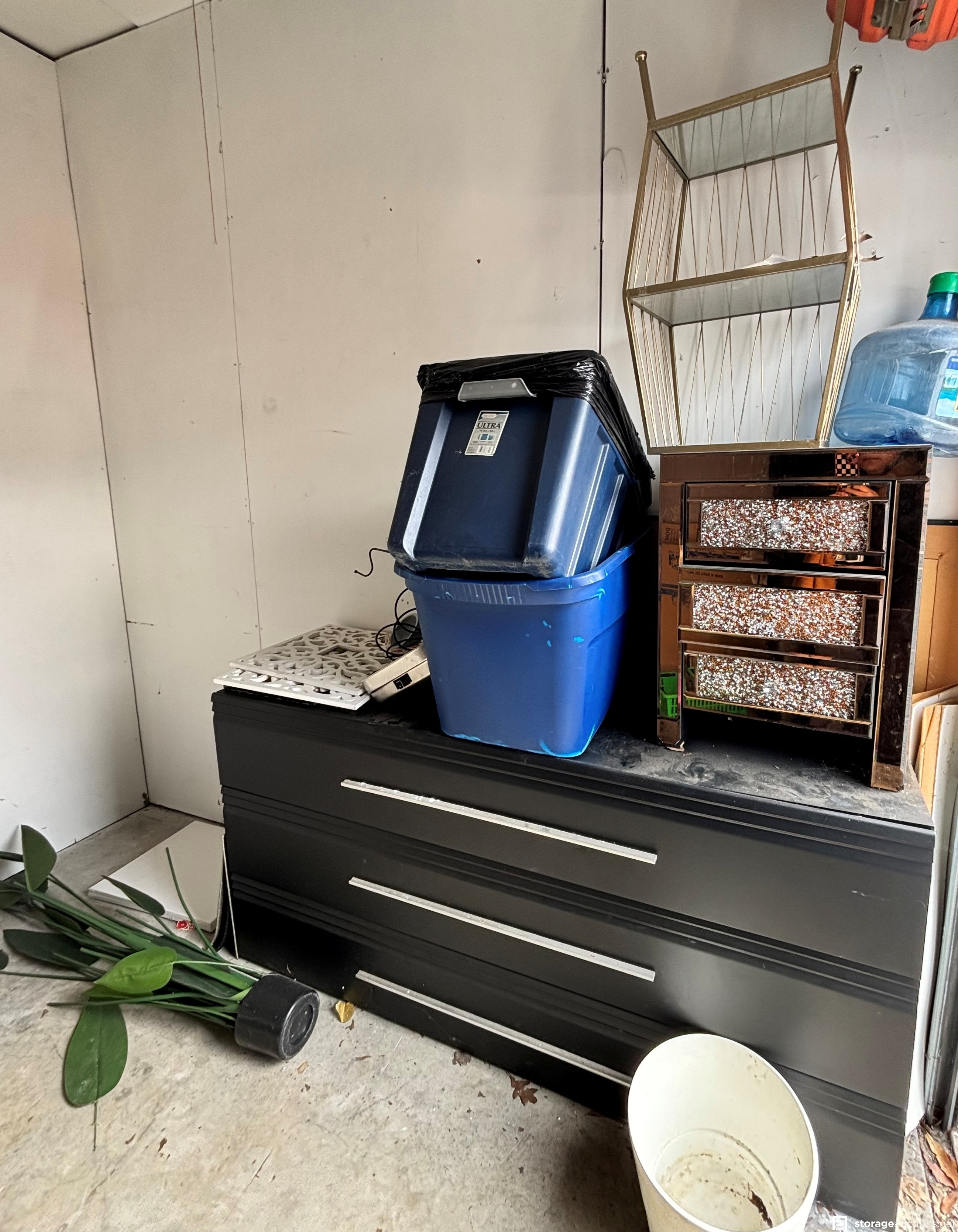 dresser, nightstand, plastic containers, heater and other miscellaneous items.