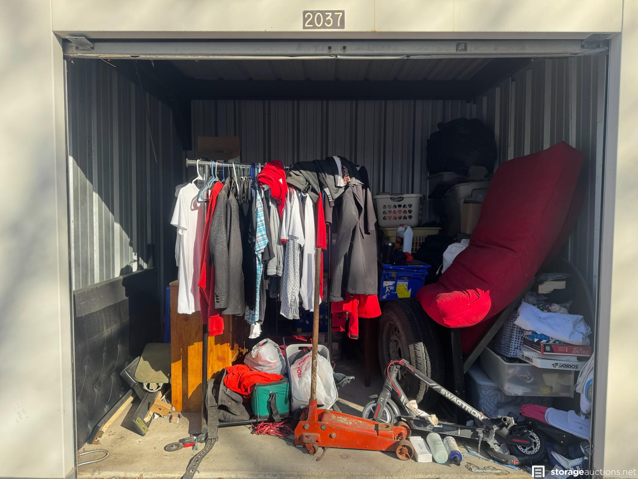 THIS UNIT HAS CLOTHES RACK, CLOTHES, HEADBOARD, FUTON MATTRESS, SCOOTER, FLOOR JACK, DRESSER, NIGHTSTAND, GAMES, TV, TOOLS, IRON, PICTURES AND TOTES AND BOXES