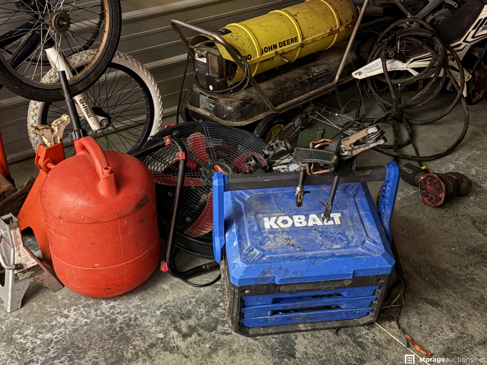 ROCKER, JOHN DEERE HEATER, BIKES, GAS CAN, TOOL BOX, AIR COMPRESSOR, MINI BIKES, MISC ITEMS