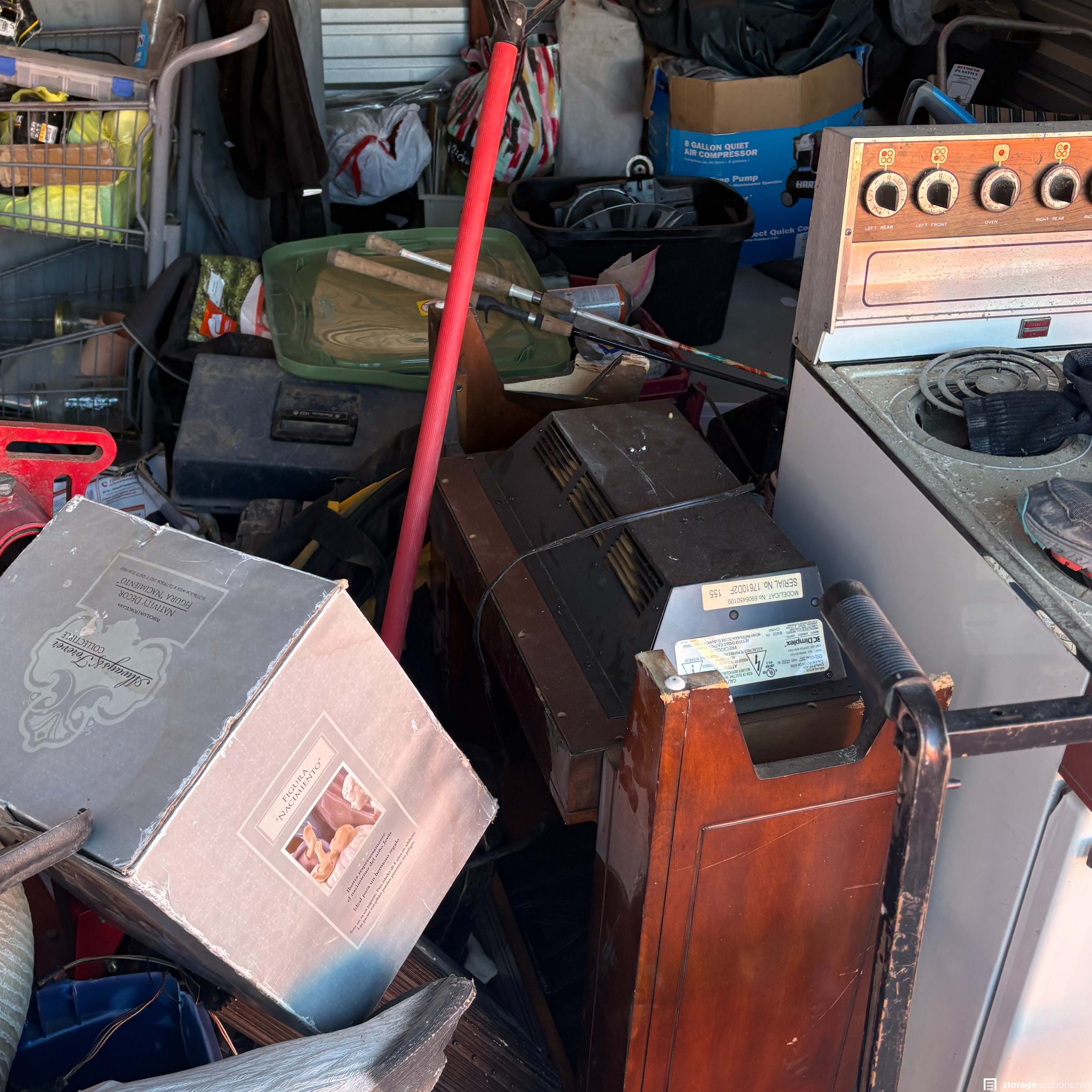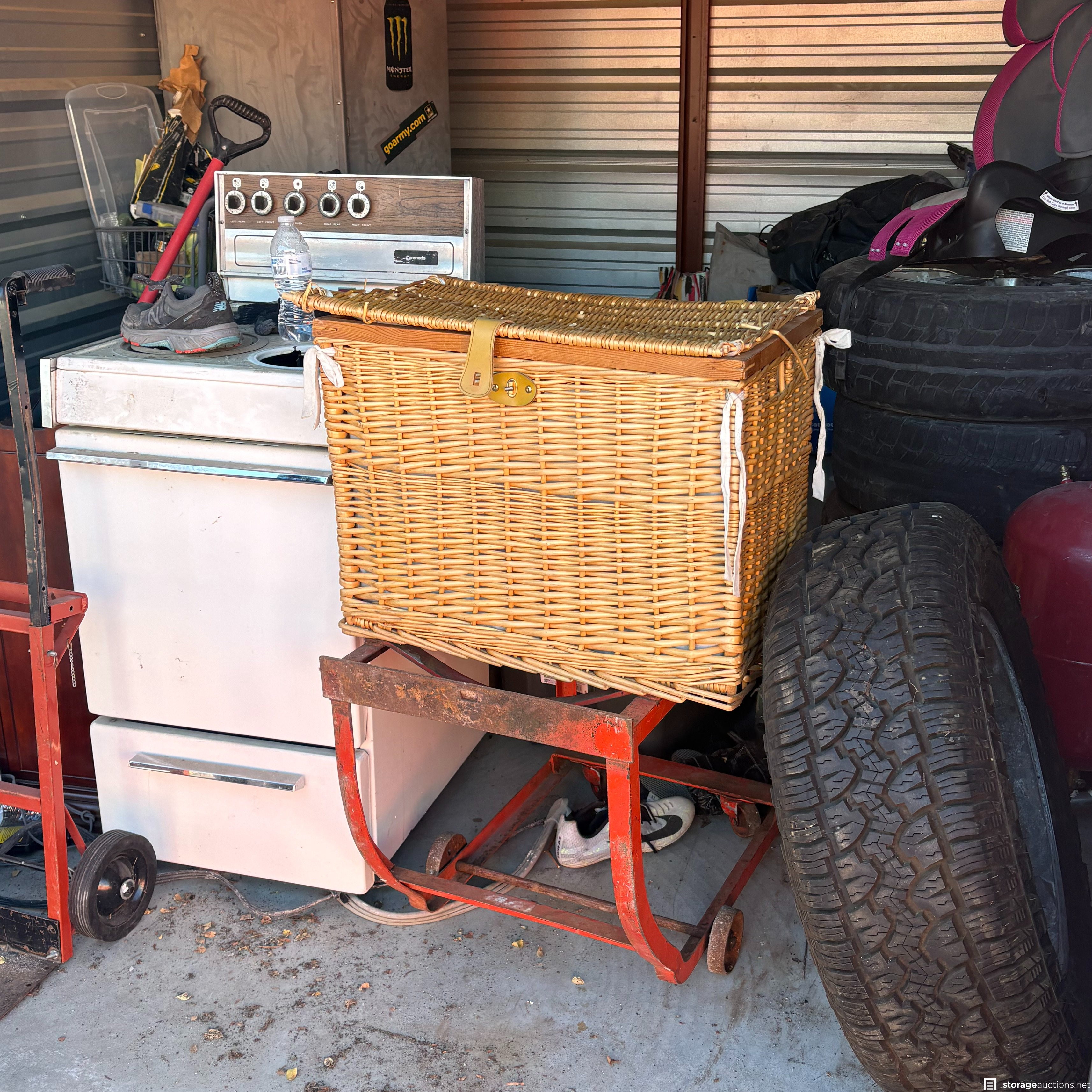 This unit has dolly, stove, tires, basket, locker, boxes, totes, bags