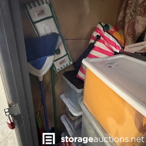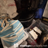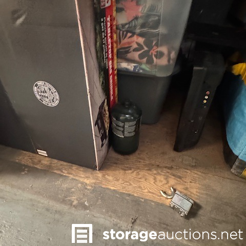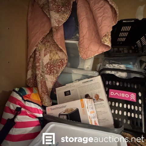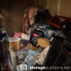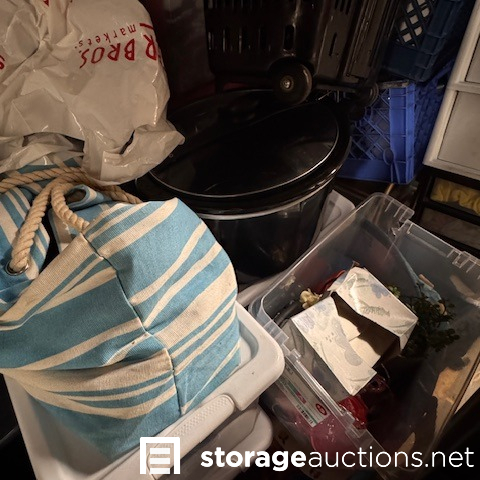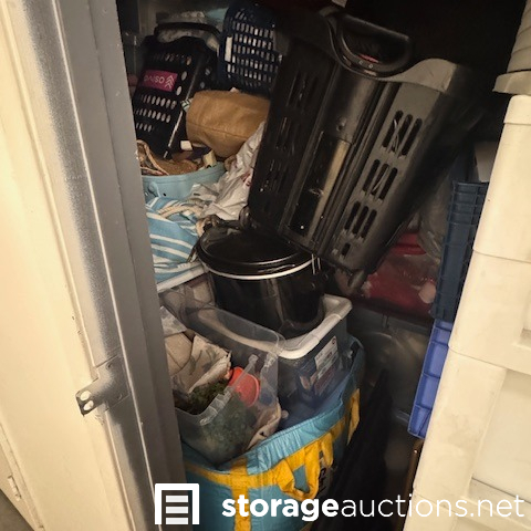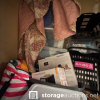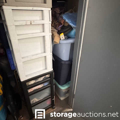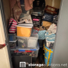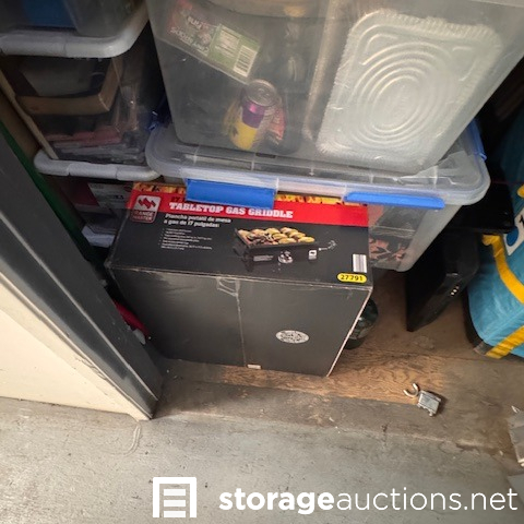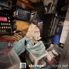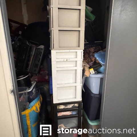 Inside second floor double door unit. This unit appears to contain, clothing, bedding, monitor, 20+ totes, gas griddle, kitchen items, basket, tv, misc items.