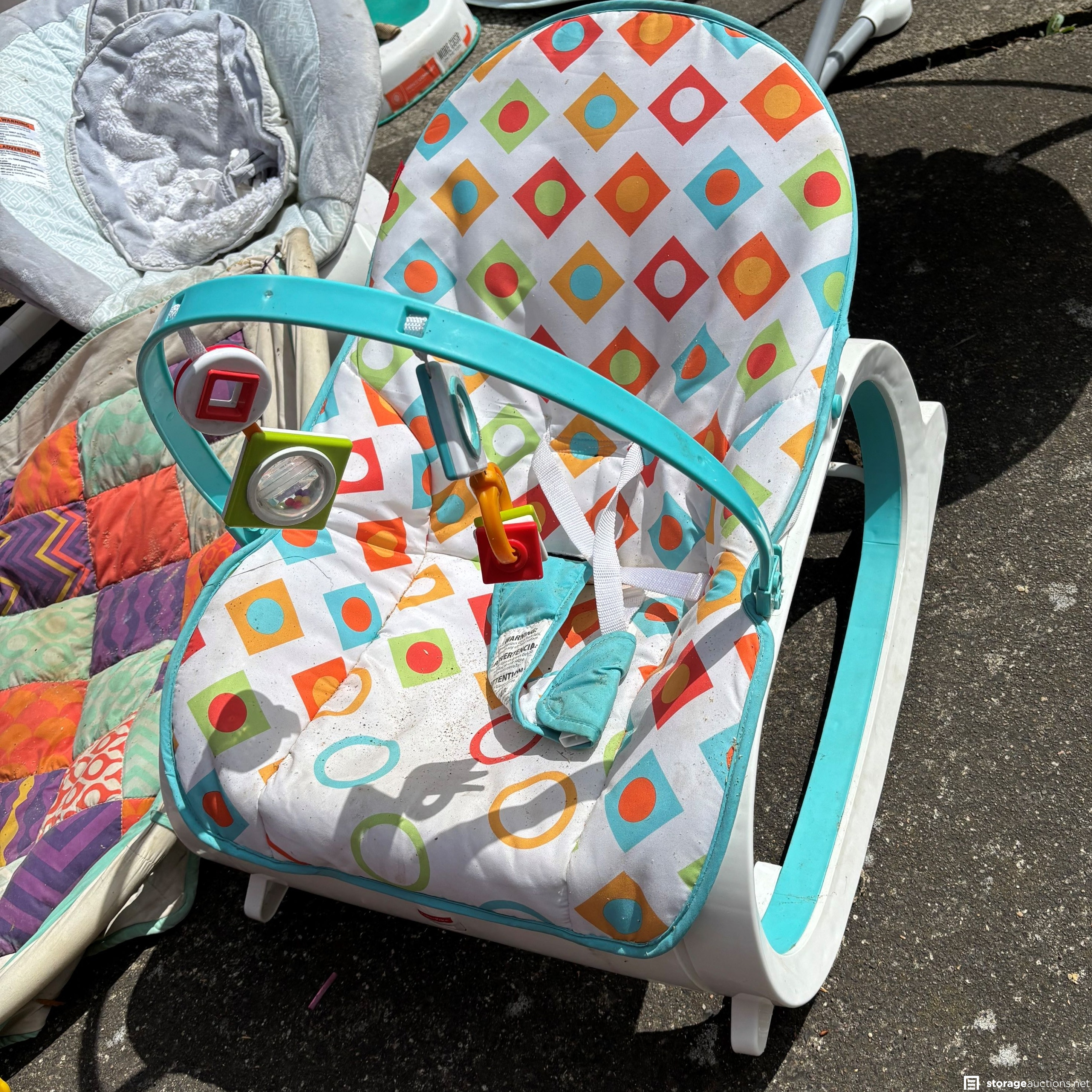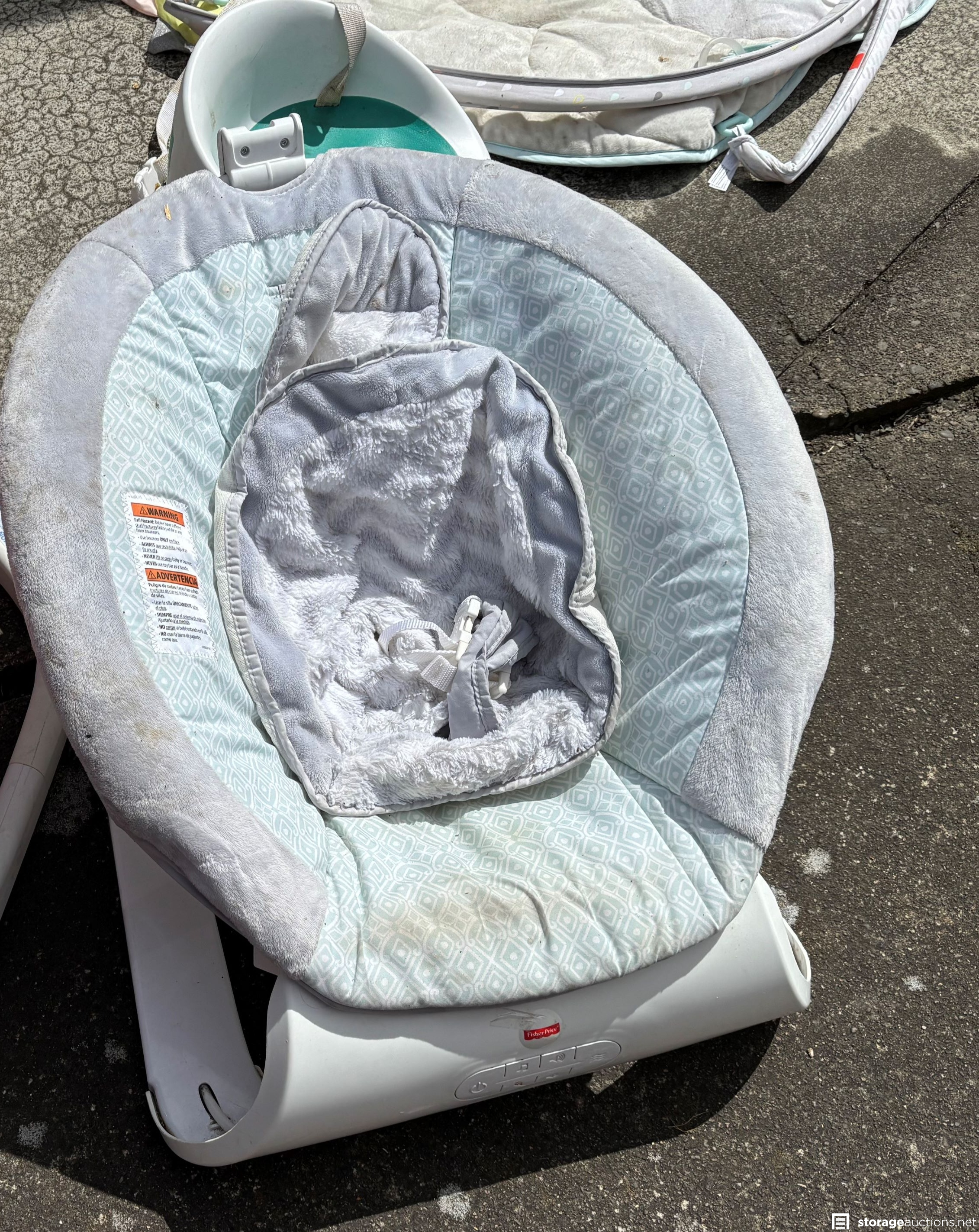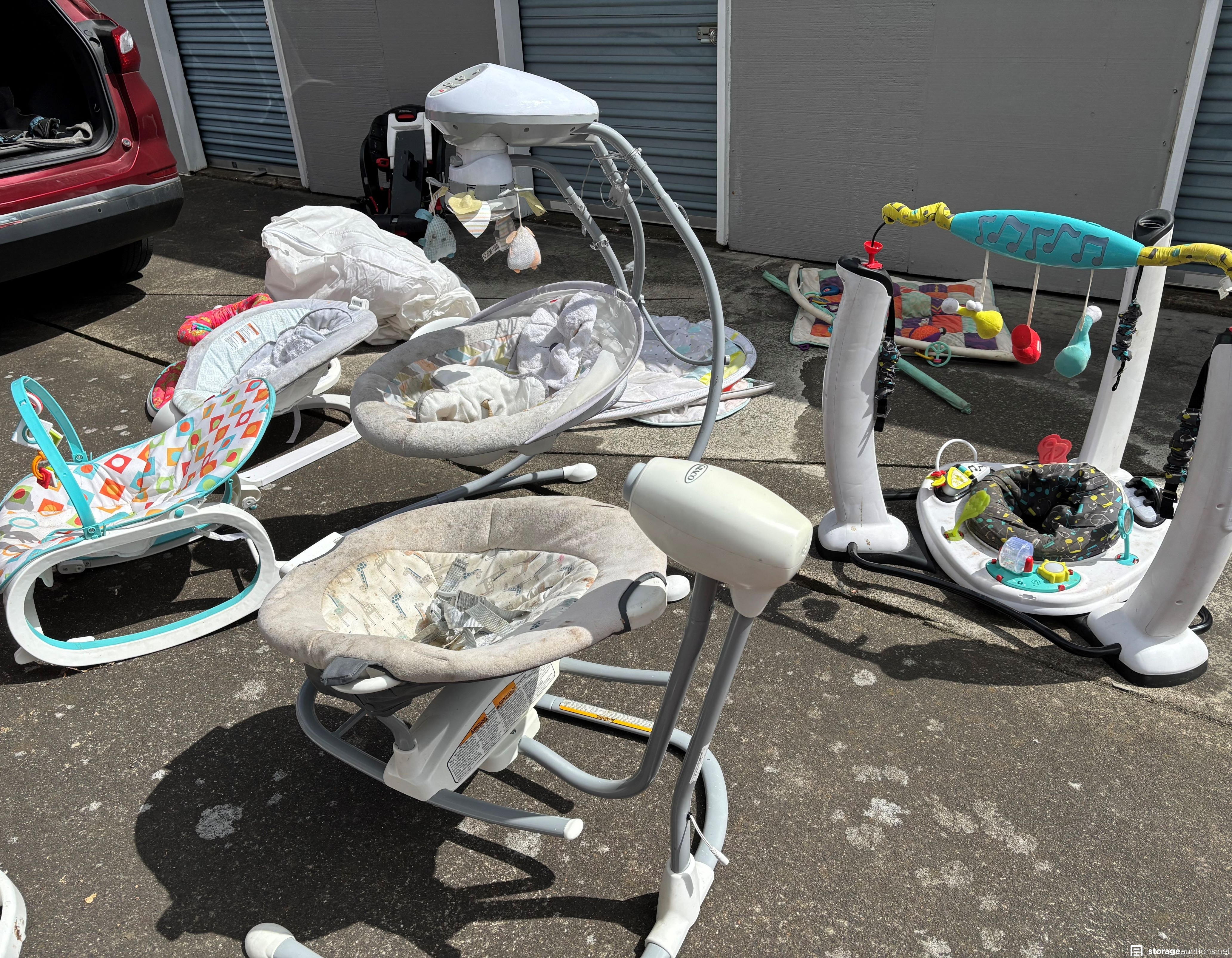 Unit appears to contain,, baby swing, baby seats, playmats, baby gate, kids taco truck, stroller, baby bouncer, blow up ball pit with balls, 2 boxes of stuffed toys, dolls, boy and girl toys
