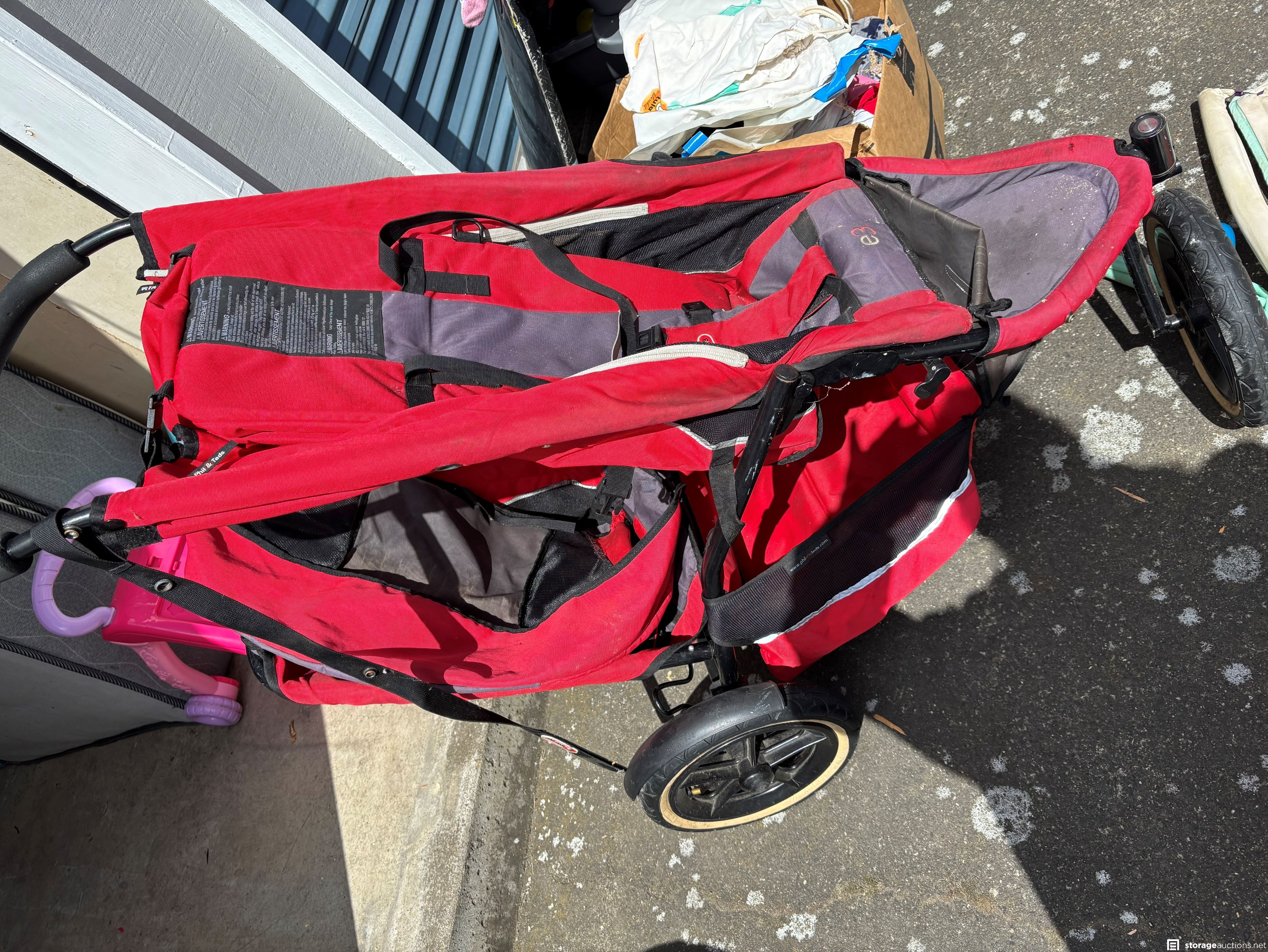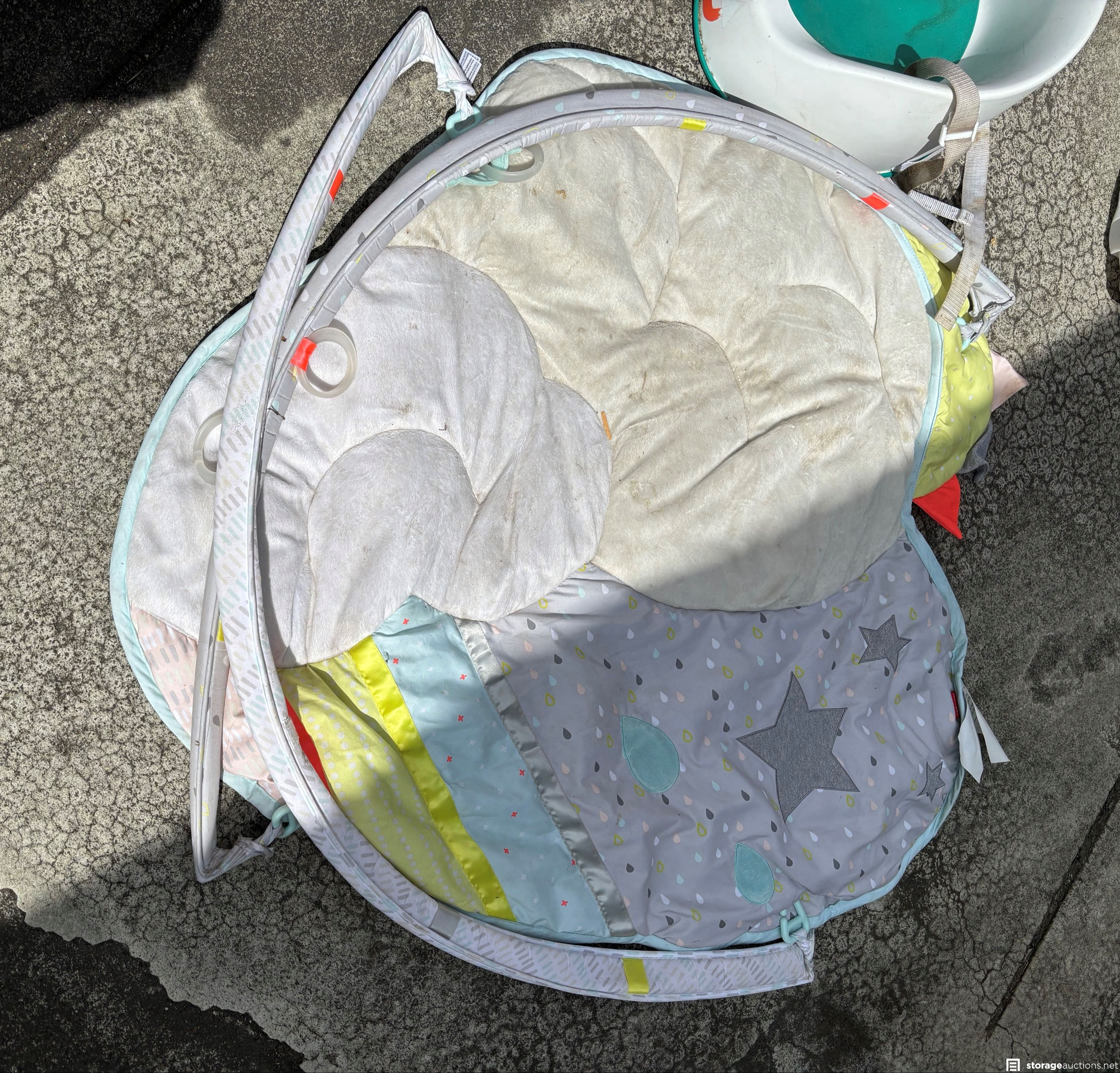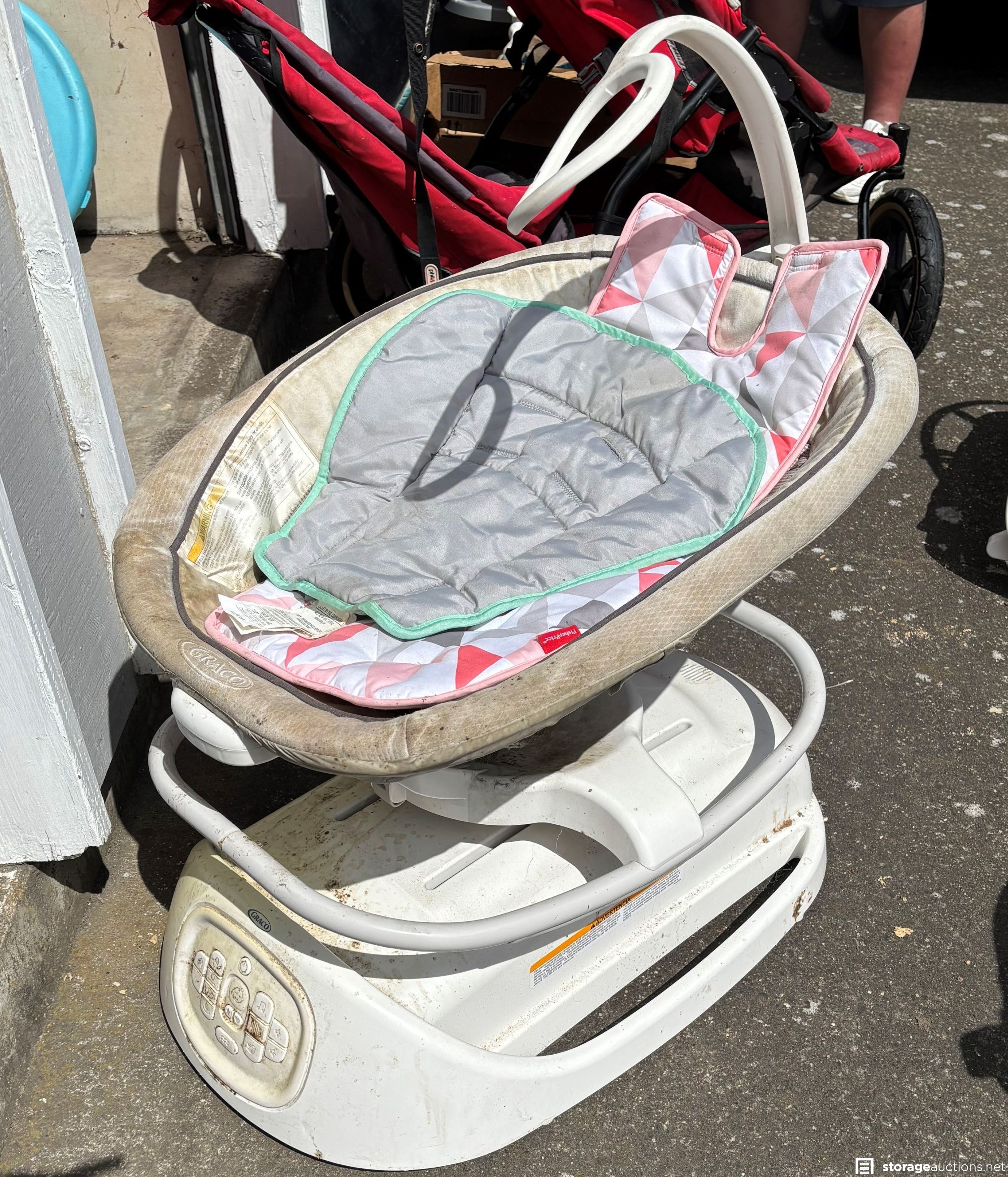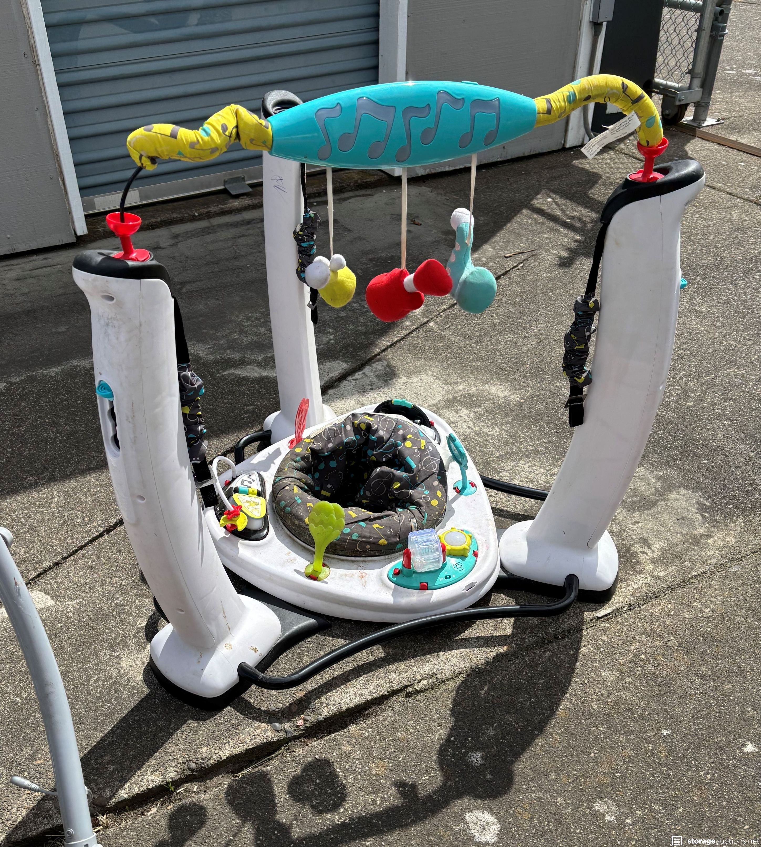 Unit appears to contain,, baby swing, baby seats, playmats, baby gate, kids taco truck, stroller, baby bouncer, blow up ball pit with balls, 2 boxes of stuffed toys, dolls, boy and girl toys