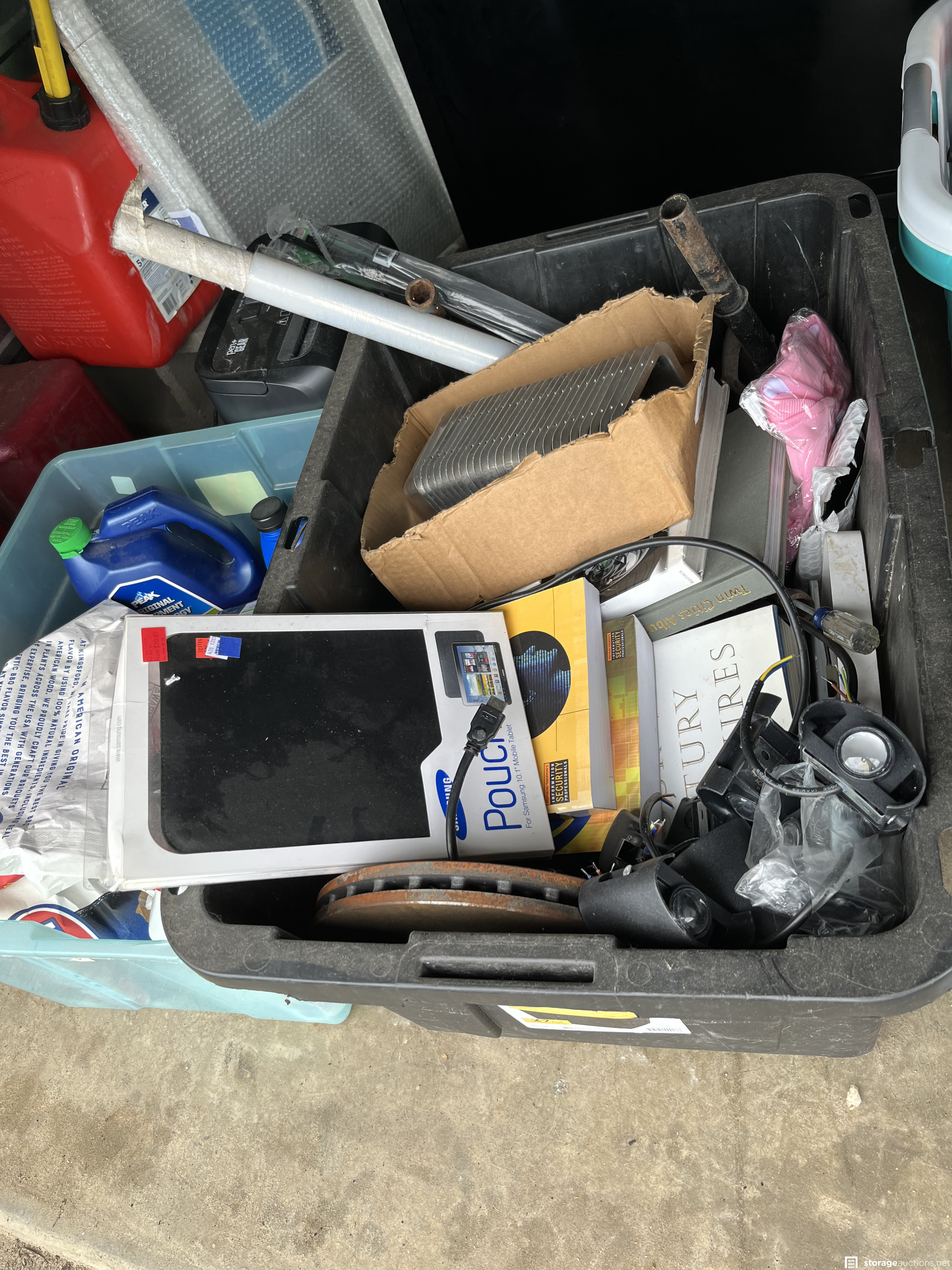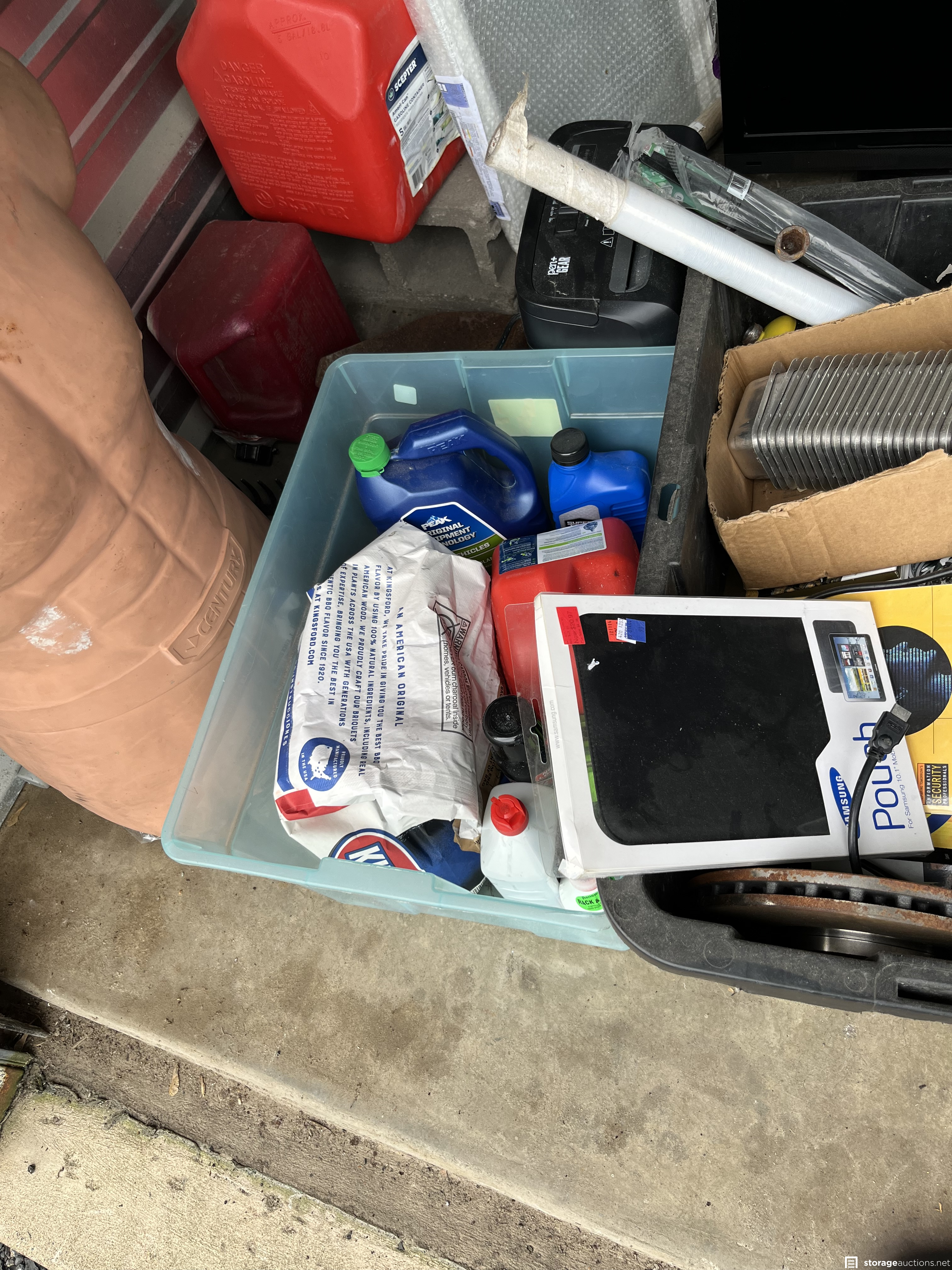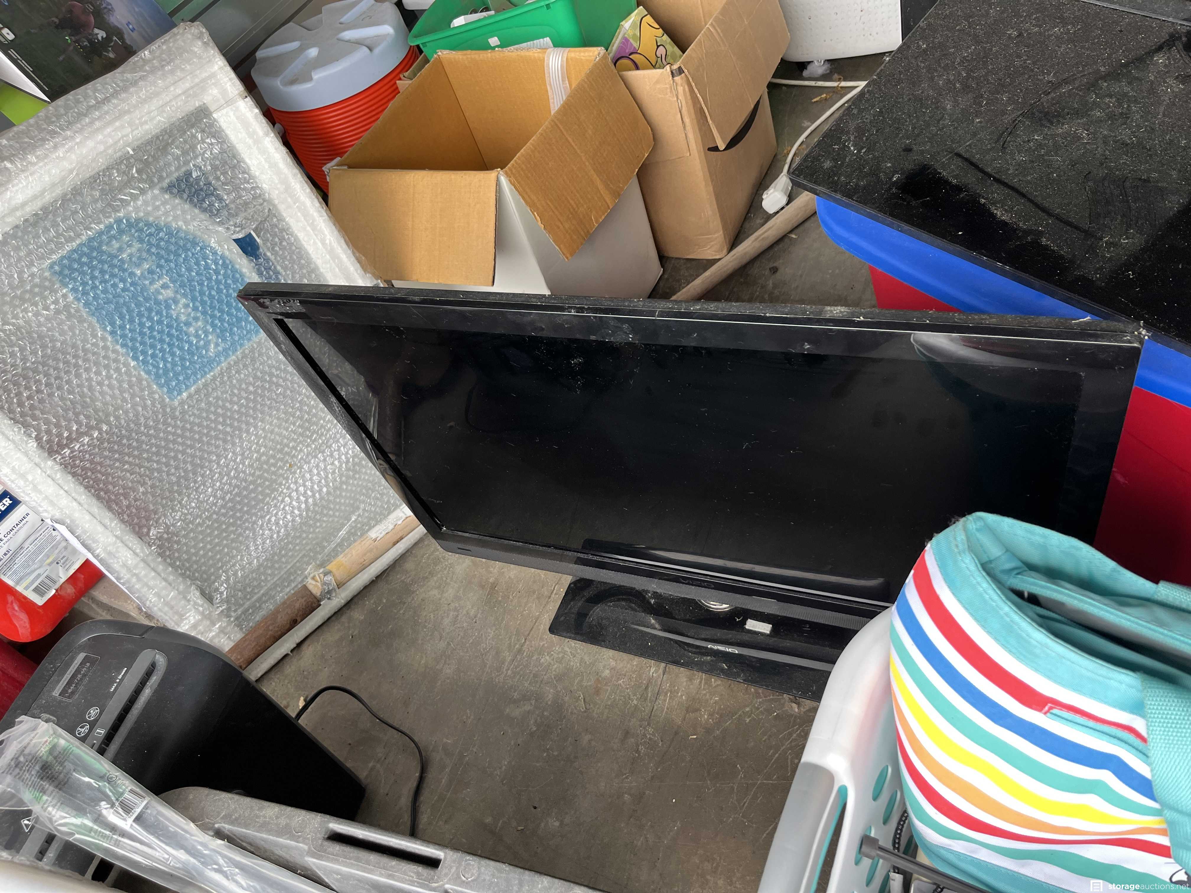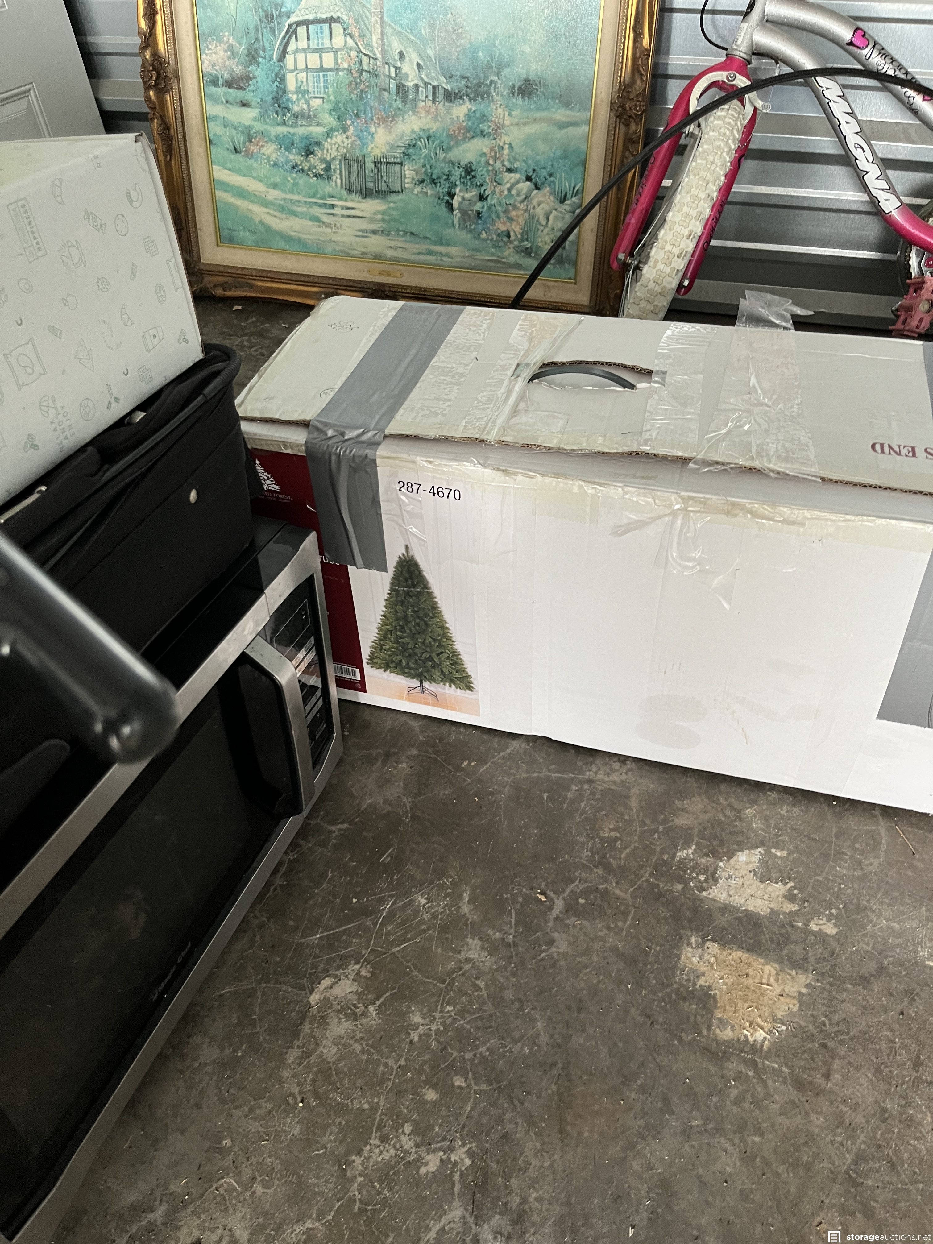 Flat screen tv, garbage can, floor rug, ironing board, charcoal, laundry basket, helicopter, Pokémon cards, paper shredder, Christmas tree, Century boxing dummy, new in package window, wall clock, door, framed artwork, window air conditioner, weed eater, Christmas Decor, gas cans, collector plates with boxes, Brother printer, typewriter, printer, kids bike, 6’ aluminum ladder, portable air conditioner