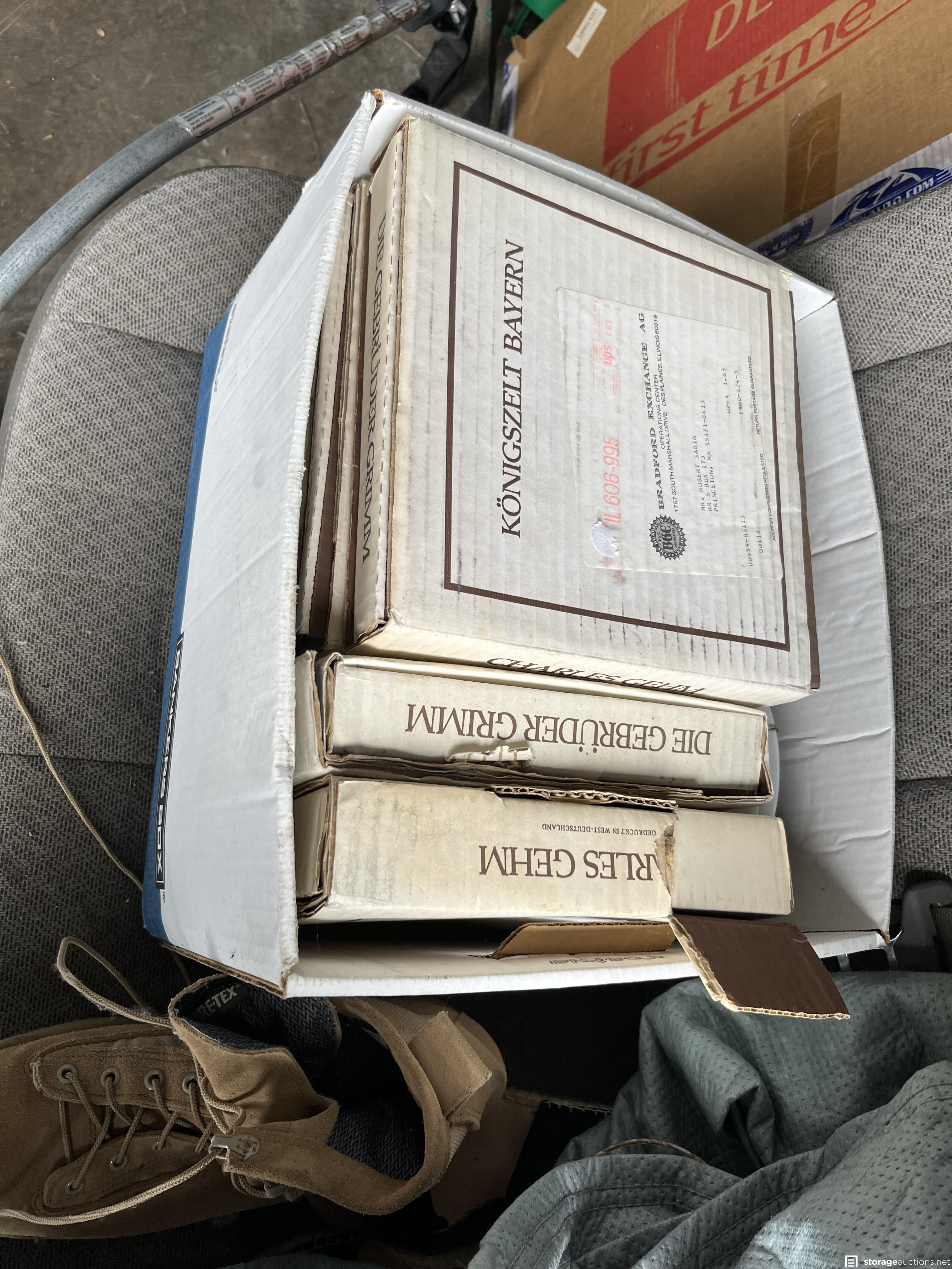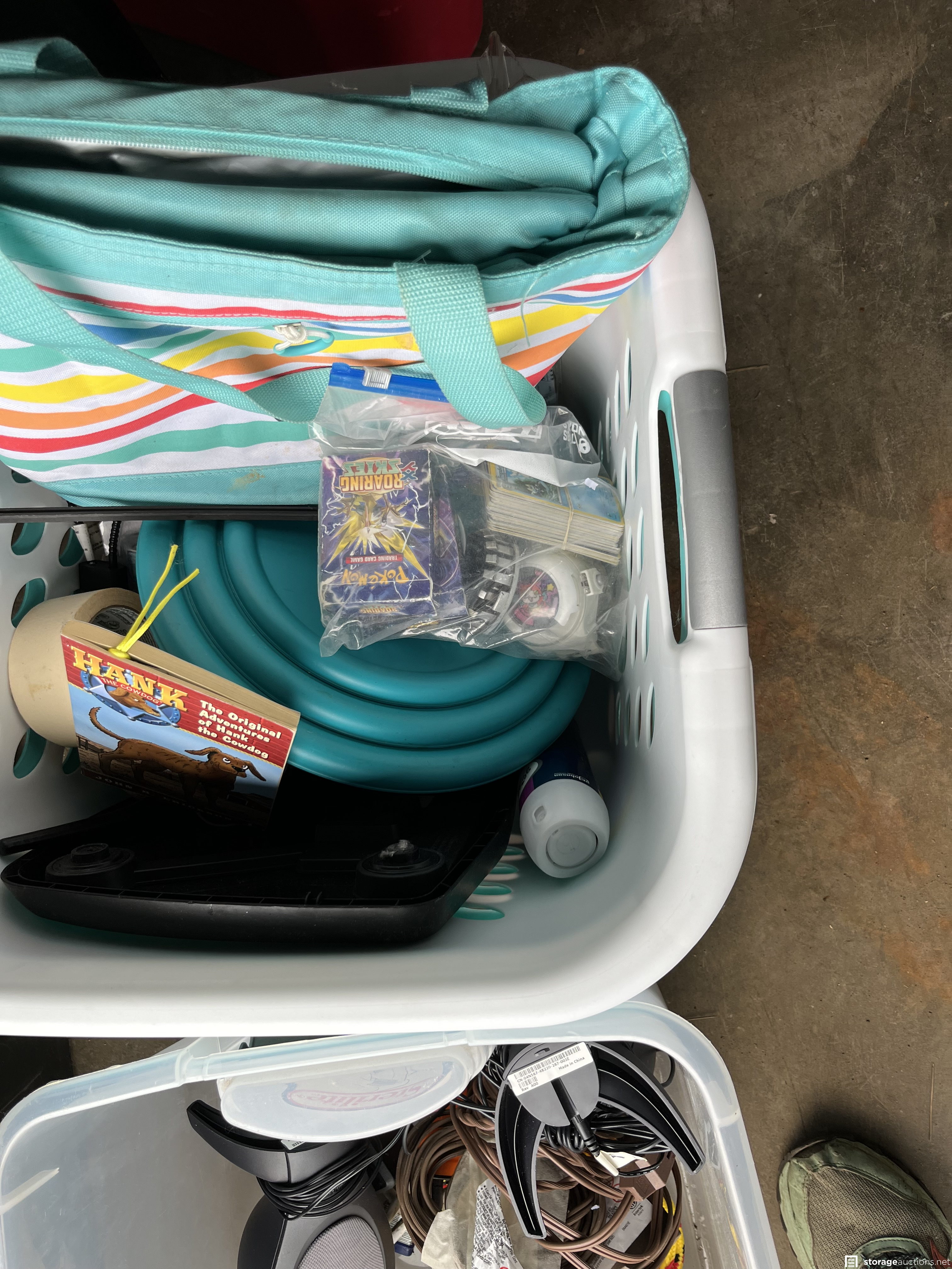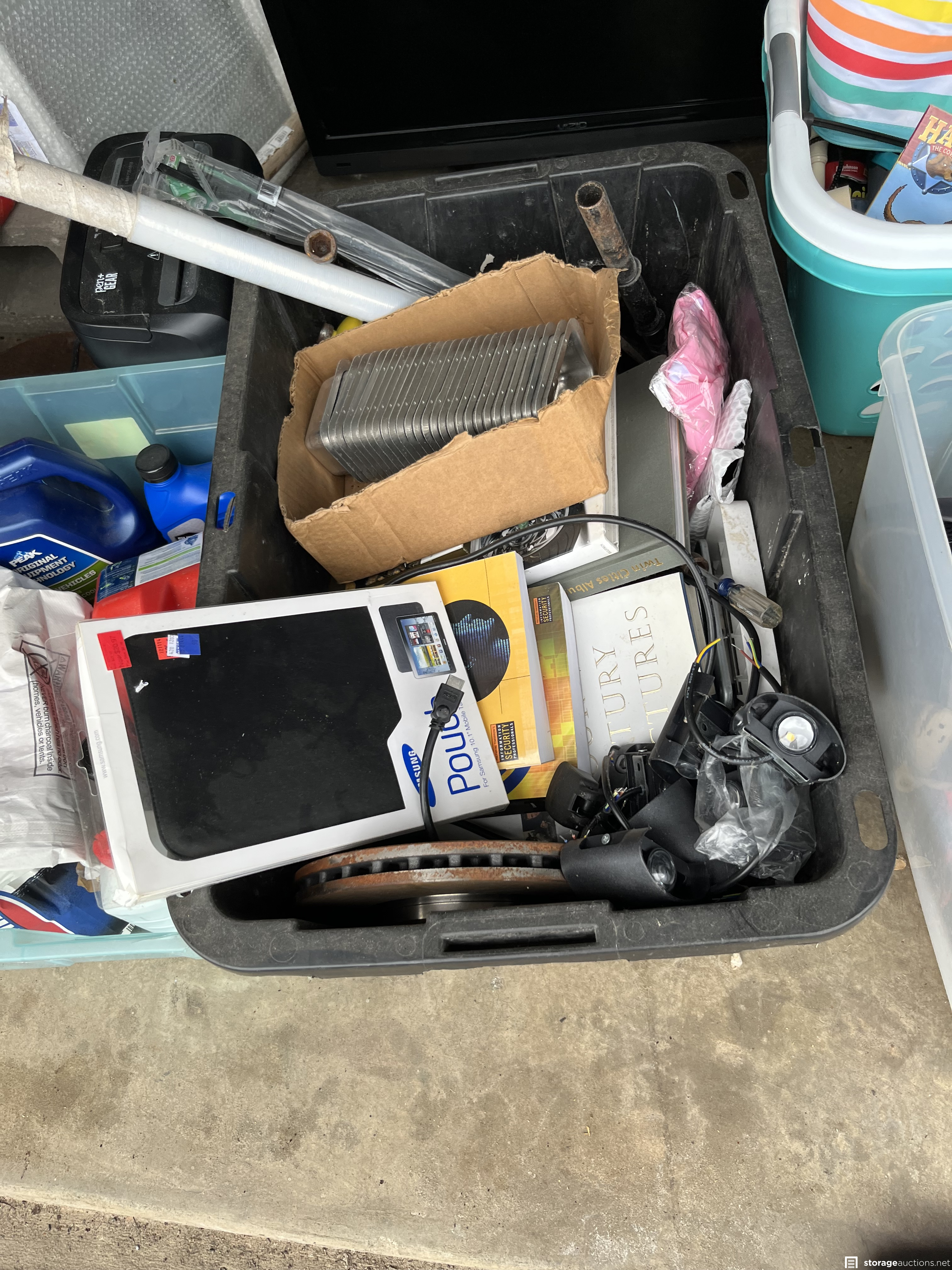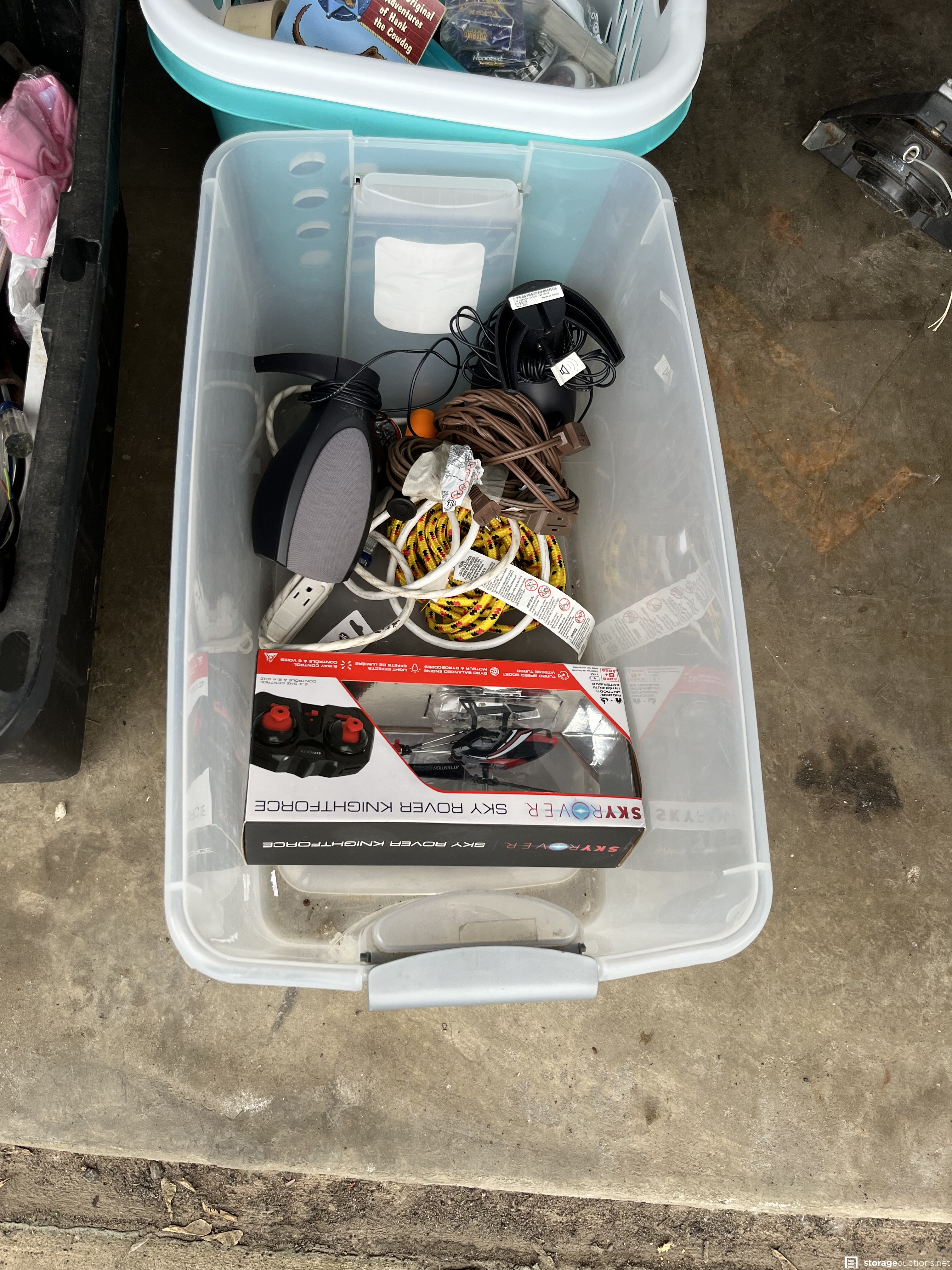 Flat screen tv, garbage can, floor rug, ironing board, charcoal, laundry basket, helicopter, Pokémon cards, paper shredder, Christmas tree, Century boxing dummy, new in package window, wall clock, door, framed artwork, window air conditioner, weed eater, Christmas Decor, gas cans, collector plates with boxes, Brother printer, typewriter, printer, kids bike, 6’ aluminum ladder, portable air conditioner
